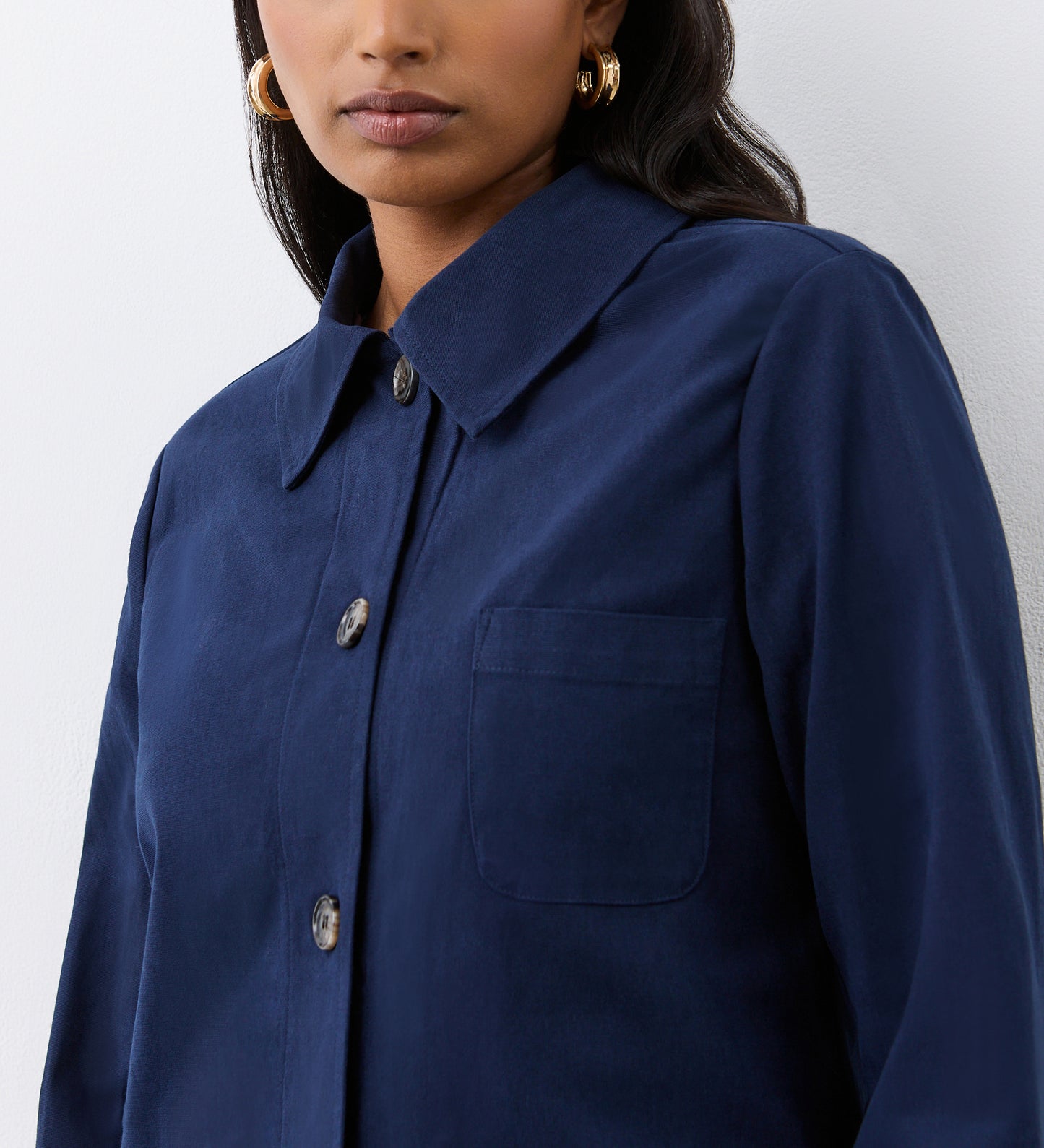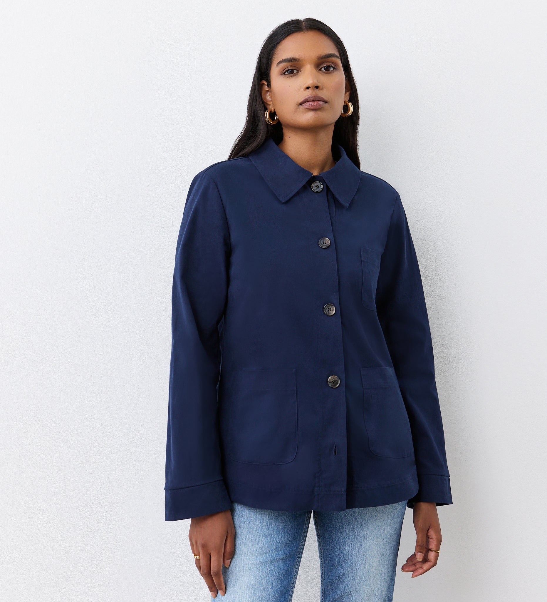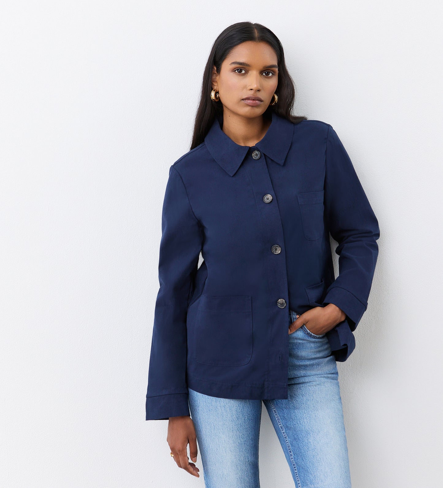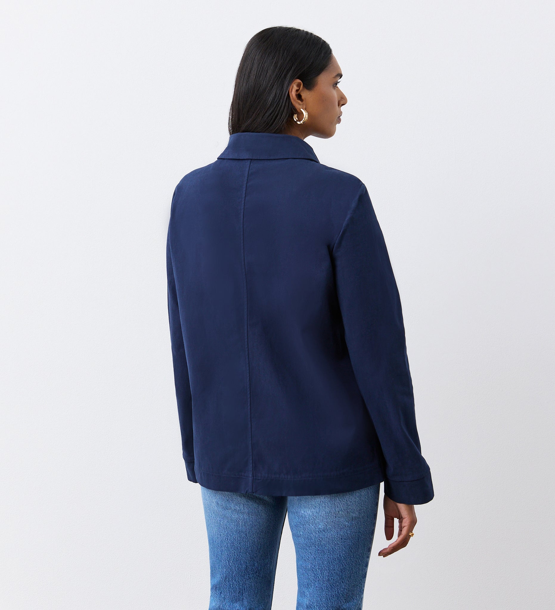 A lightweight jacket for transitional weather is a wardrobe necessity. Grayson features front buttons, three pockets, and gorgeous collar and cuff detailing. Layer Grayson over a dress or pair with trousers and a plain t-shirt.