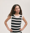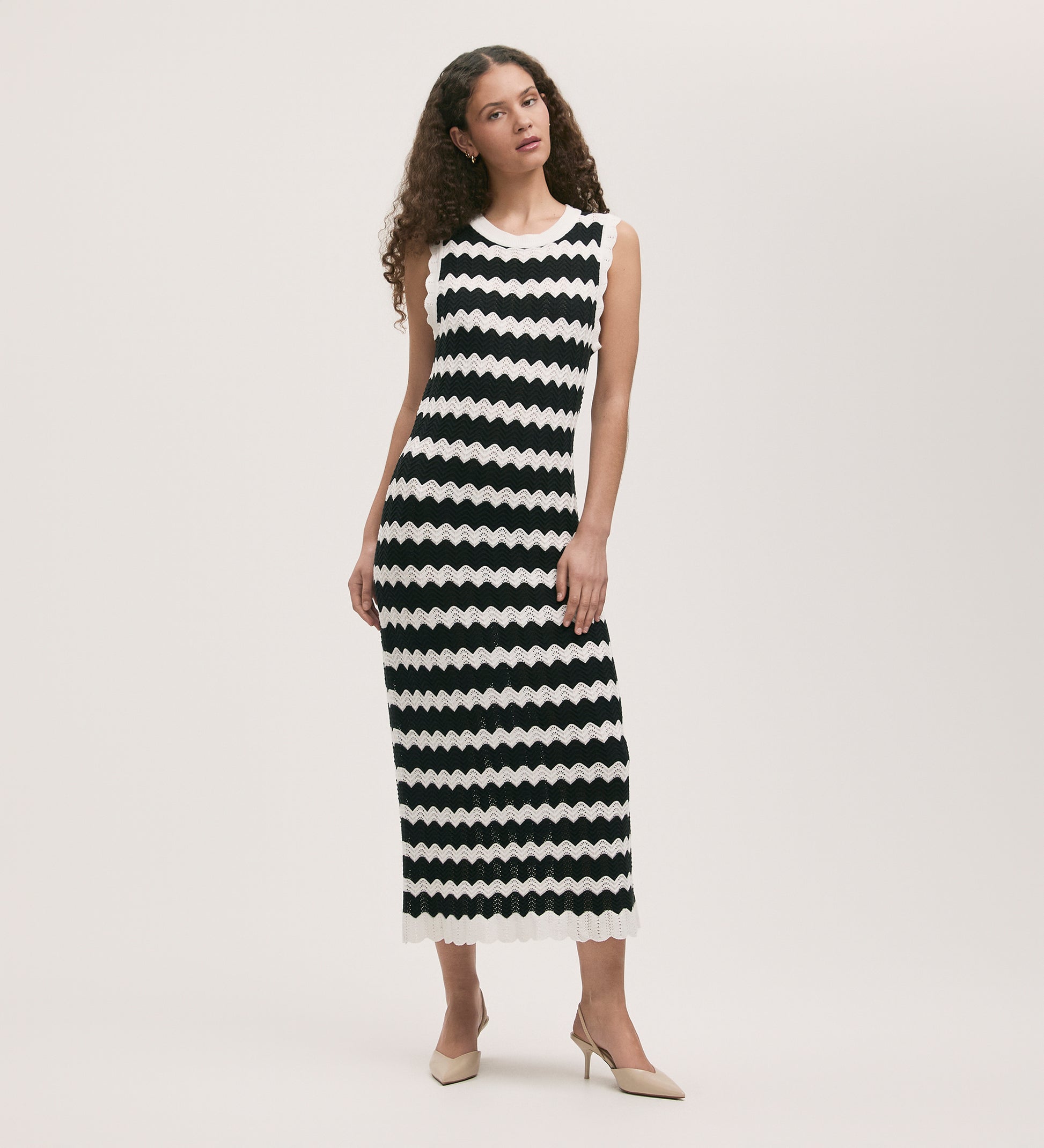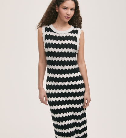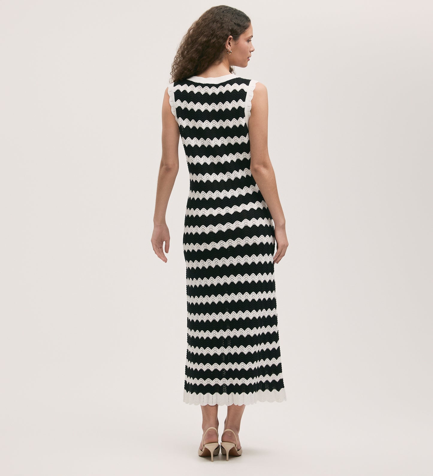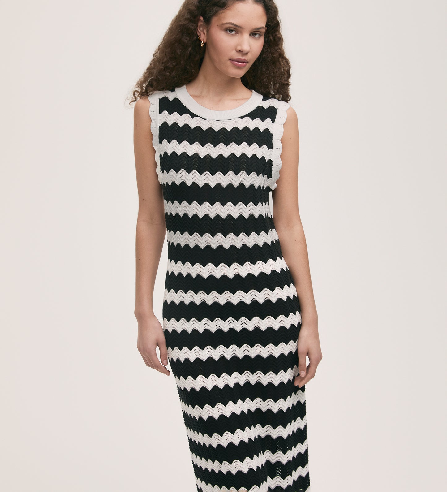 We love this black and white zig-zag striped design on our sleeveless crochet midi dress, Gretta. She also features a crew neck and scallop detail at the arms and hemline.