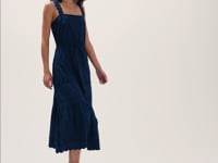 Crafted from cotton poplin, Hallie is a red strappy tiered midi dress with cotton ric rac detail and a button-down front. She also features a tiered skirt and an adjustable drawstring waist for a figure-flattering fit.