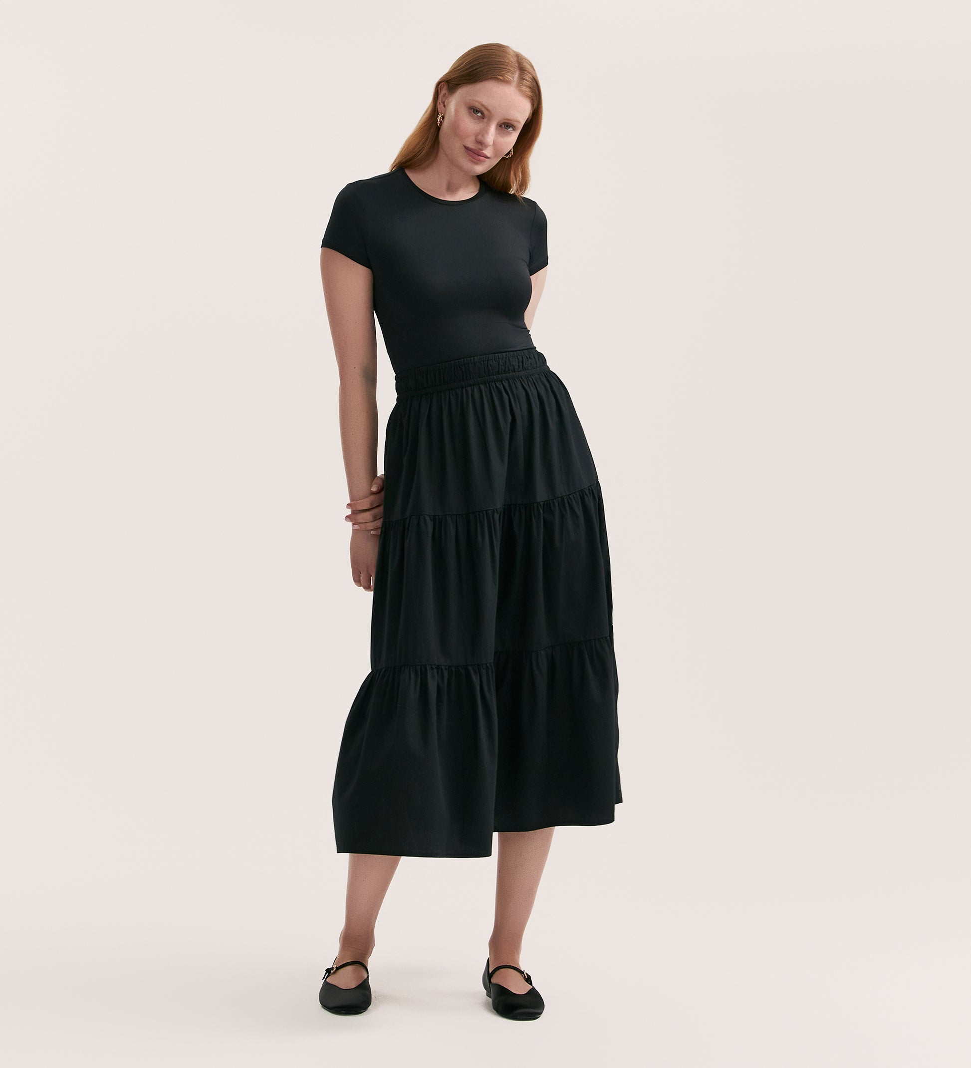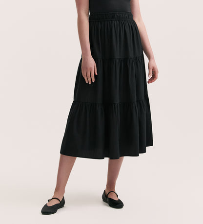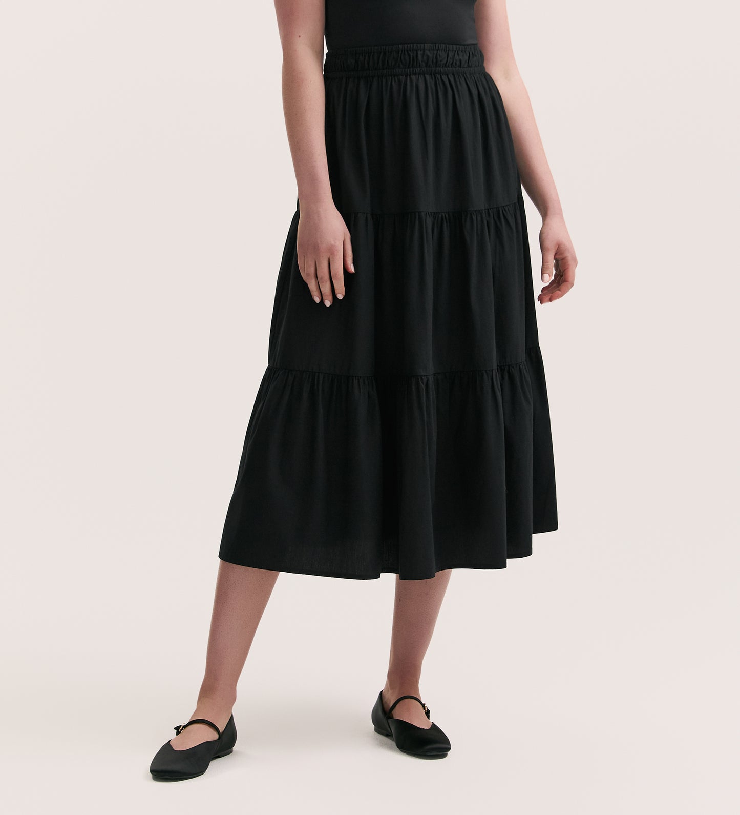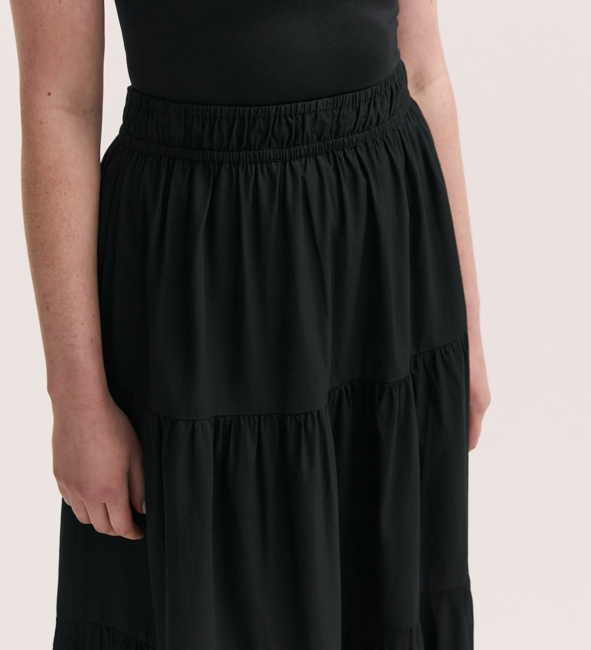 Harleen is the perfect everyday black tiered midi skirt and a versatile addition for every wardrobe. Crafted from cotton, with an elasticated waistband, she's both comfortable and stylish.