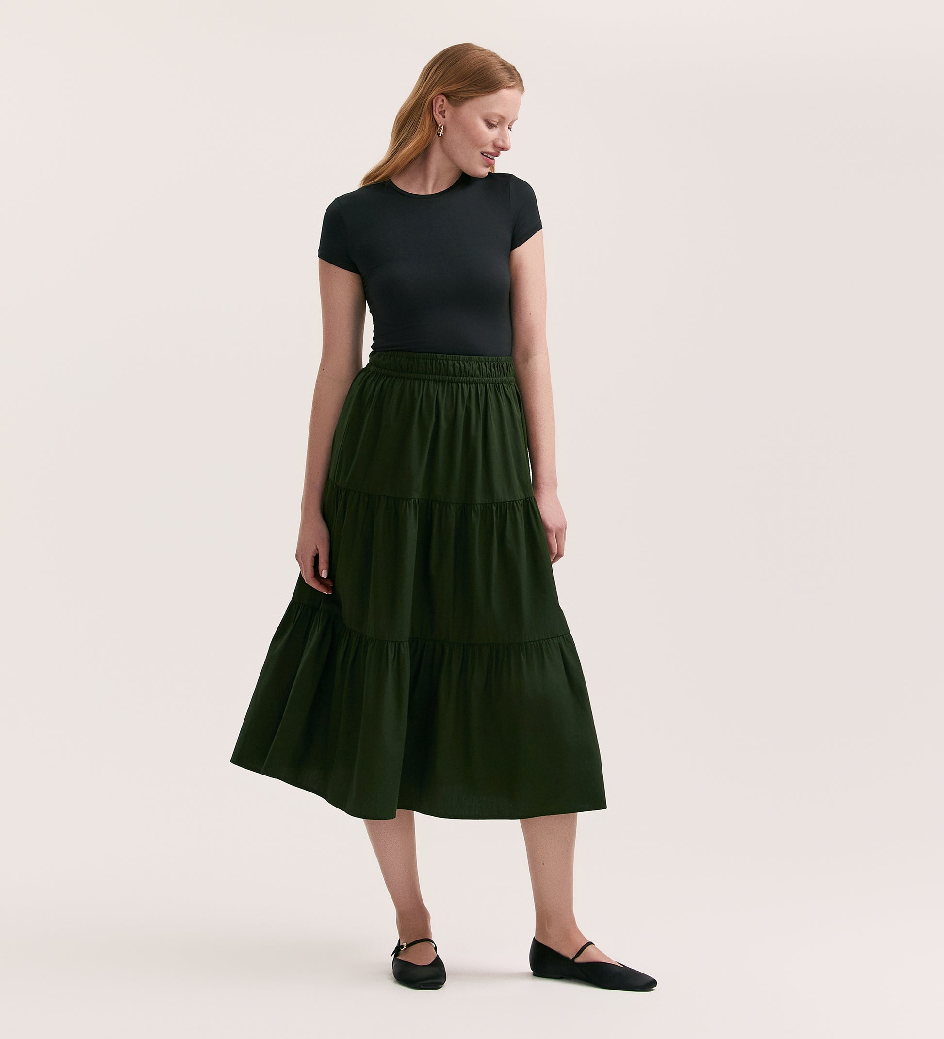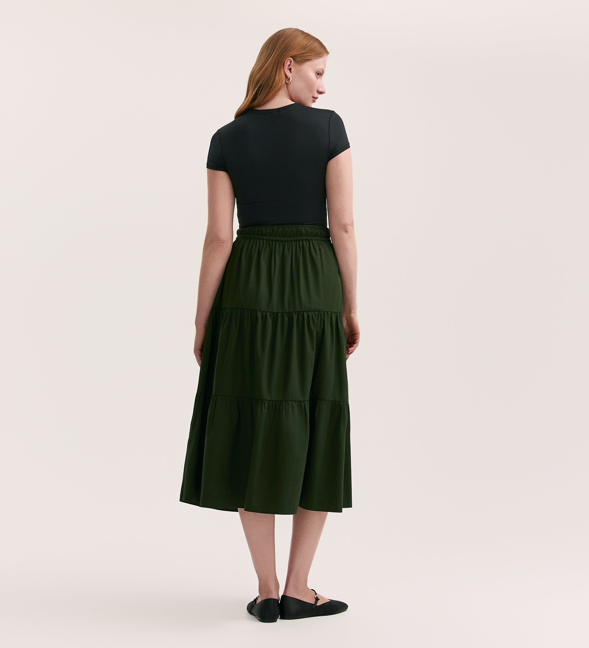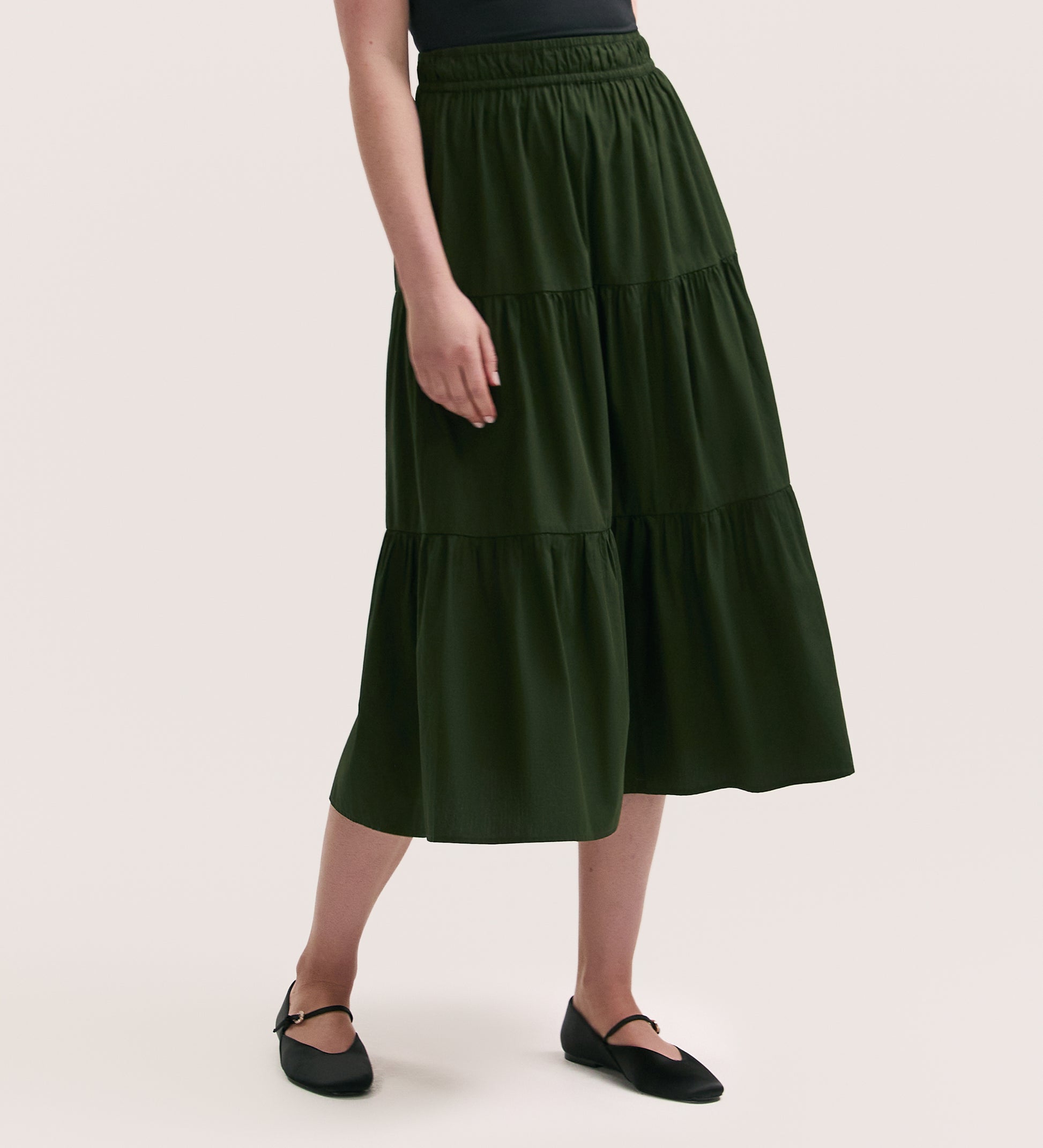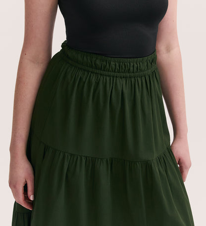 Harleen is the perfect everyday dark khaki tiered midi skirt and a versatile addition for every wardrobe. Crafted from cotton, with an elasticated waistband, she's both comfortable and stylish.