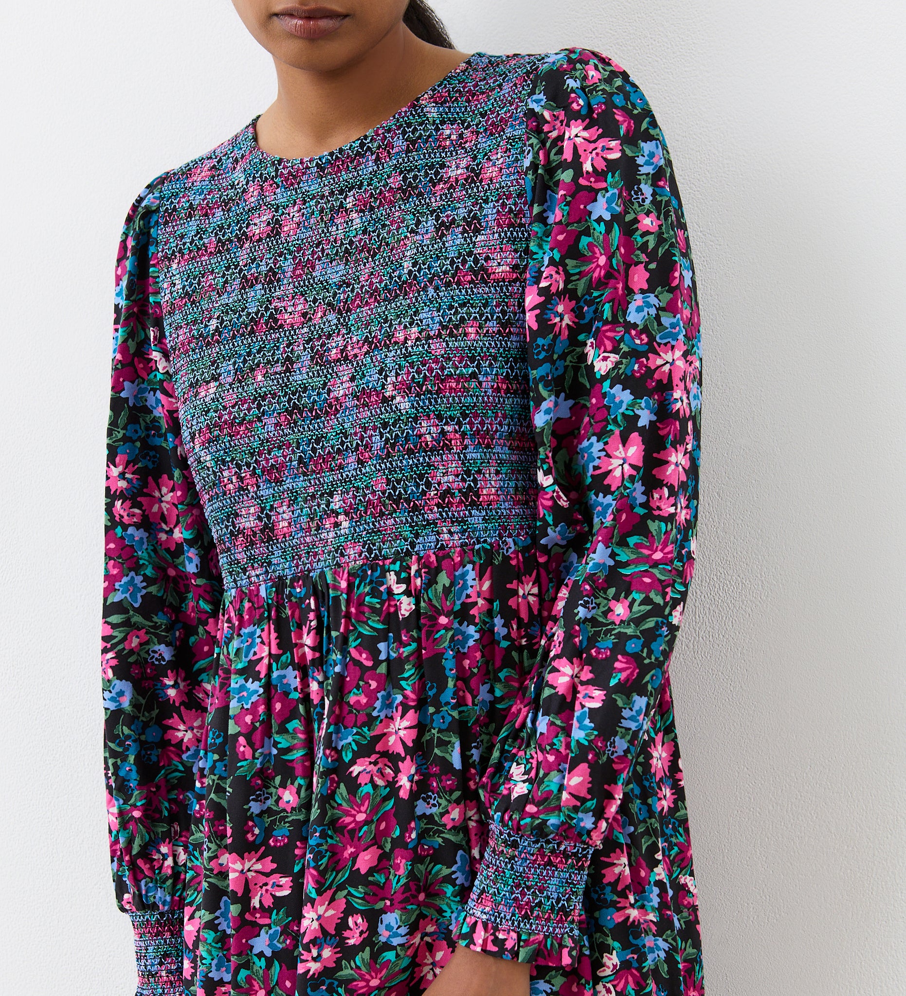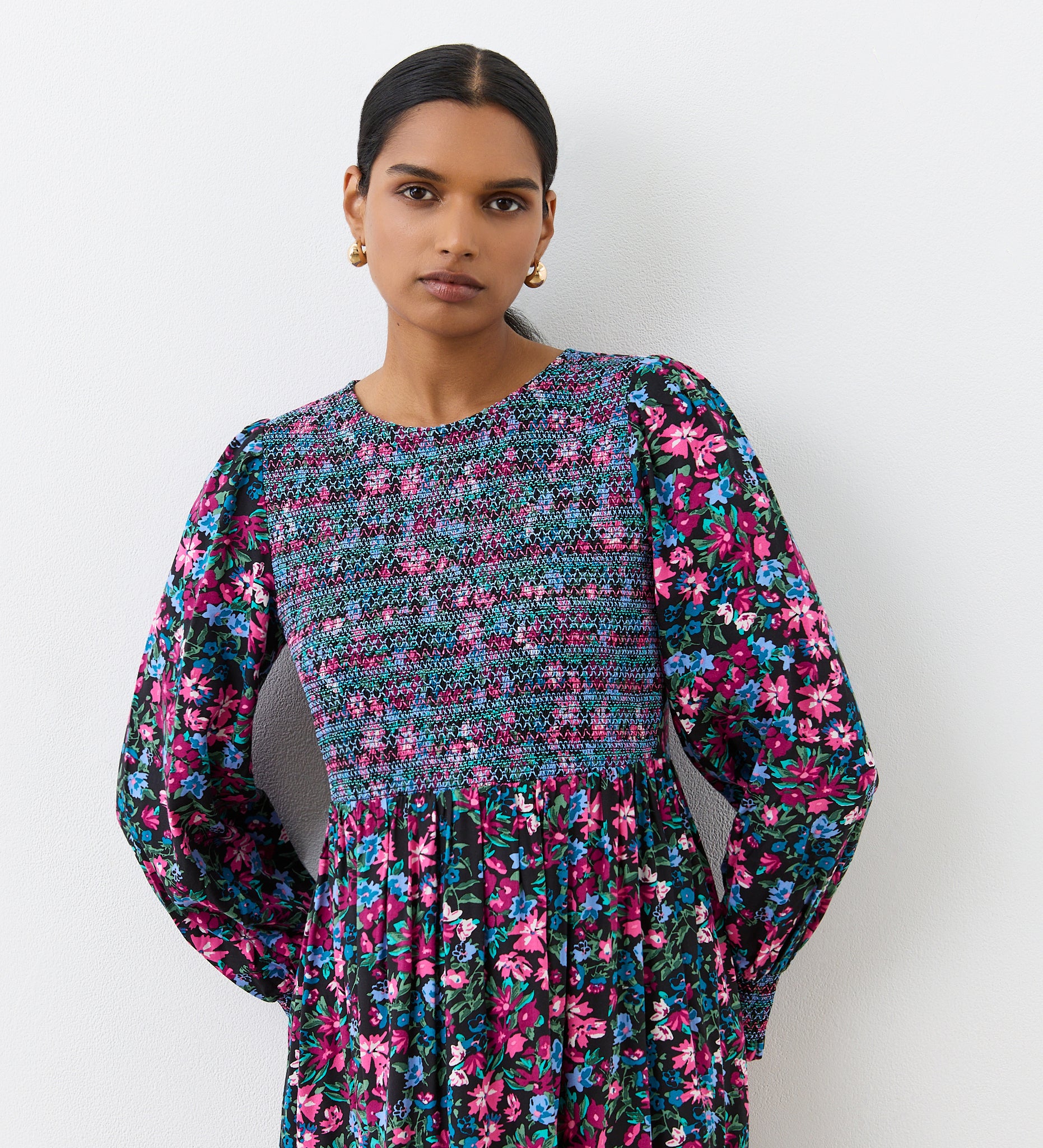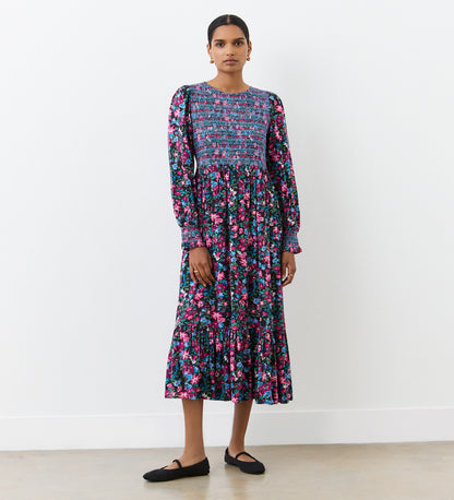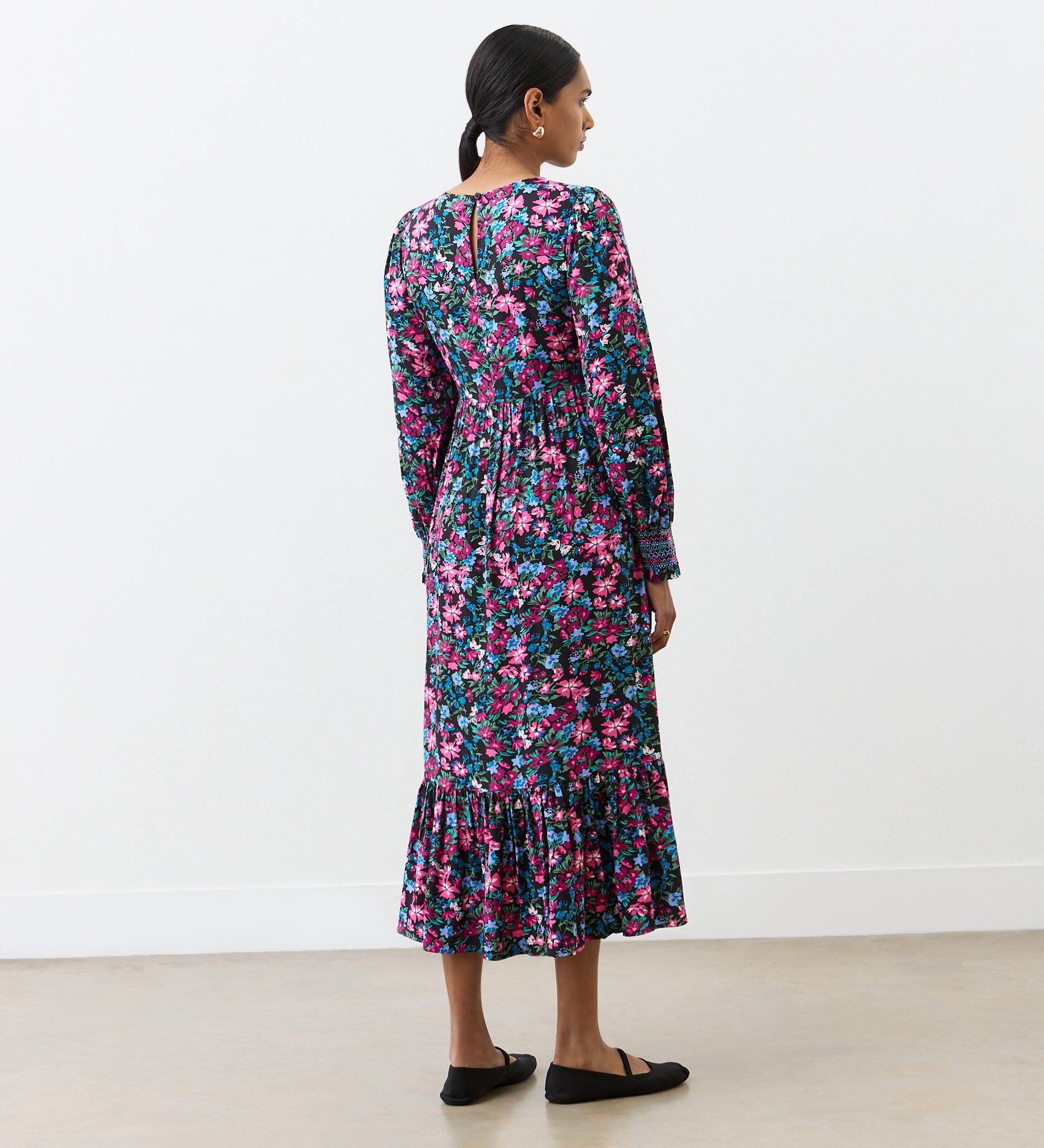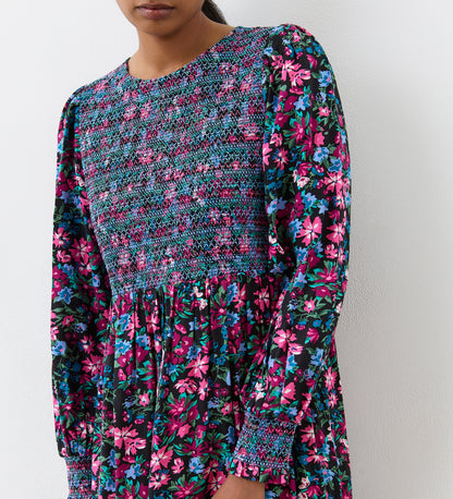 Introducing Isha, a pink floral midi dress that blends timeless elegance and contemporary charm. Isha features a shirred bodice with matching cuff detail. The tiered hem adds a playful touch, while the long sleeves and round crew neck add sophistication. Whether you're heading to a formal event or a casual outing, Isha effortlessly combines style and grace, leaving a lasting impression wherever you go.