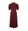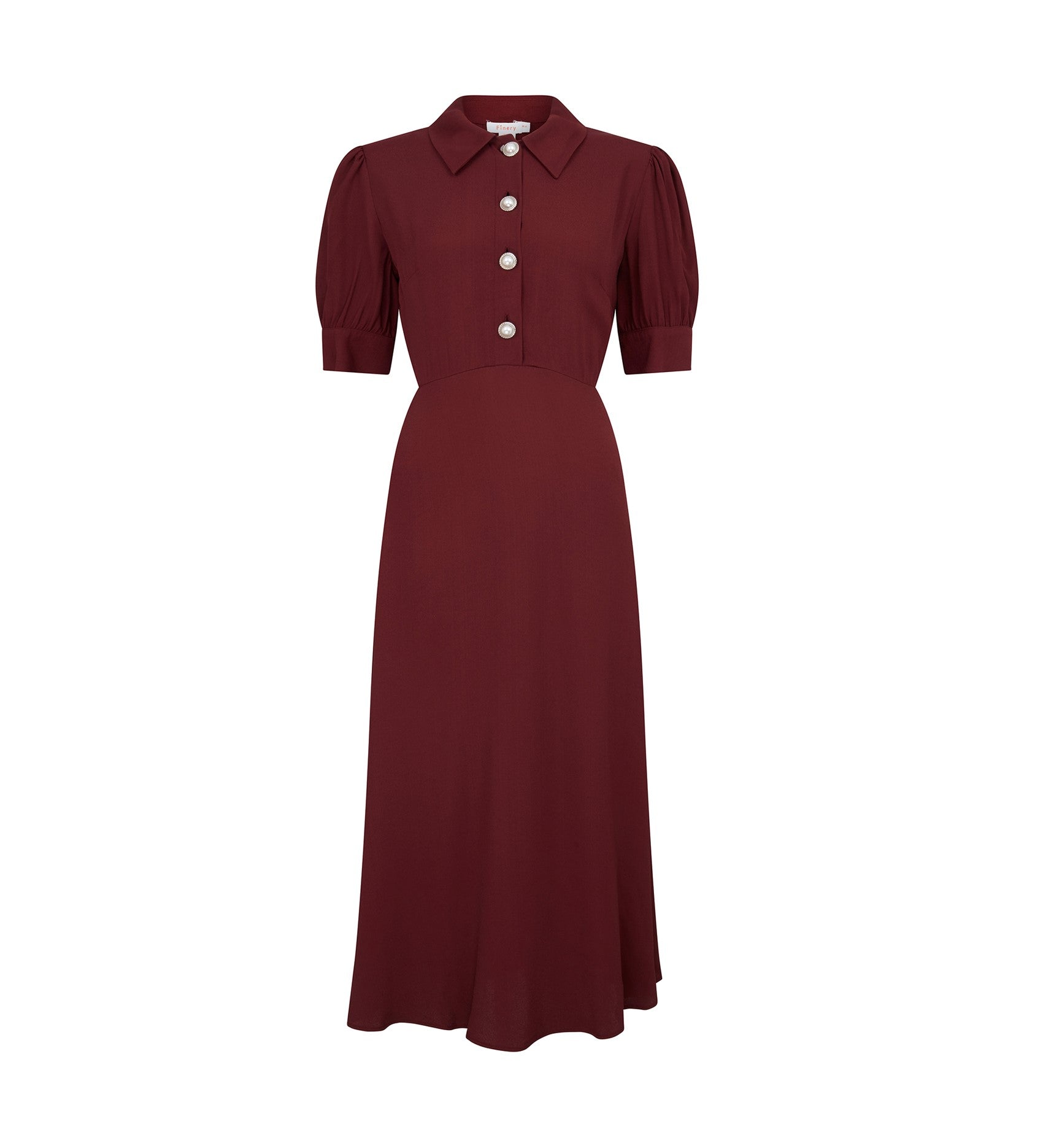 Semi-fitted and made from satin back crepe, our gorgeous burgundy Jaela dress is 70's inspired and perfect for your next social occasion. A classic shirt collar and buttoned through to the waist, the dress also features blouson elbow-length sleeves that add an on-trend twist to this classically beautiful style.