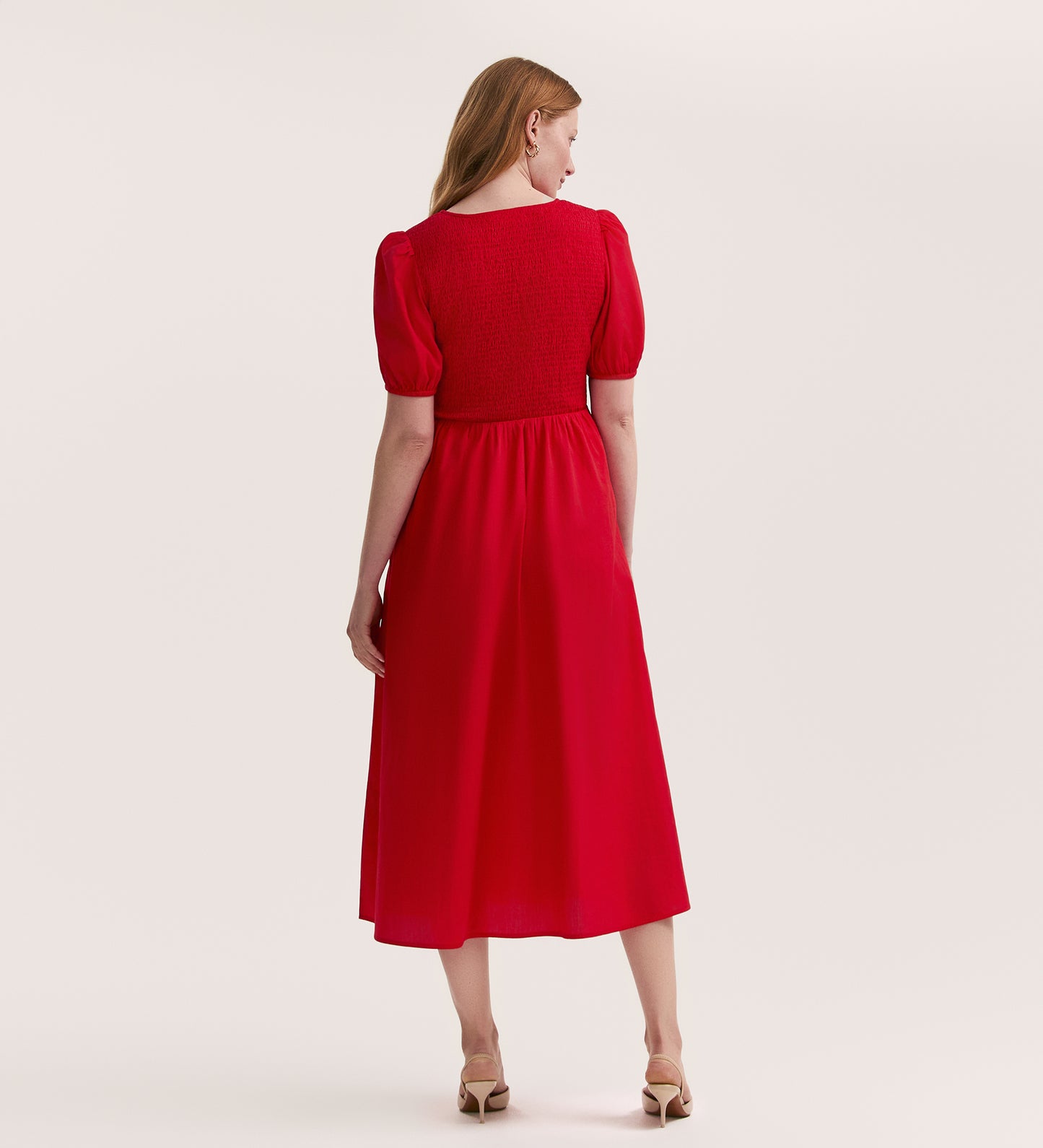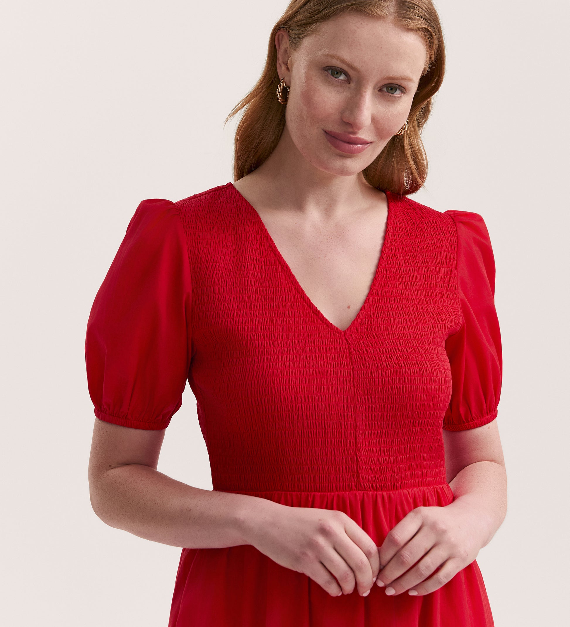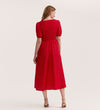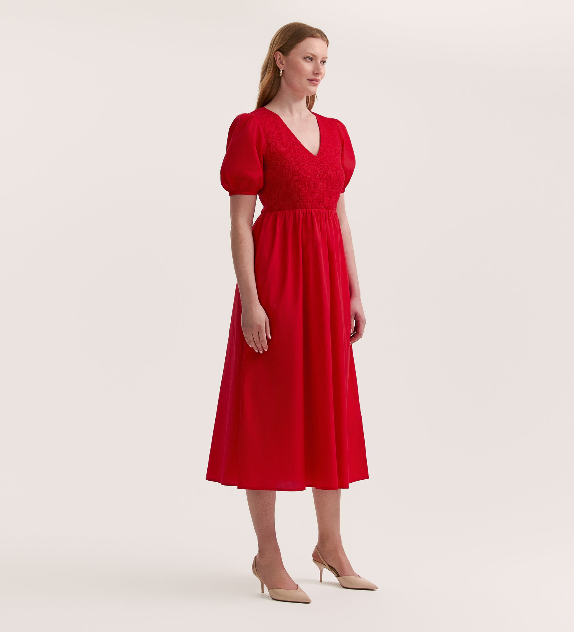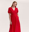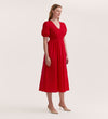 Crafted from cotton, Jamilla is a red v-neck midi dress with a flattering shirred bodice. She also features short puff sleeves with elasticated cuffs and pockets.