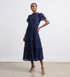 Crafted from lightweight georgette, Jane is a lined round-neck midi dress with textured polka dot detail. She also features a flattering empire seam waist, a tiered skirt and short elasticated-cuff sleeves. Note the on-trend ruffle detailing on both the neckline and cuffs.