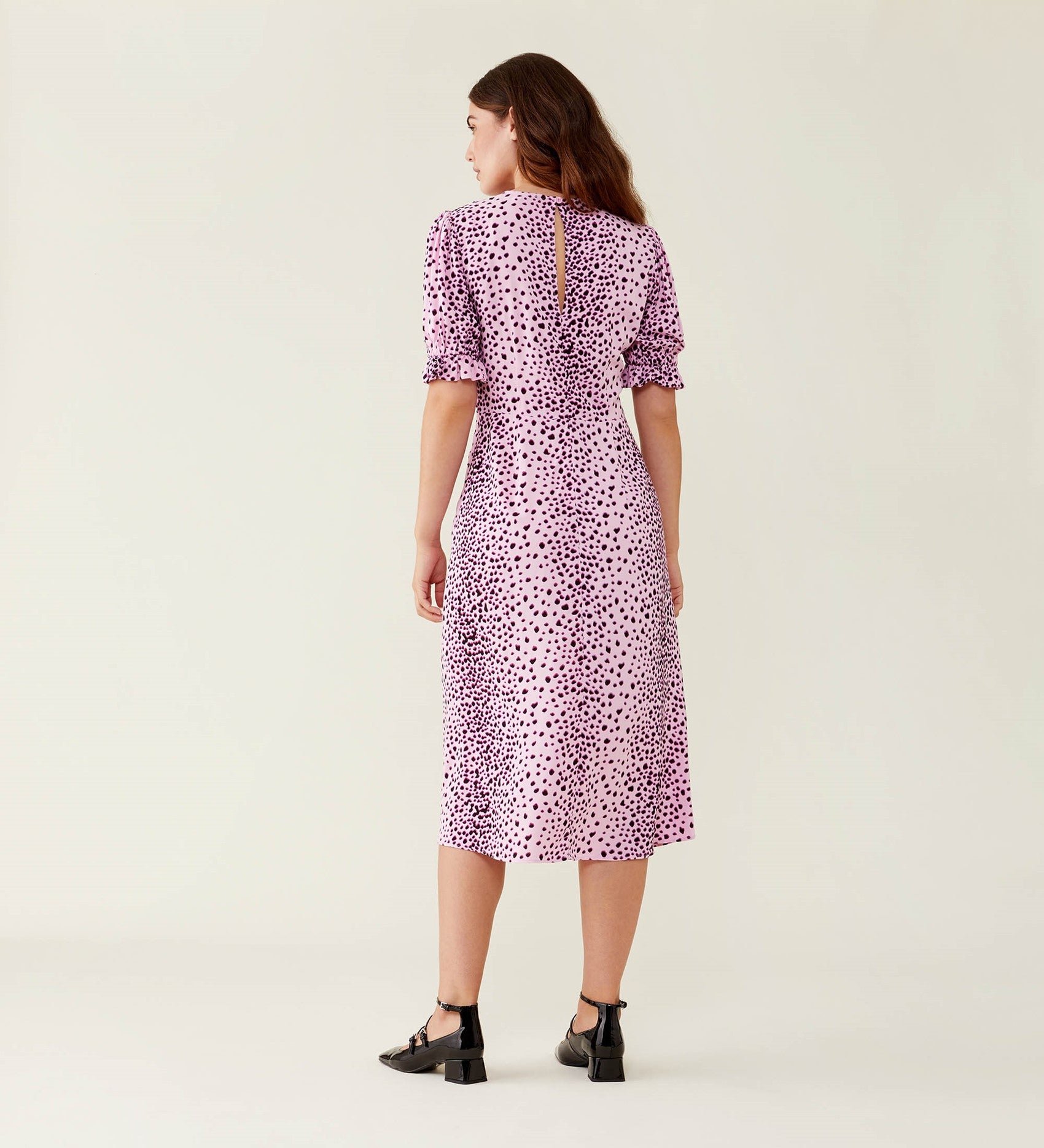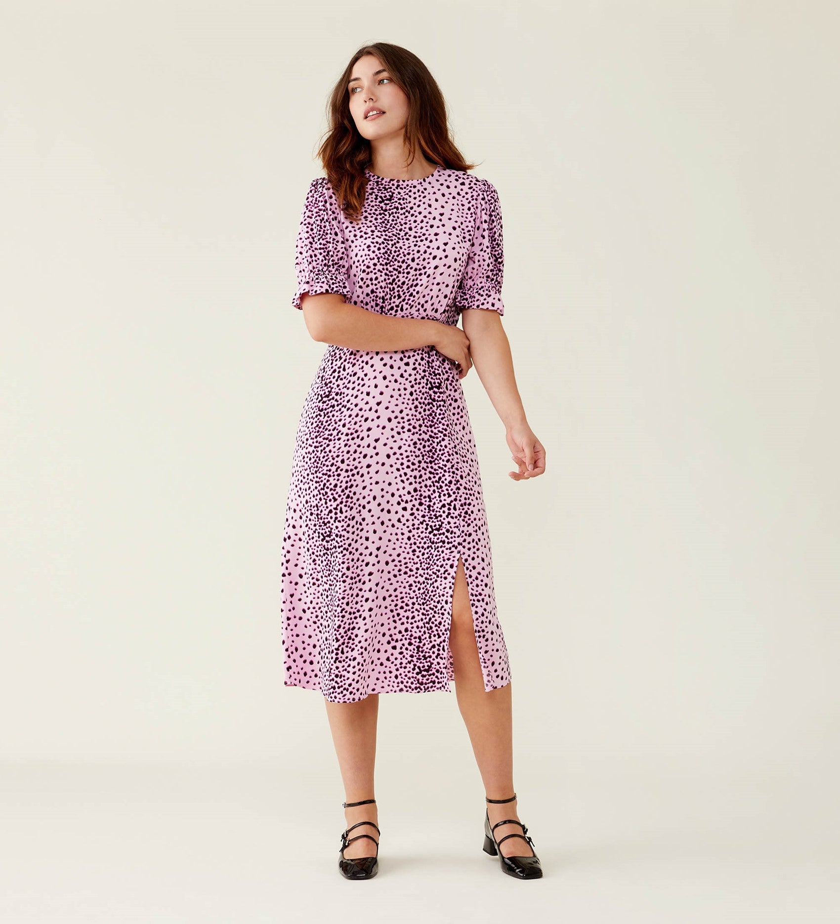 Jaylen is a classic midi dress with a sensual feminine twist thanks to its front split that shows just the right amount of leg. Crafted from Eco Vero Viscose in a much-loved pink animal colour, Jaylen has short sleeves with shirring cuff detail, as well as a keyhole rear fastening for easy dressing.