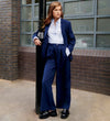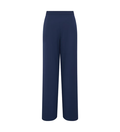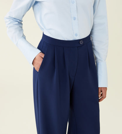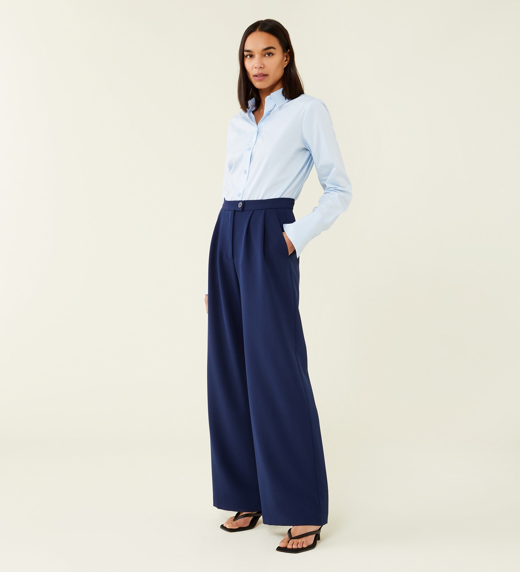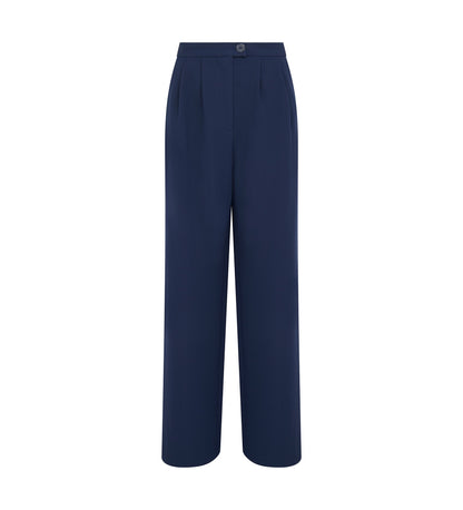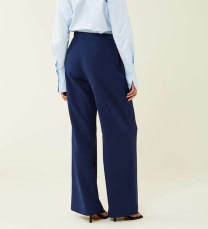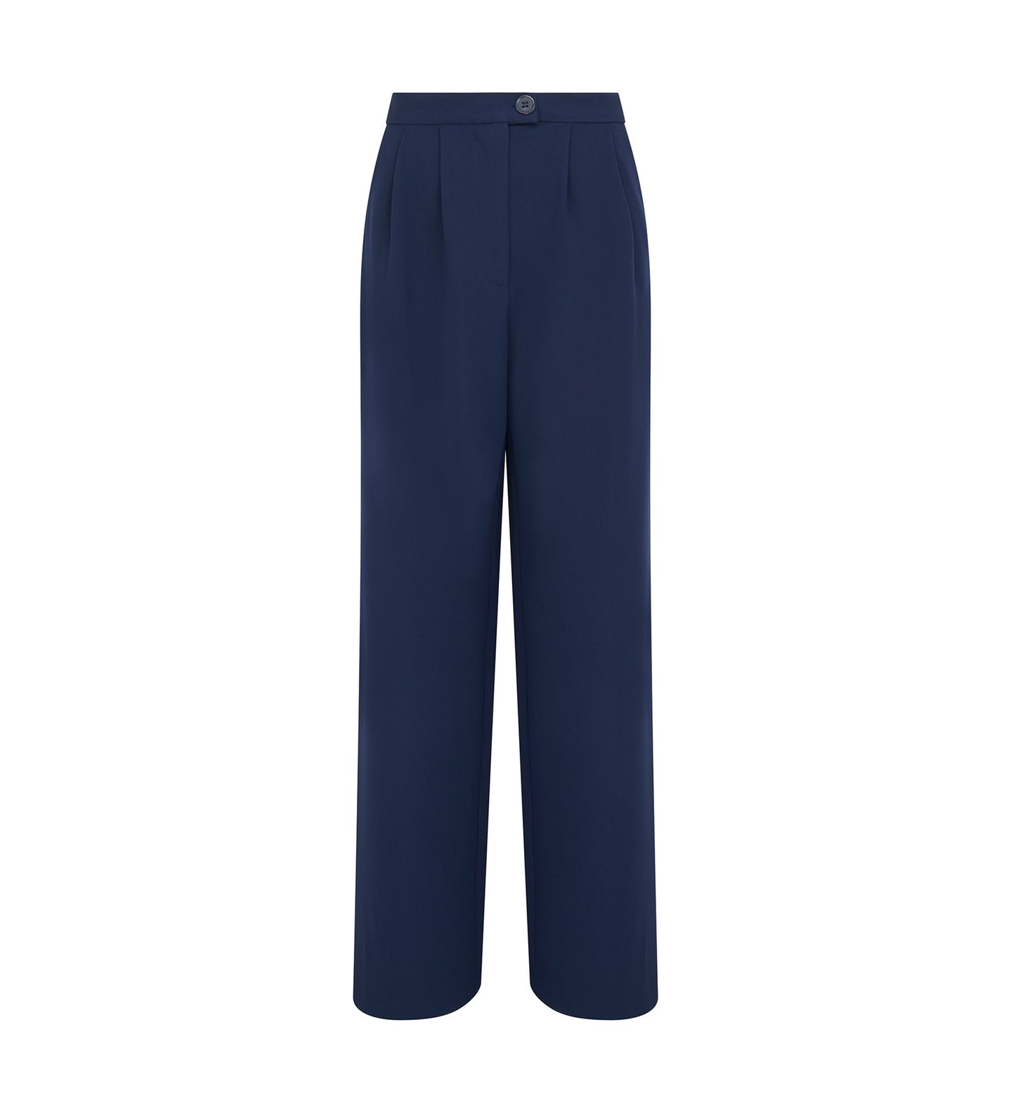 Fit and flare in style, our long Jeanne Trousers in navy are a wardrobe staple for every occasion. Cinching you in at the waist and falling into a flattering wide leg, these trousers have functional pockets as well as an easy button and zip fastening. Dress up with heels and a smart shirt, or down with a plain white t-shirt and sneakers.