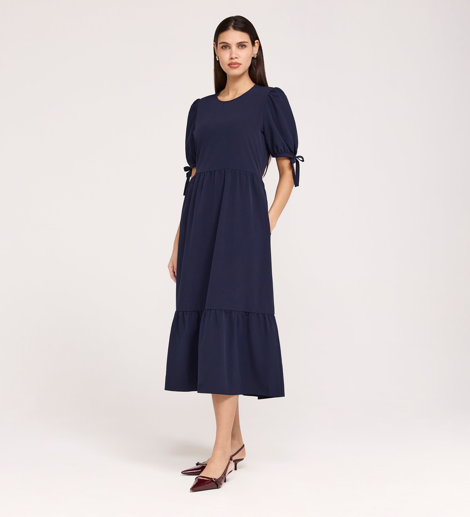 The Jessa Dress is designed for those who love a relaxed, airy silhouette with a touch of character. The midi length frame is defined by a structured empire waist and a soft waist seam, flowing into a breezy tiered skirt that moves beautifully. The standout feature is the short puff sleeves, which are finished with delicate tie bows on the cuffs for a playful, adjustable touch. It also includes discreet pockets in the skirt, making it as functional as it is charming.