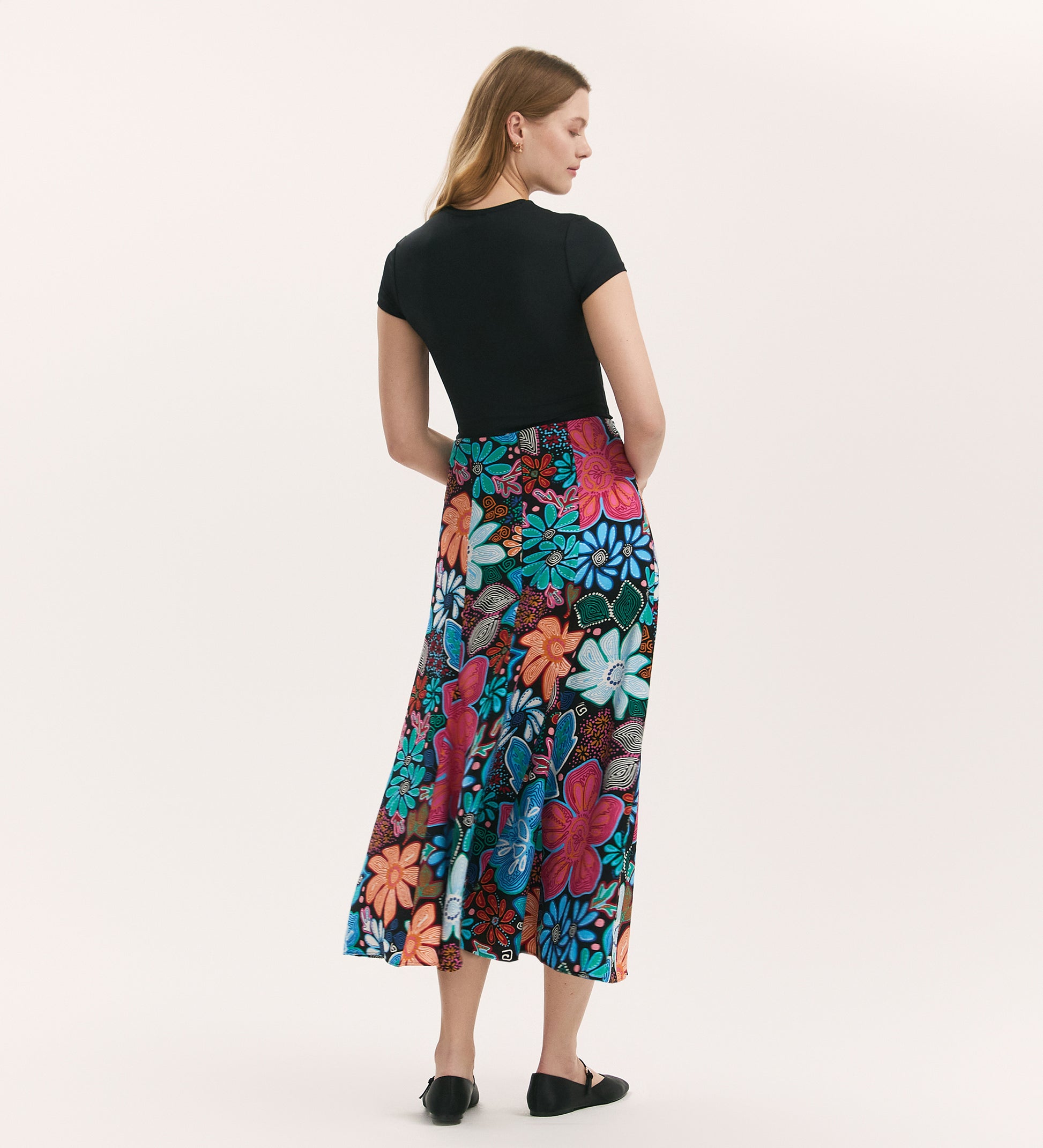 Make a statement with our Godet paneled midi skirt - Jessie. This flared and relaxed fit skirt features inserted godet panels, adding movement and flair to your look. Jessie also has back zipper closure.