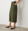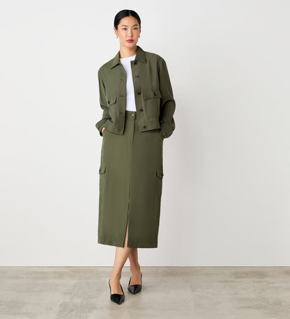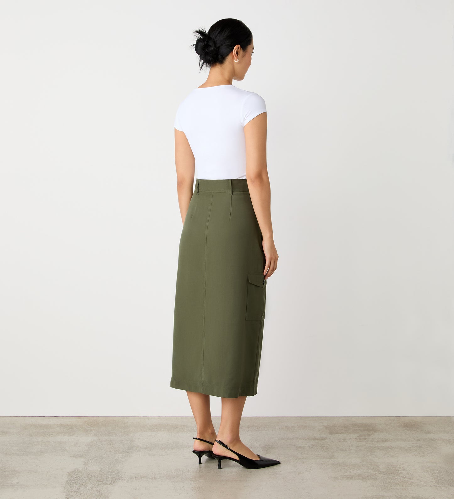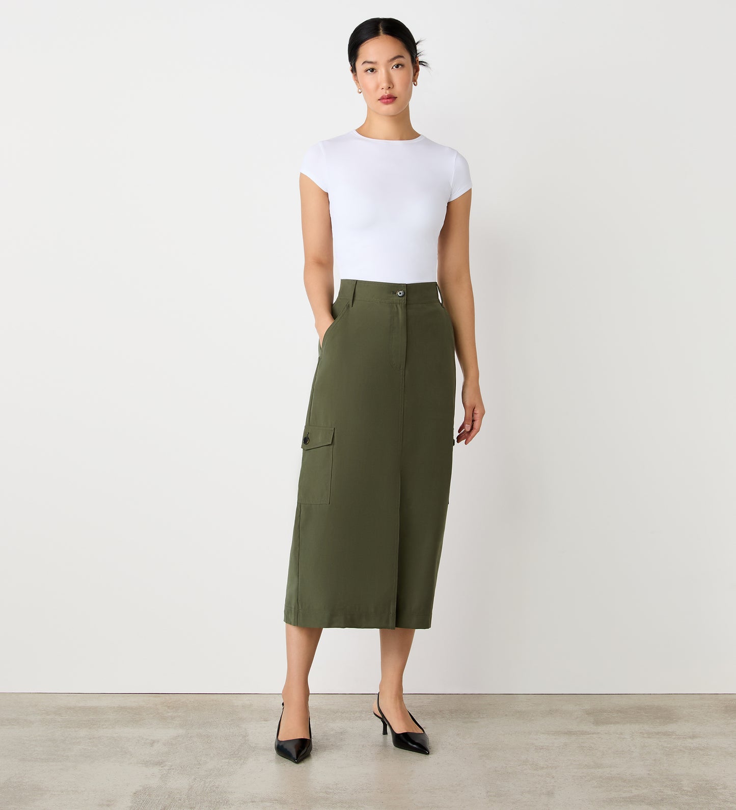 Our utility-style Juliette khaki cargo midi skirt features a zip and button fastening and classic cargo pockets. She also has an on-trend front vent, perfect for every season.