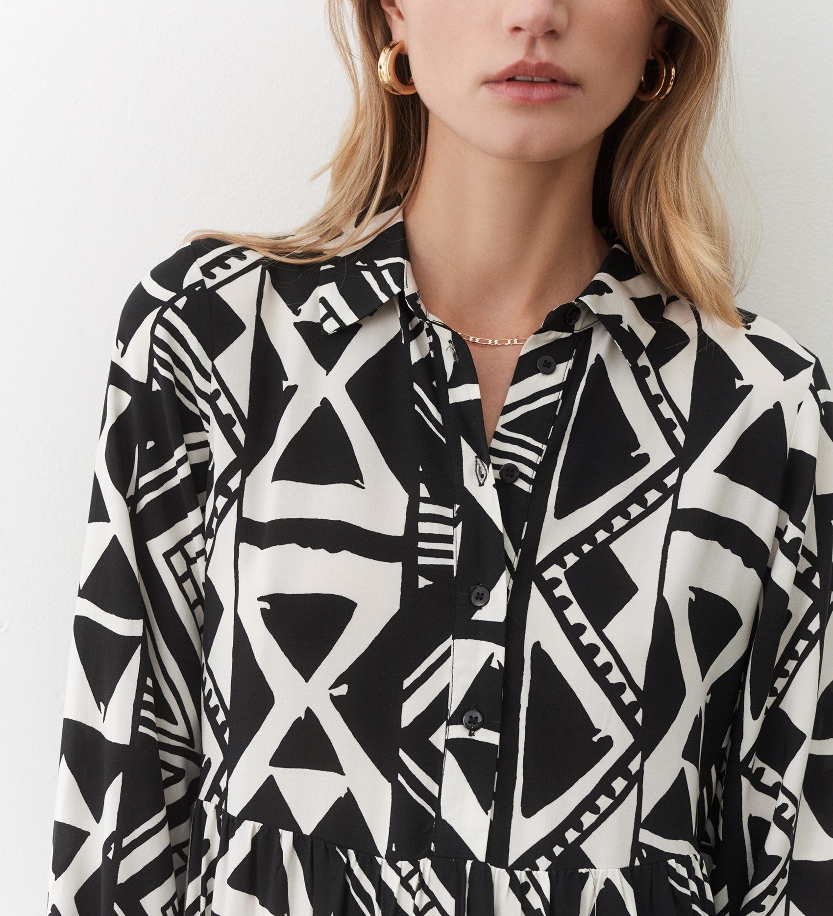 Meet your new everyday dress –Kalia. Cut to a flattering midi length in a gorgeous tribal print, this shirt dress features a button-through front placket to the waist that creates a flattering silhouette. A tiered skirt provides extra movement which contrasts with the long sleeves that flow into cuff and button detail. Wear yours with ankle boots and layer over with a chunky knit jumper.