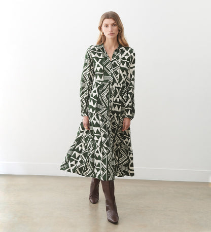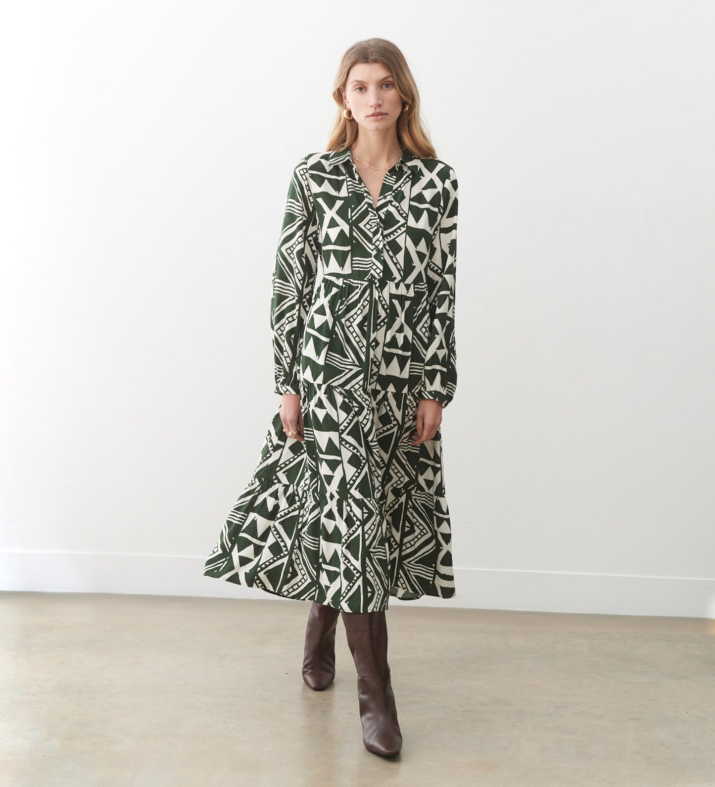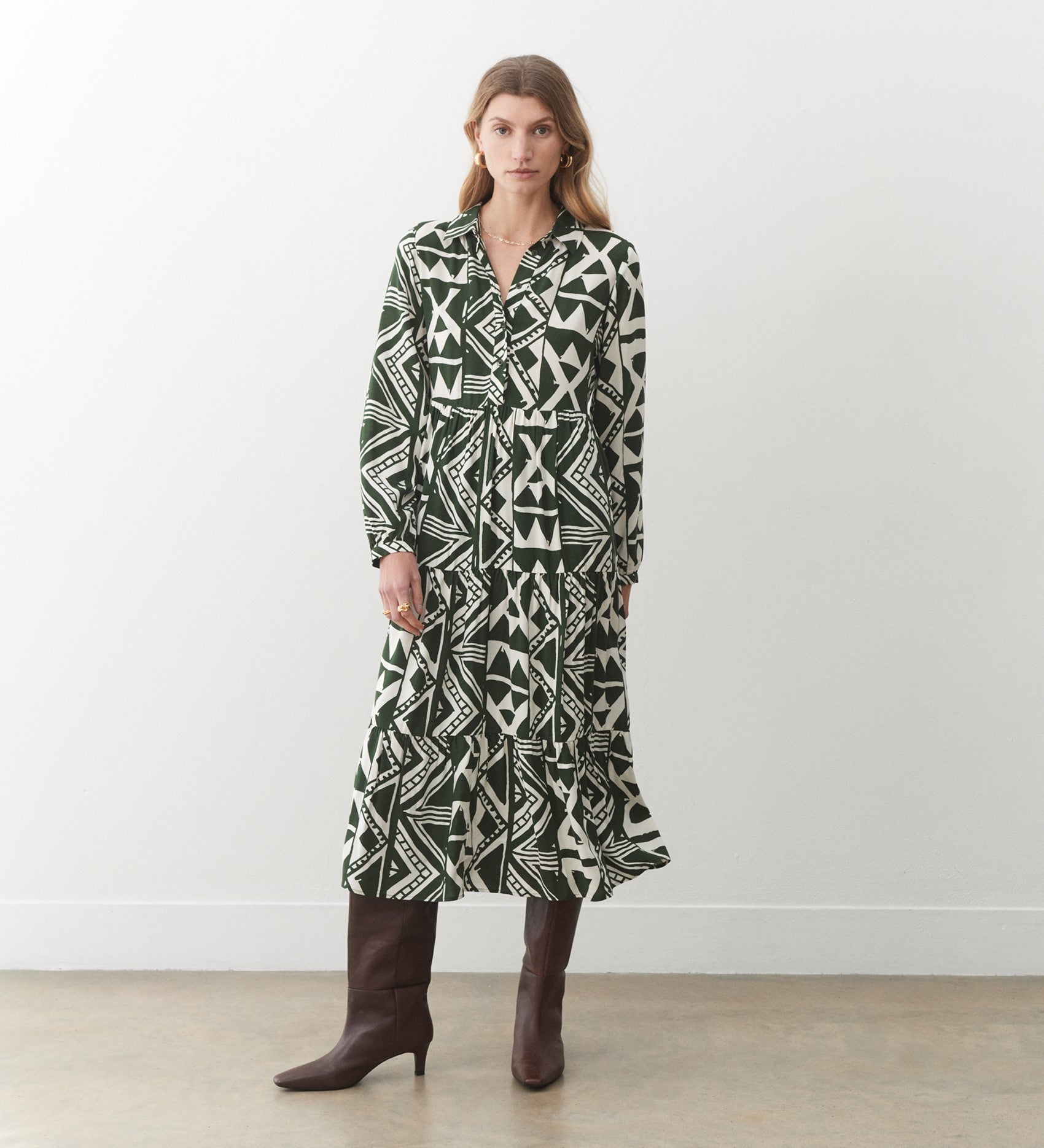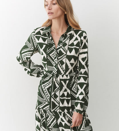 Meet your new everyday dress –Kalia. Cut to a flattering midi length in a gorgeous tribal print, this shirt dress features a button-through front placket to the waist that creates a flattering silhouette. A tiered skirt provides extra movement which contrasts with the long sleeves that flow into cuff and button detail. Wear yours with ankle boots and layer over with a chunky knit jumper.