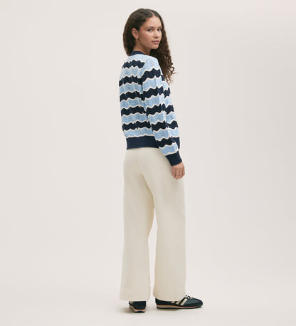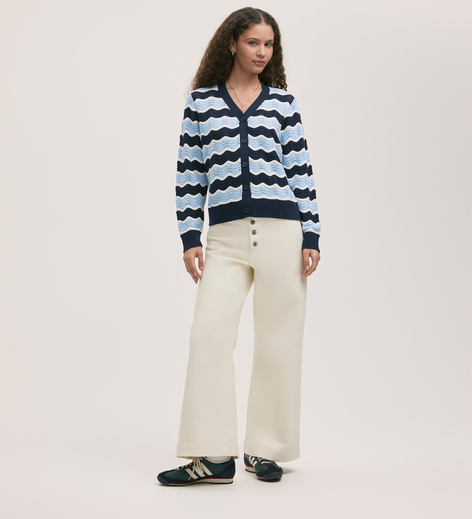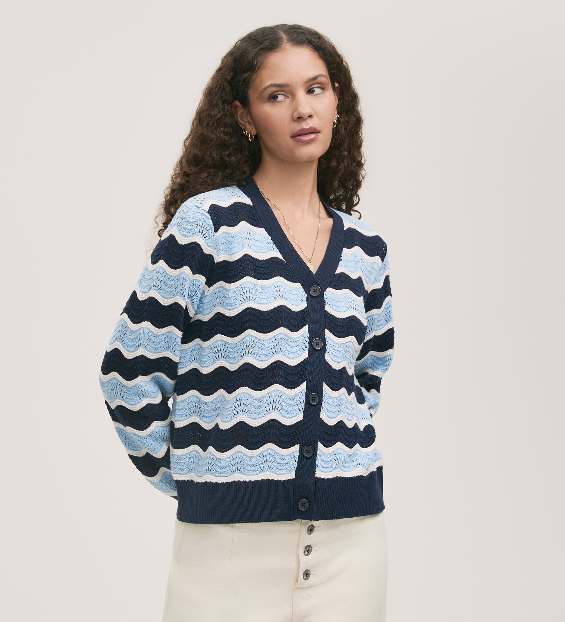 In a relaxed fit with dropped shoulders, Kate is a light blue and navy button-up crochet cardigan in a wavy striped design. She features ribbed detailing on the cuffs, hemline and neckline.