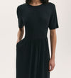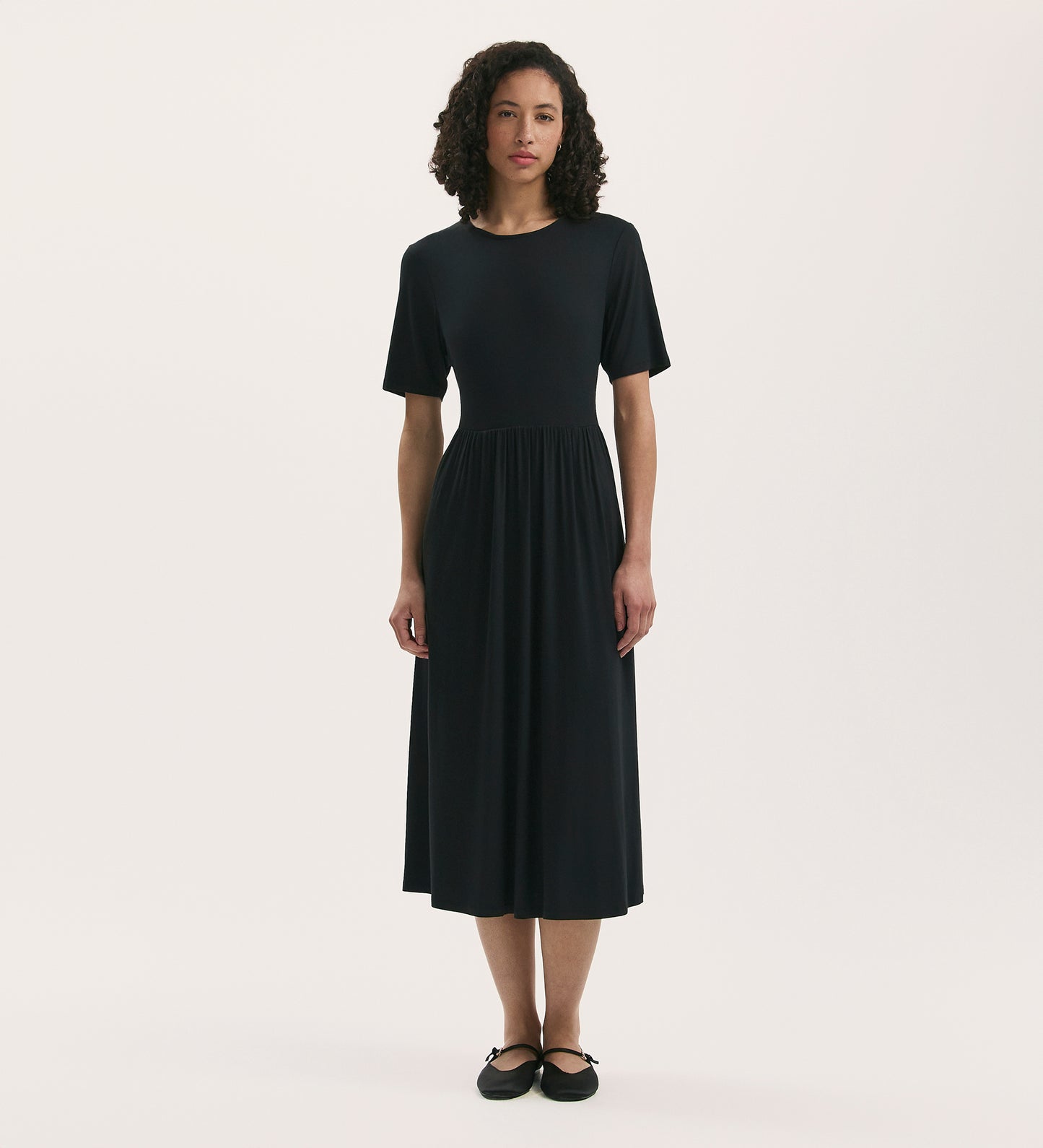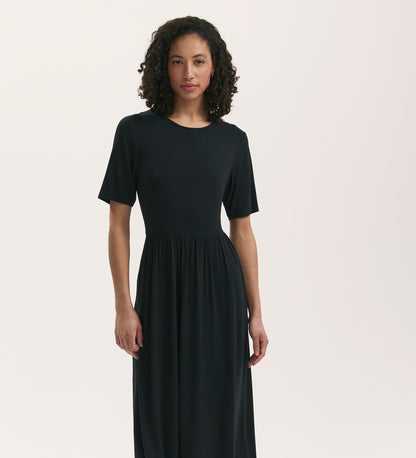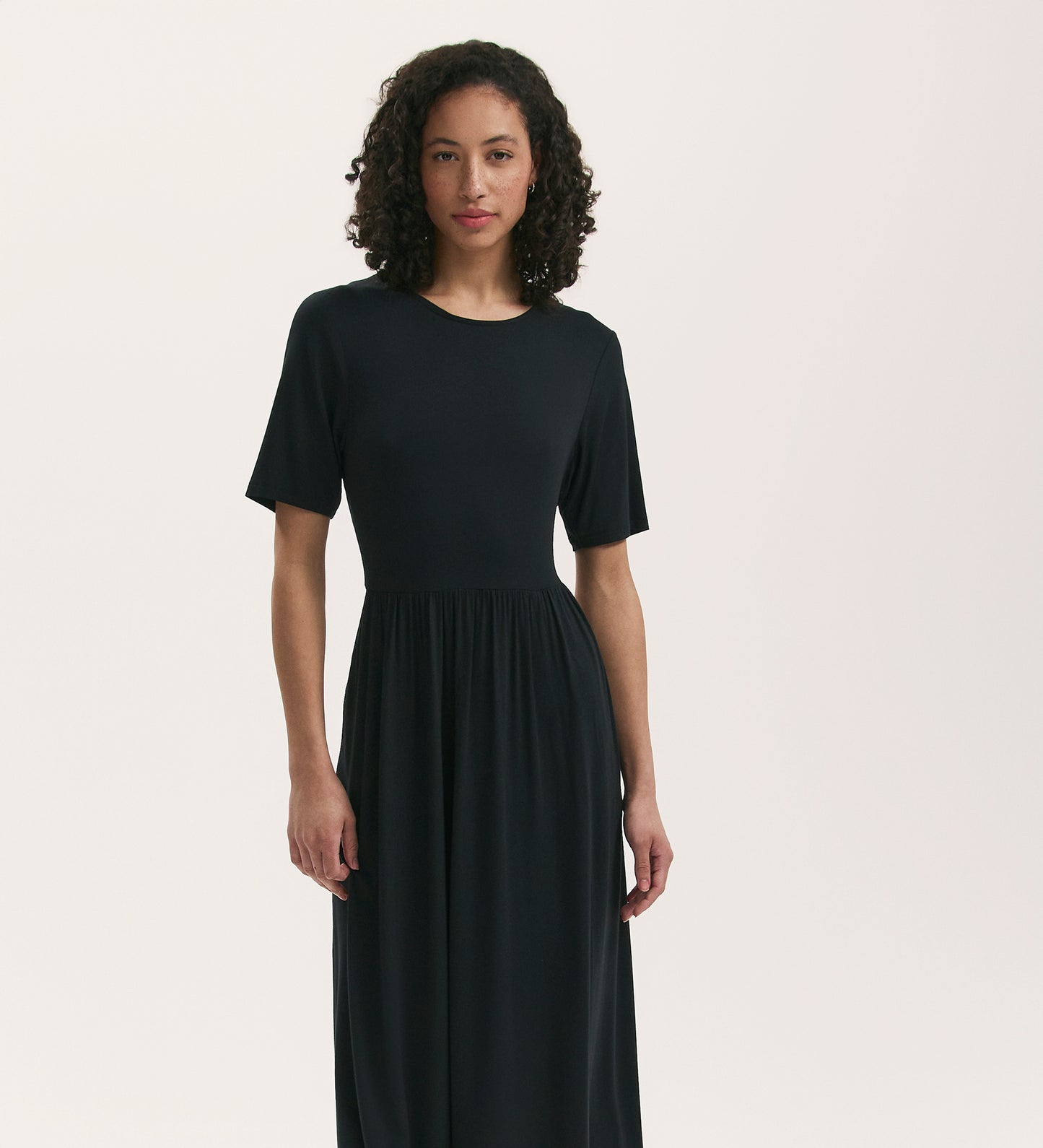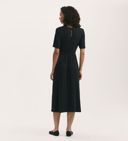 Crafted from our signature jersey fabric, Kathryn is a black midi t-shirt dress in a relaxed fit with a crew neck and short sleeves.