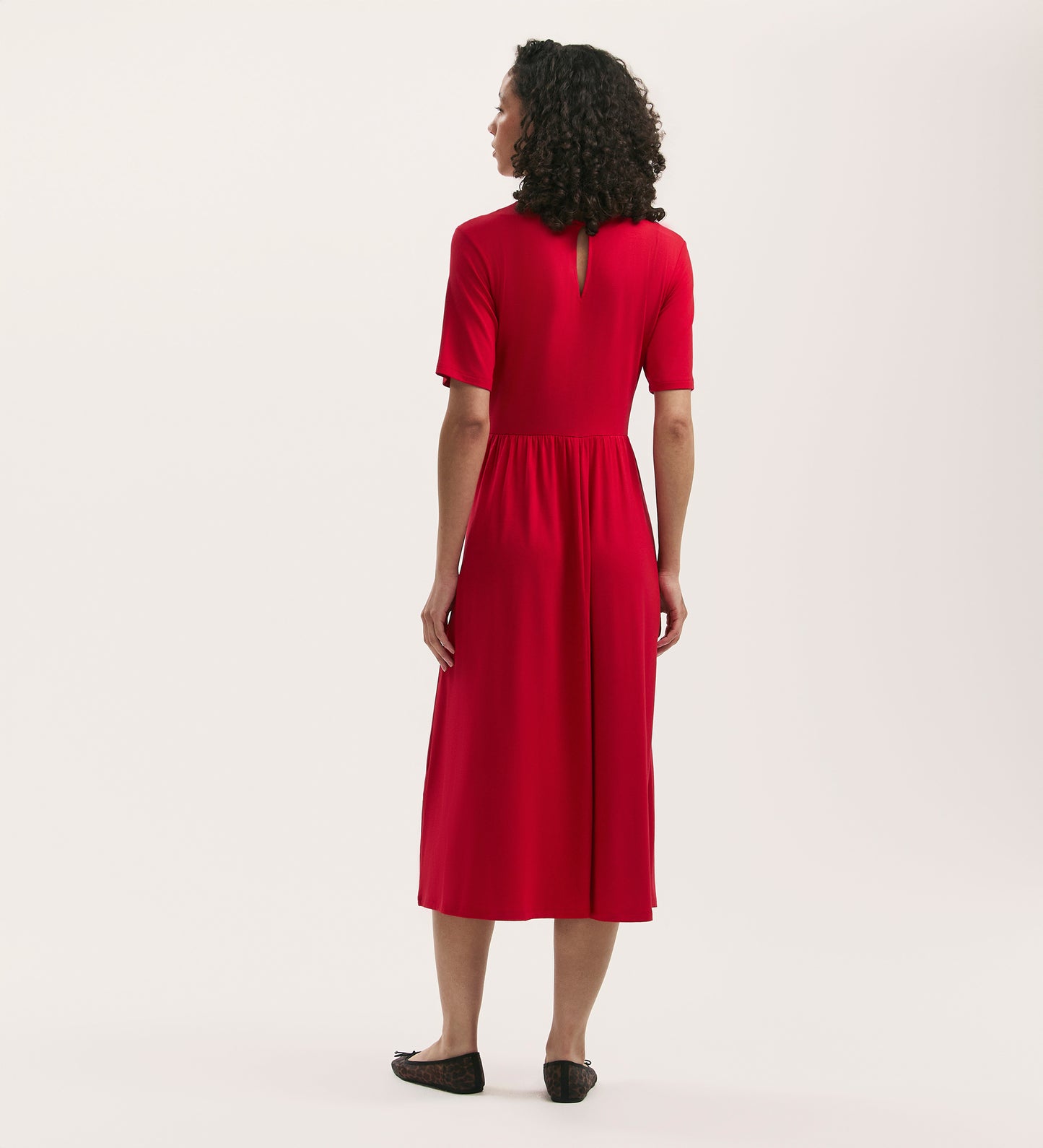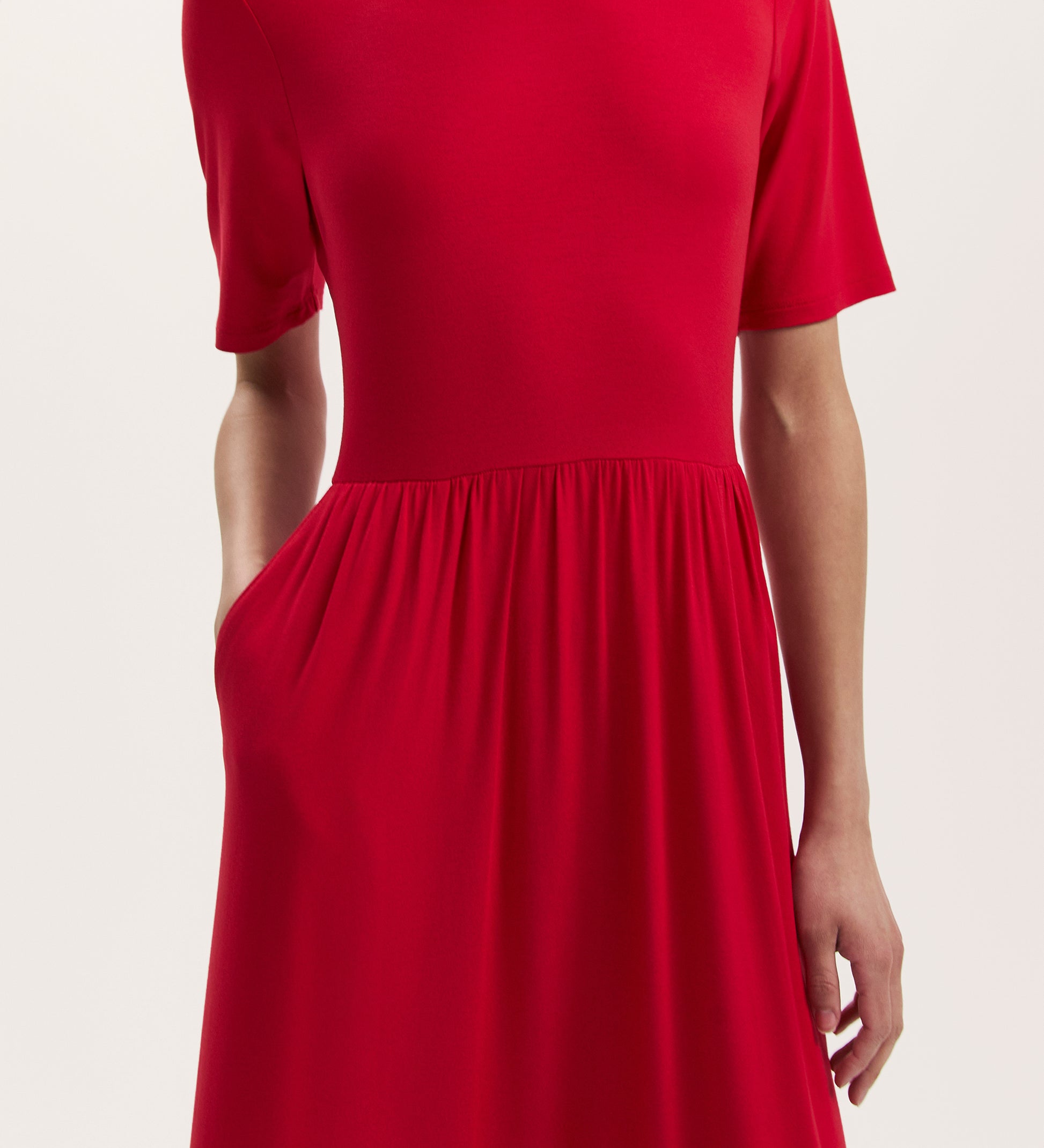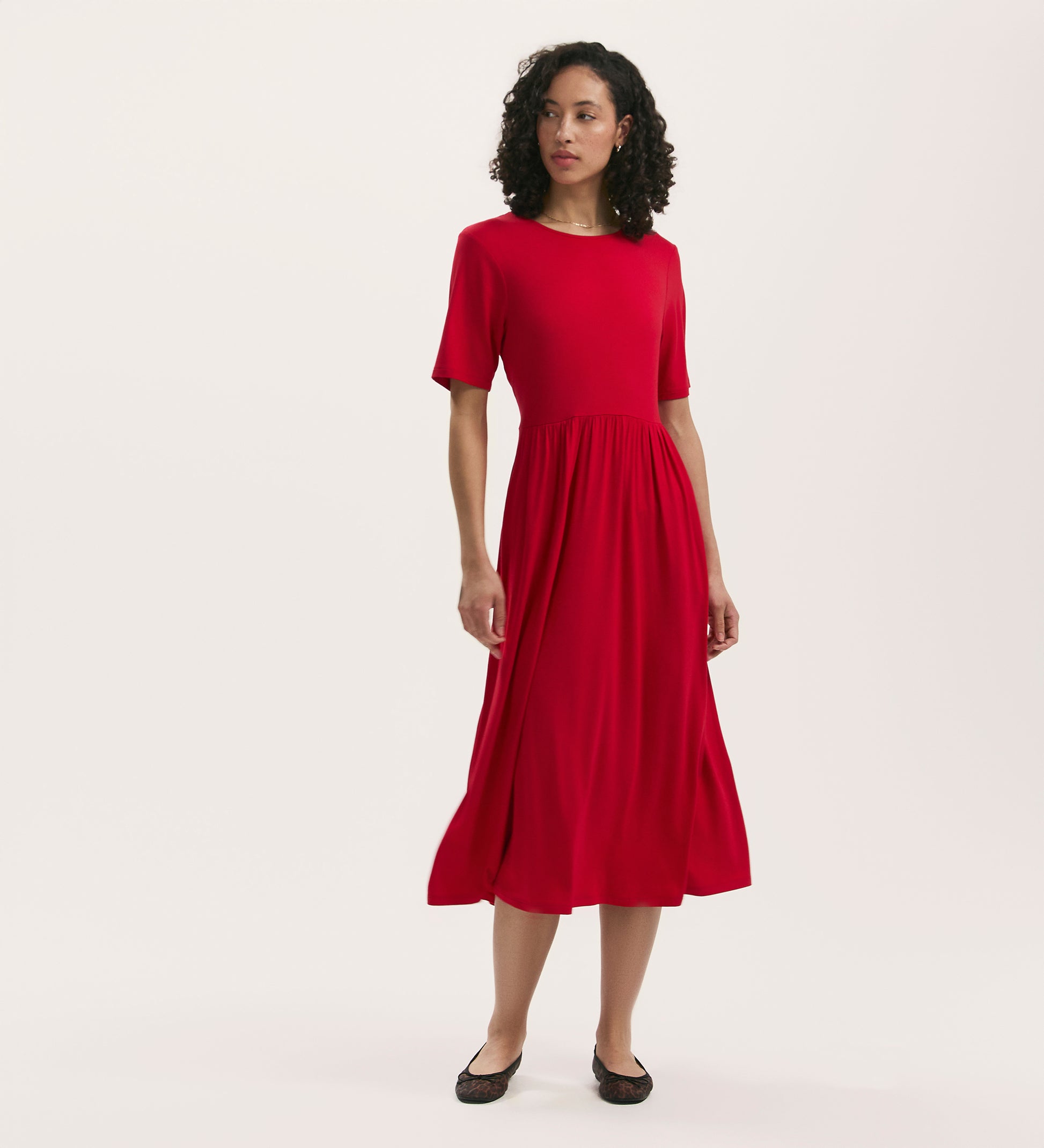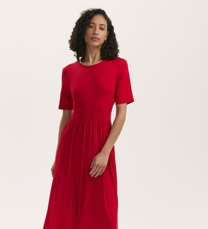 Crafted from our signature jersey fabric, Kathryn is a red midi t-shirt dress in a relaxed fit with a crew neck and short sleeves.