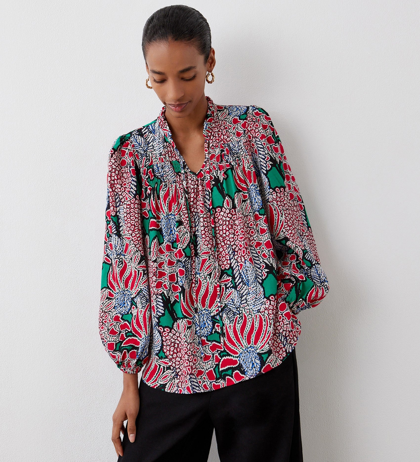 Promoting a boxy fit, our Kiya Blouse features voluminous puffed sleeves that flow into shirred cuffs. Pair with jeans or trousers and wear with sneakers for a casual look.