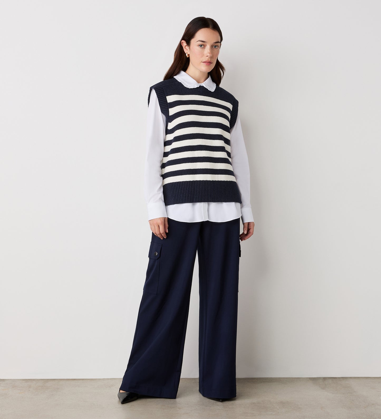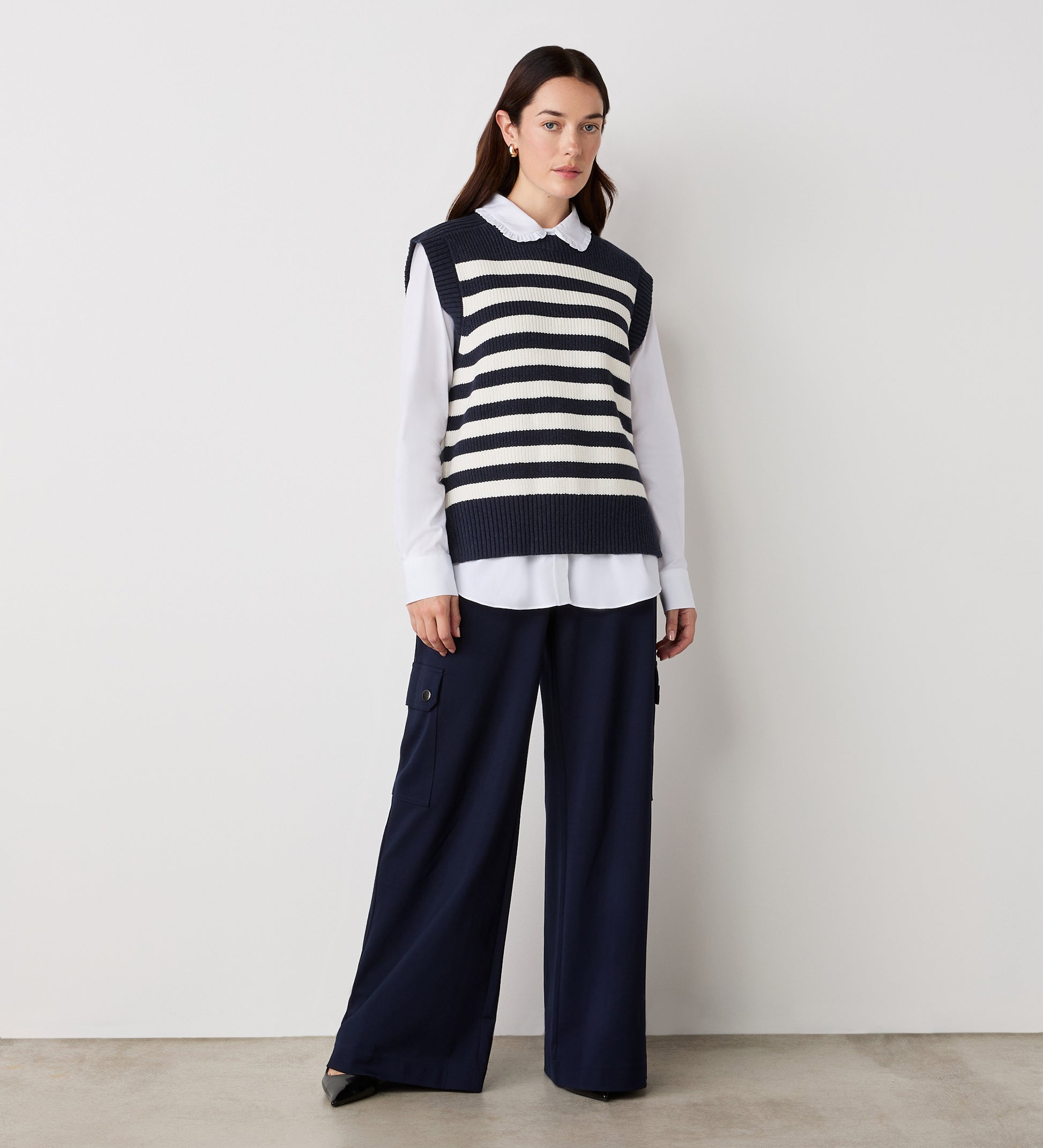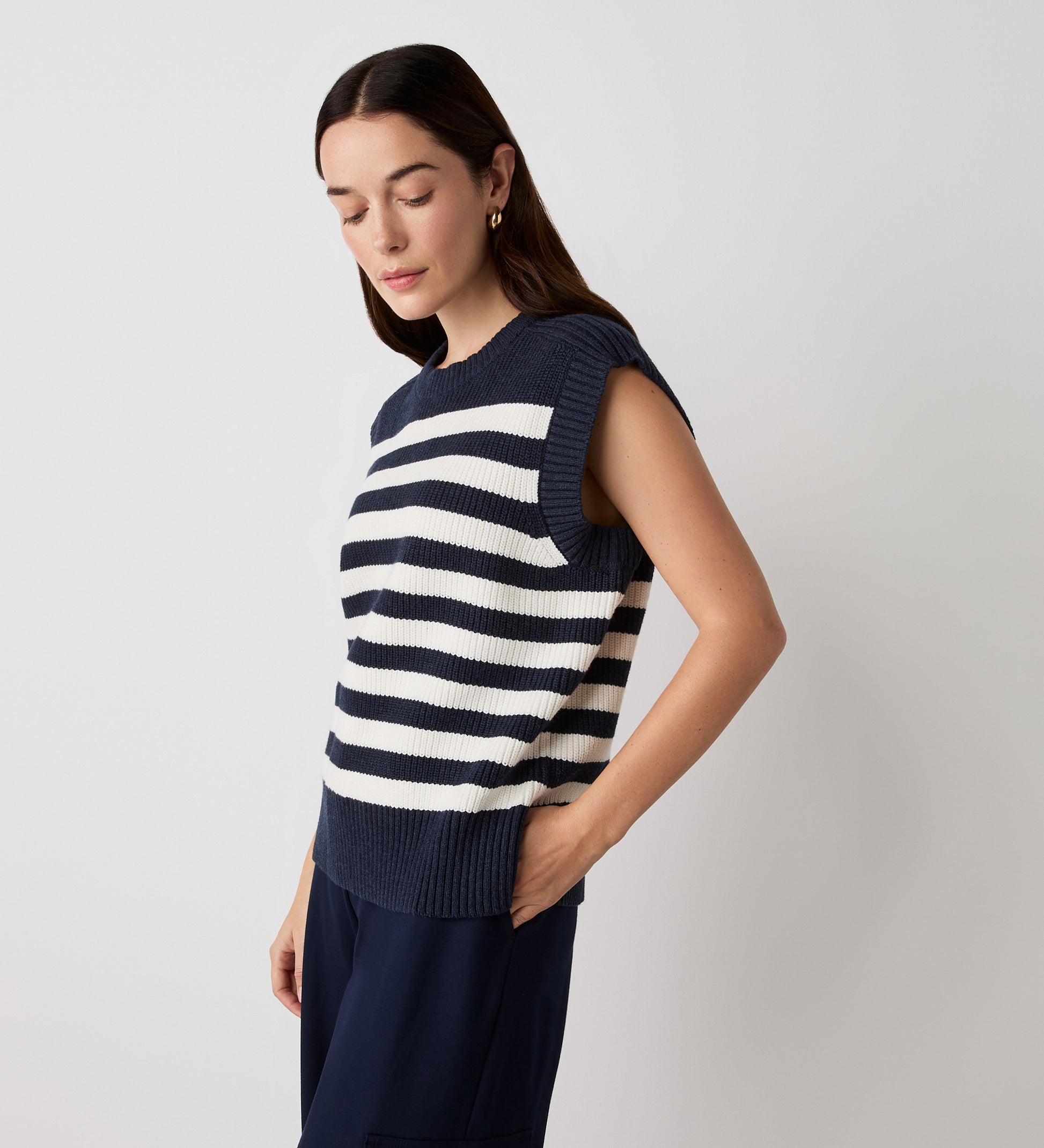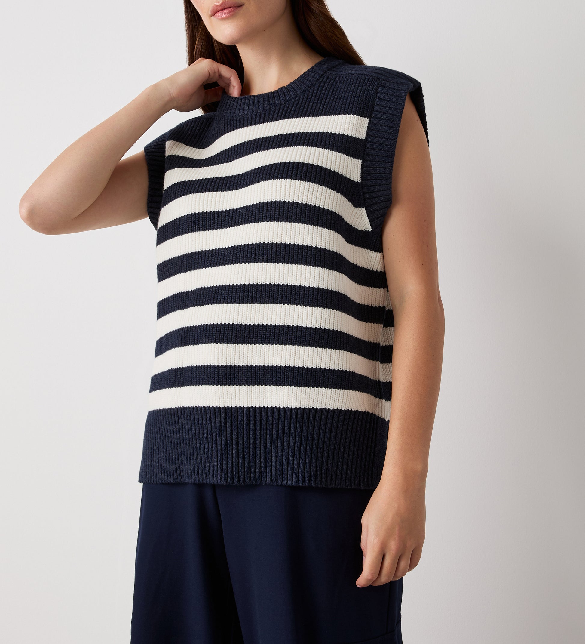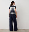 Crafted from a heavy knit with a crew neck, Lexi is a navy and ivory white striped sweater vest perfect for layering. Wear with jeans or trousers.