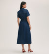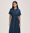 A denim midi shirt dress, Lily is buttoned through with front patch packets, short sleeves and additional side pockets.