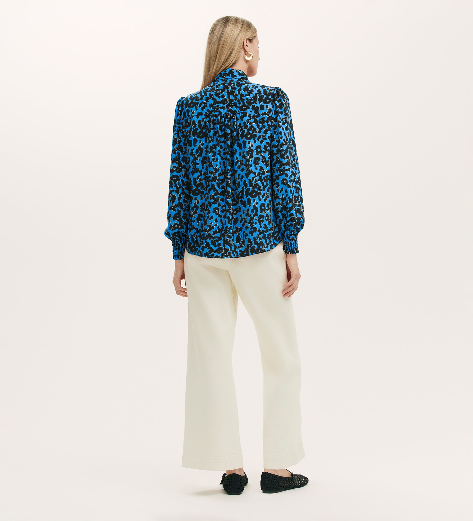 A wardrobe staple in gorgeous animal print the Lindsay pussybow blouse is a casual staple. The shirred cuffs create a blouson sleeve while the secured necktie can be worn in either a timeless pussybow style or left as a loose tie.