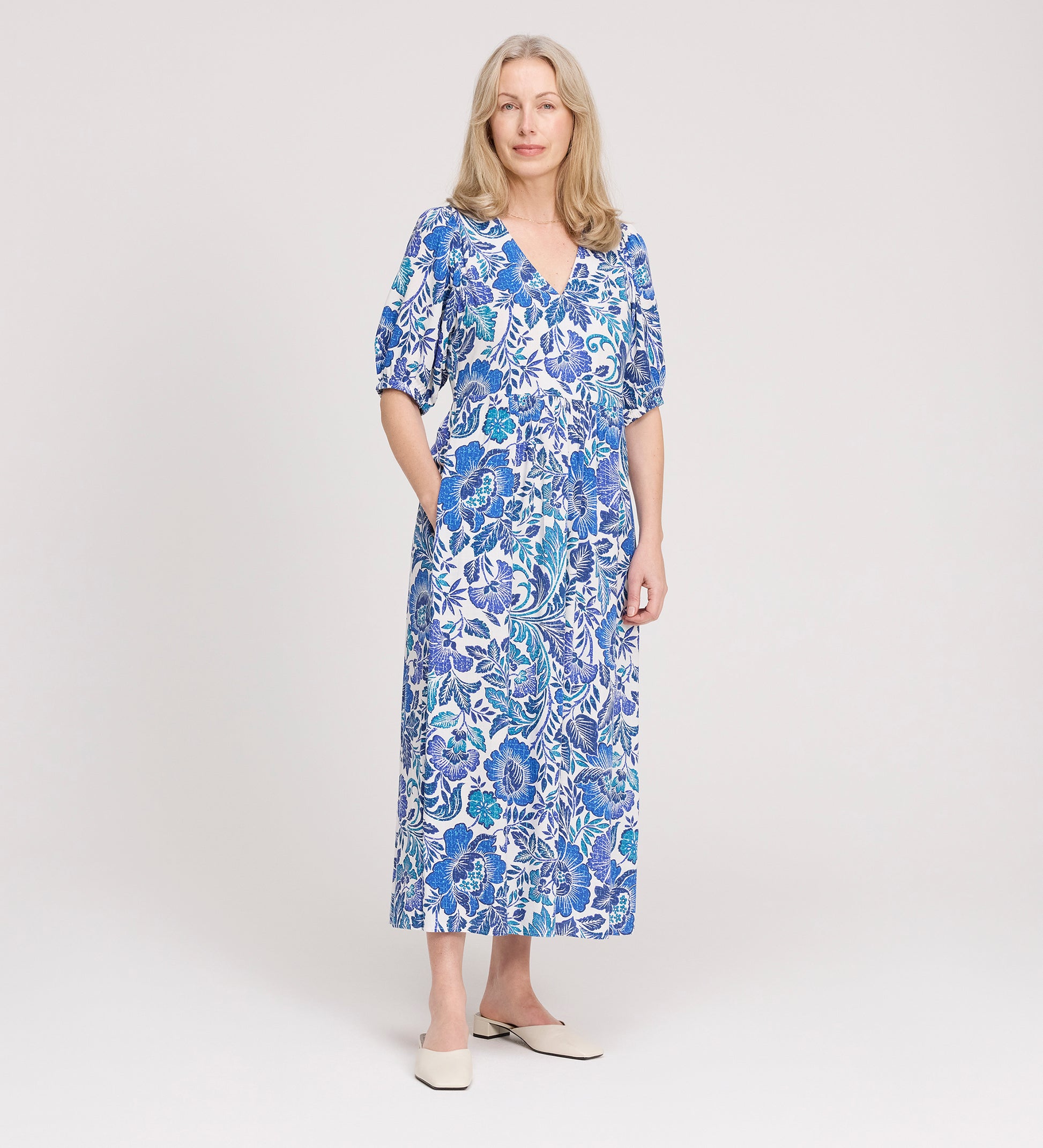 Make a vibrant statement with the Logan Dress, a standout midi designed for effortless versatility. This relaxed fit silhouette features a flattering V-neckline and short sleeves finished with elasticated cuffs for a contemporary touch. Expertly crafted in bold floral prints, it is elevated by practical side pockets, making it a dependable hero for everything from summer garden parties to polished daytime events.
