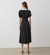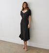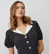 Crafted from our signature satin back crepe with gorgeous pearl front buttons, Lois is a midi dress with a revere contrast collar, short puff sleeves and an invisible side zip. Elasticated cuffs create volume, and back darts add shaping to this classic fit and flare style.