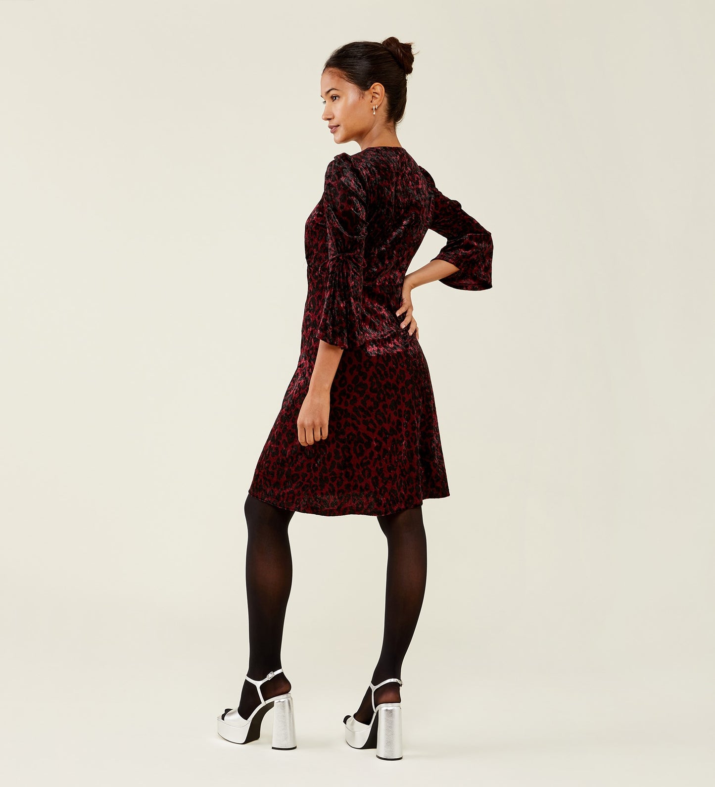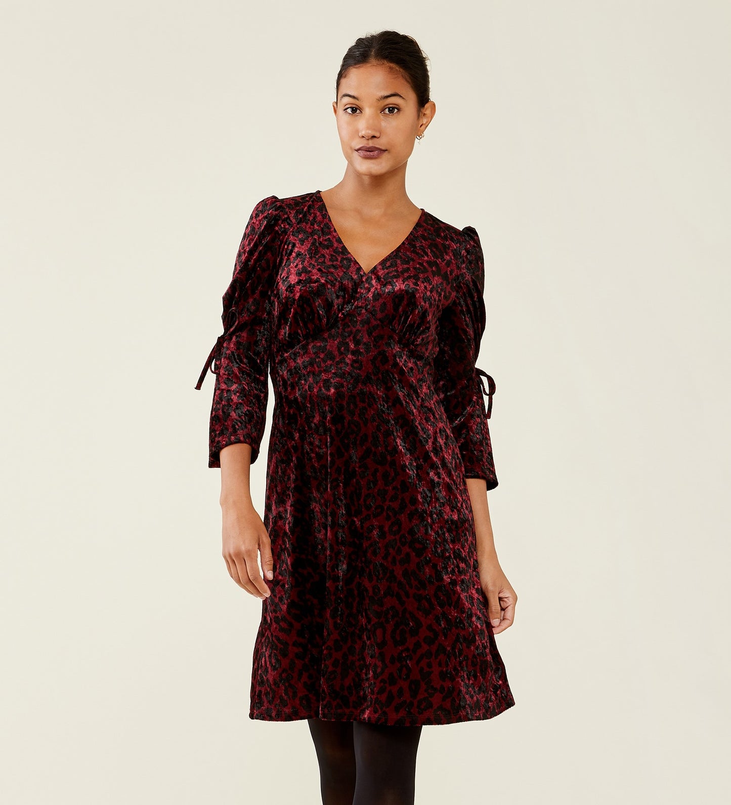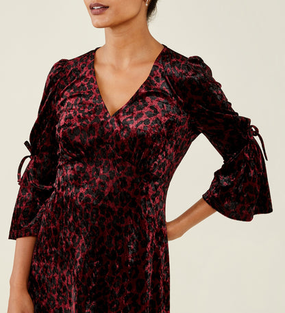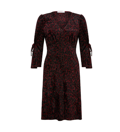 Looking for a showstopper this season, look no further than Lola. Crafted from luxurious velvet in burgundy leopard, she's soft against the skin and flatters the silhouette beautifully. With ruched sleeves and a v-neckline Lola shows just the right amount of leg, we think Lola will look beautiful with some strappy heels and a signature clutch.
