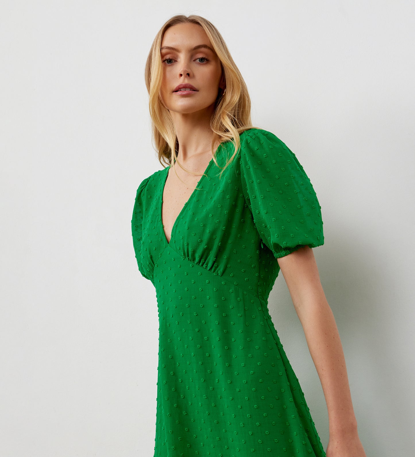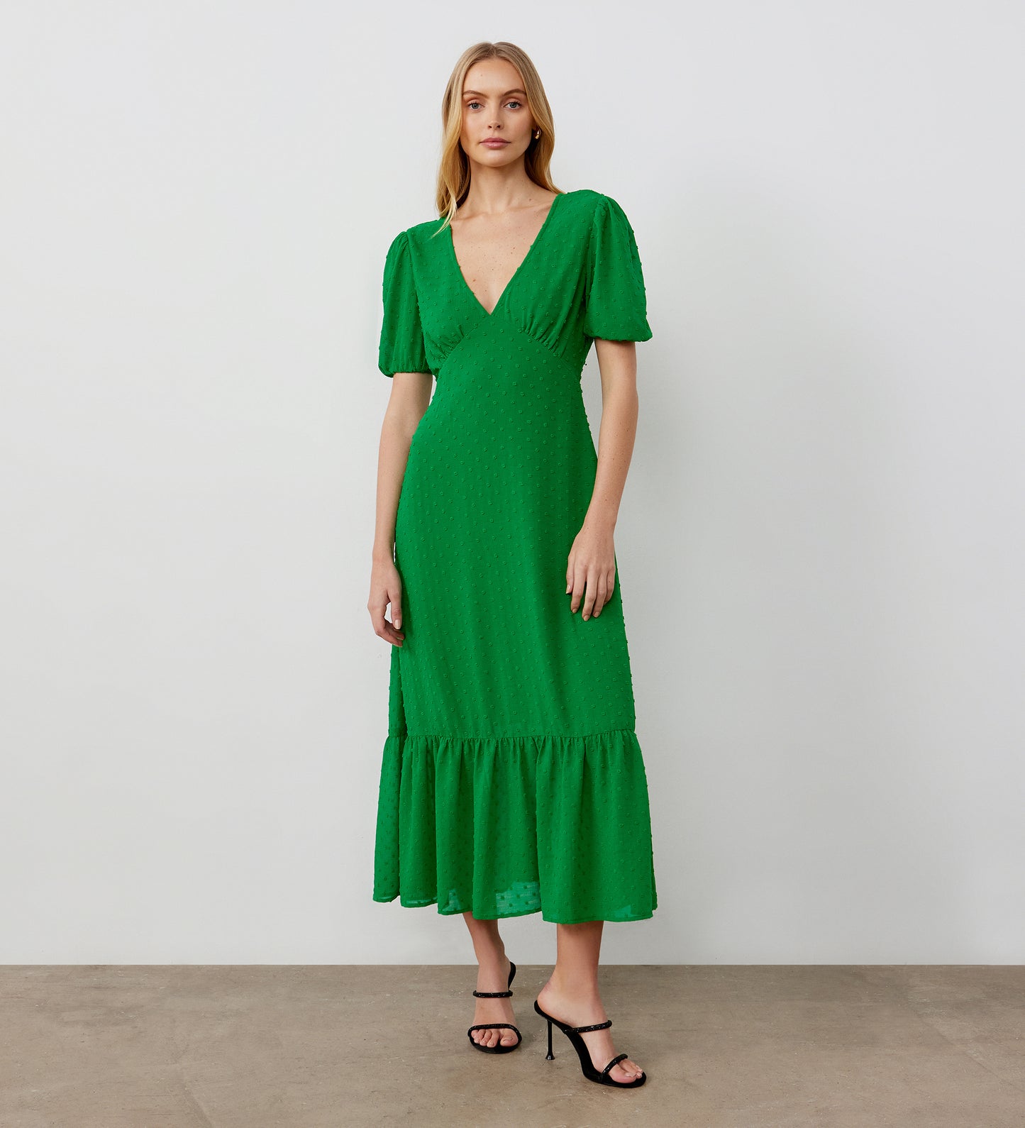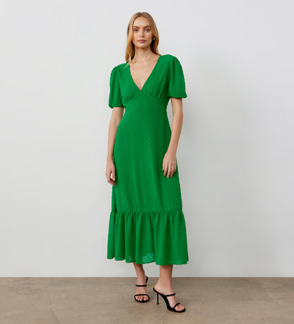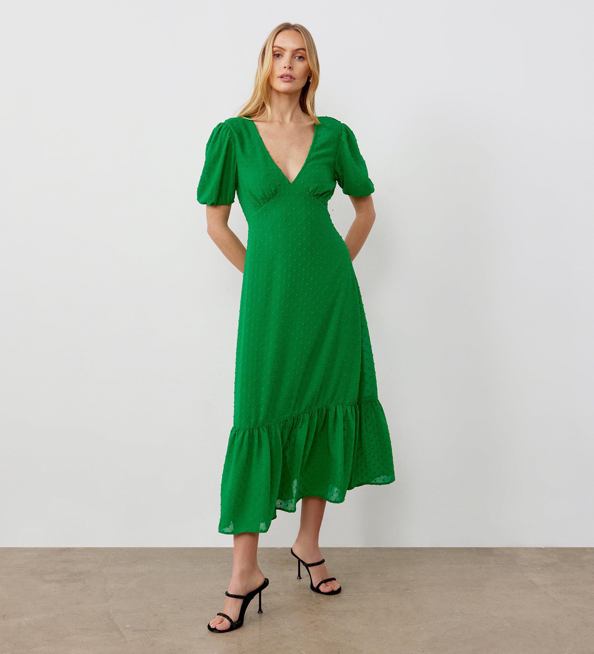 A V-neck midi dress, Loretta features a tiered hemline and empire seam bust that creates a classic fit and flare shape. Crafted from crinkle georgette, Loretta also features a gathered bust and short puff sleeves with elasticated cuffs. Note also, Loretta has an invisible side zip and rear keyhole and button fastening.