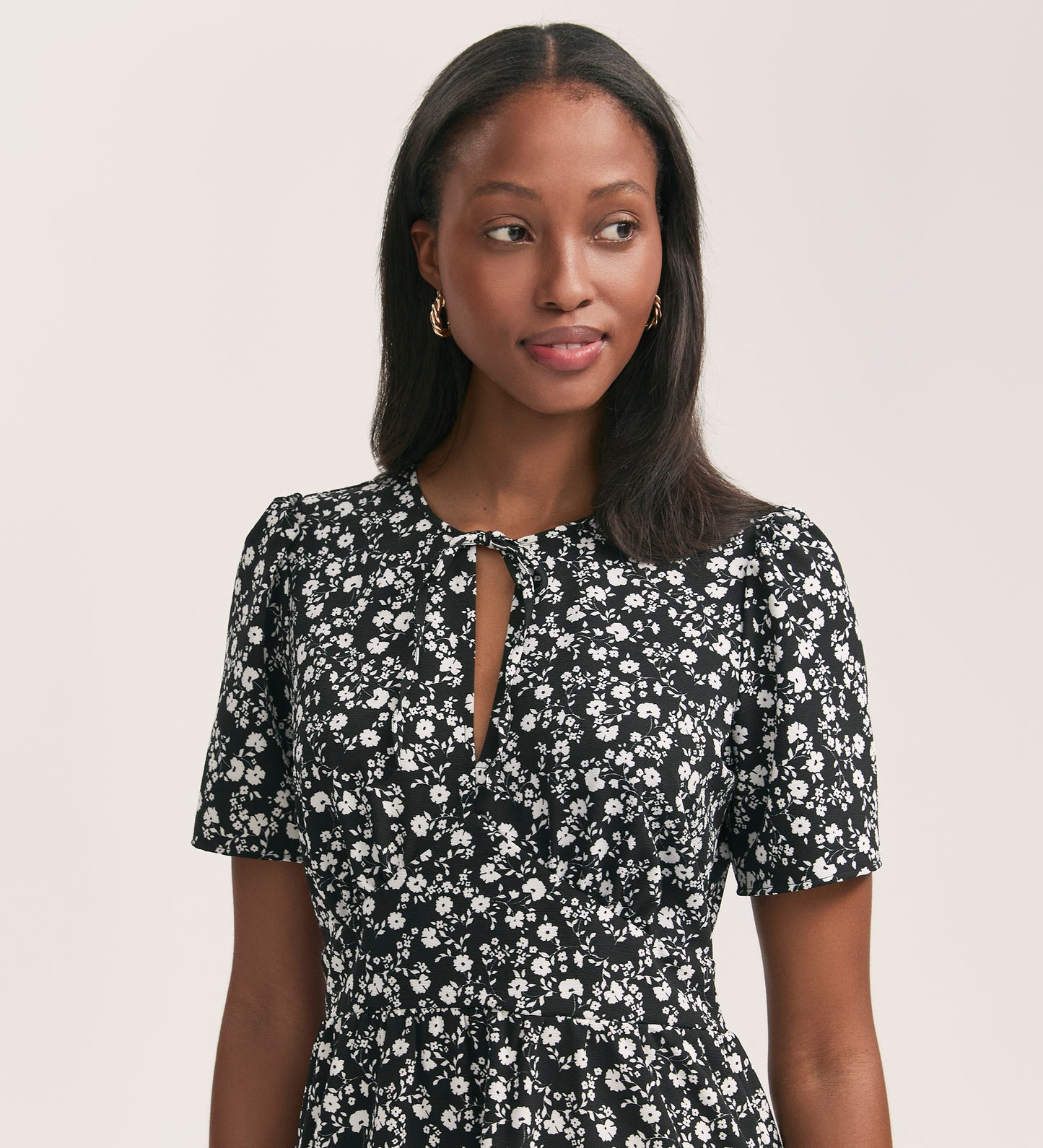 With short sleeves and a tie neck at the front, Mairead is a black ditsy floral midi tea dress crafted from our crease free crepe fabric. She also features a flattering waist seam that accentuates this fit and flare style dress.