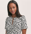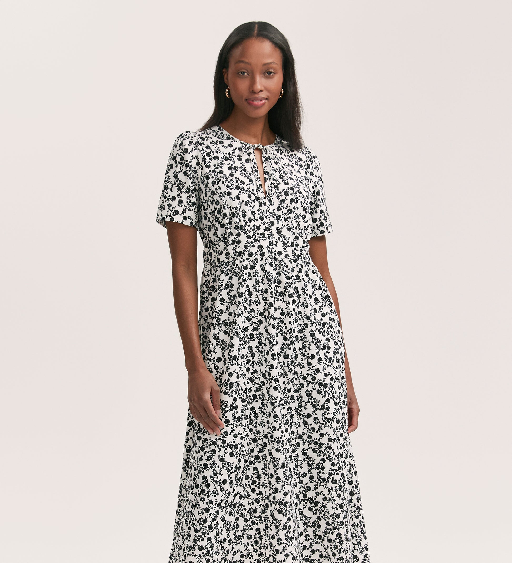 With short sleeves and a tie neck at the front, Mairead is an ivory white ditsy floral midi tea dress crafted from our crease-free crepe fabric. She also features a flattering waist seam that accentuates this fit and flare style dress.