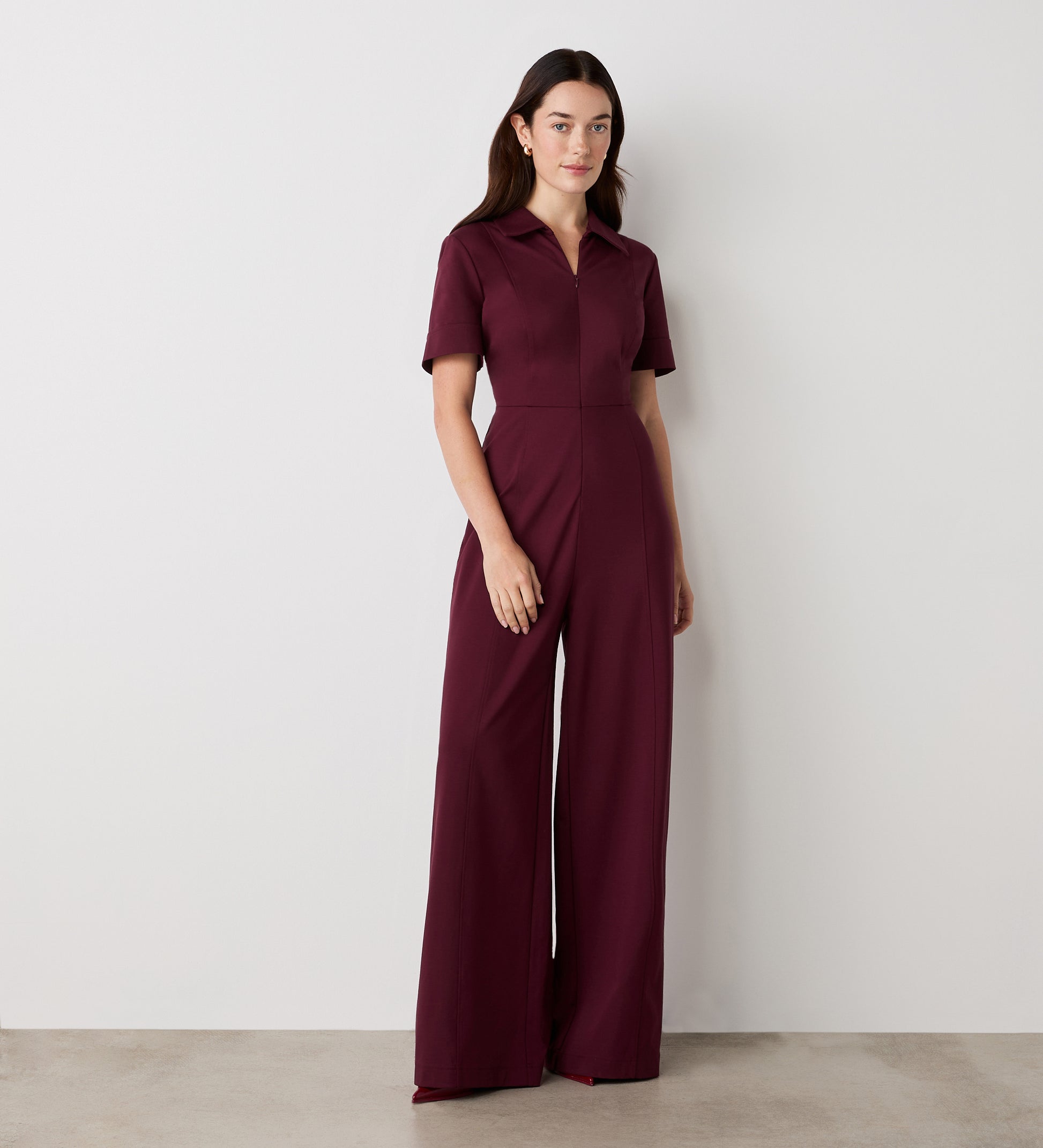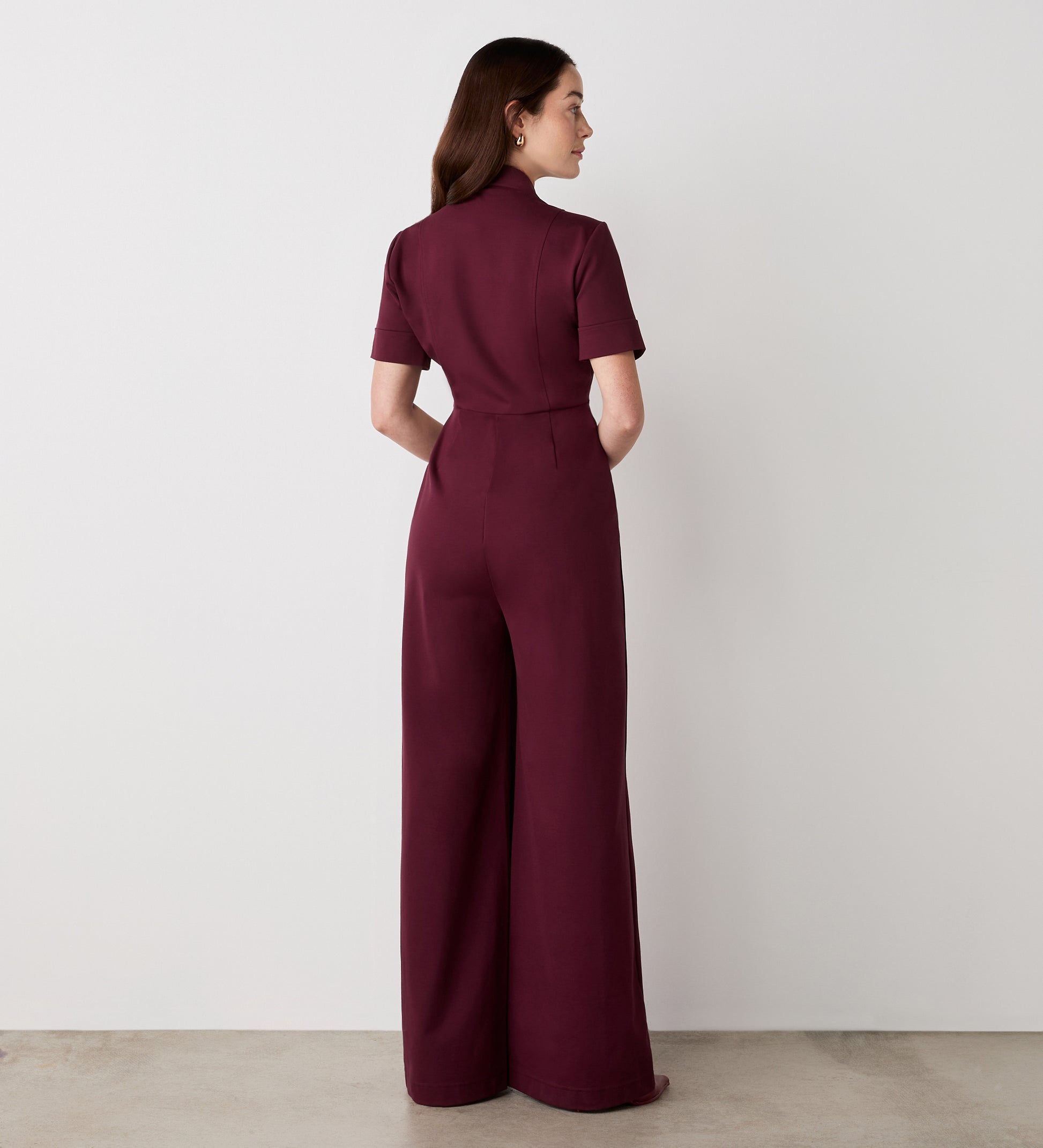 Crafted from Ponte Jersey, Marley is our collared, wide-leg jumpsuit with short sleeves and seam detail for a flattering fit. She also features an invisible zip at centre front.
