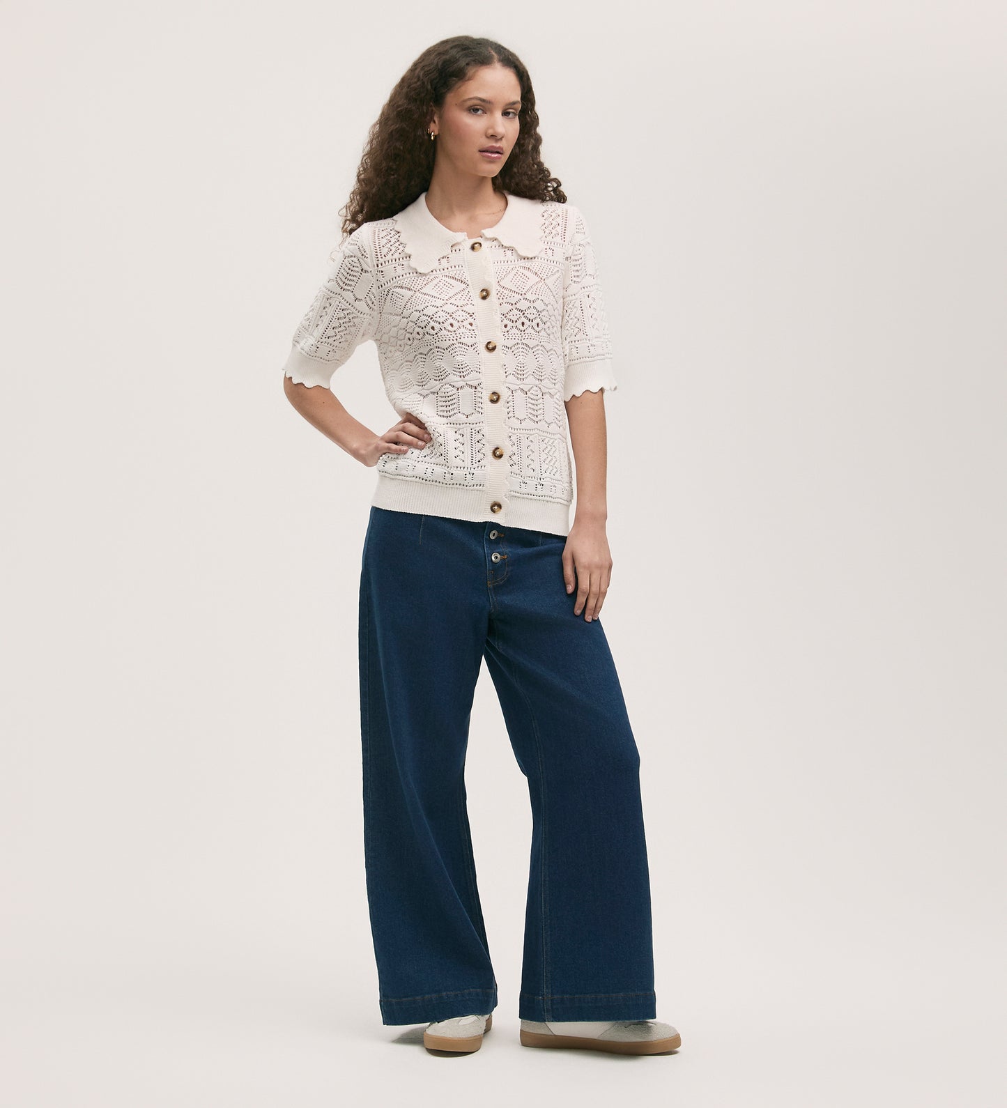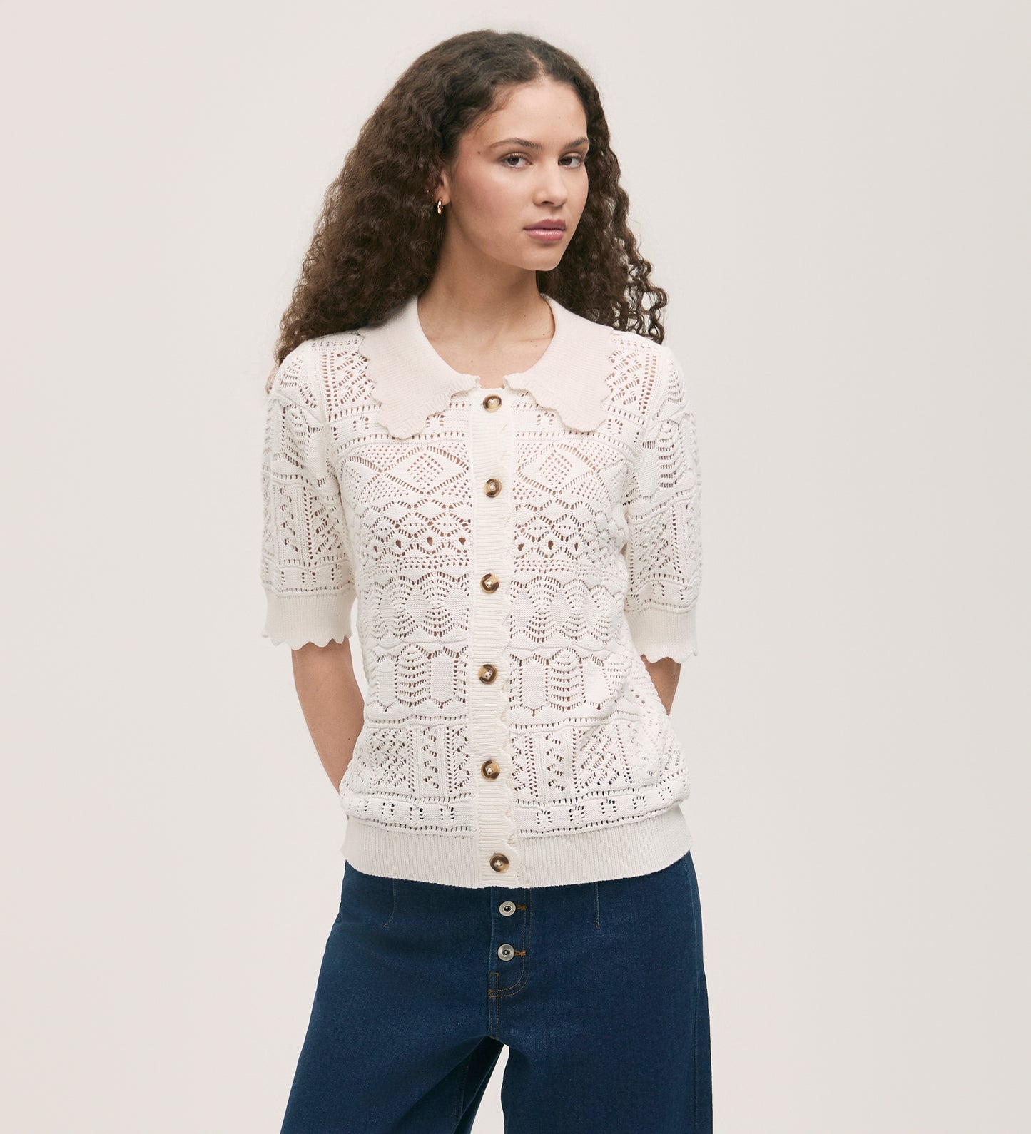 We love this scallop ribbed detailing on the collar and cuffs of Marlowe, our cream button-up crochet cardigan. She has short sleeves and a ribbed detail hemline.