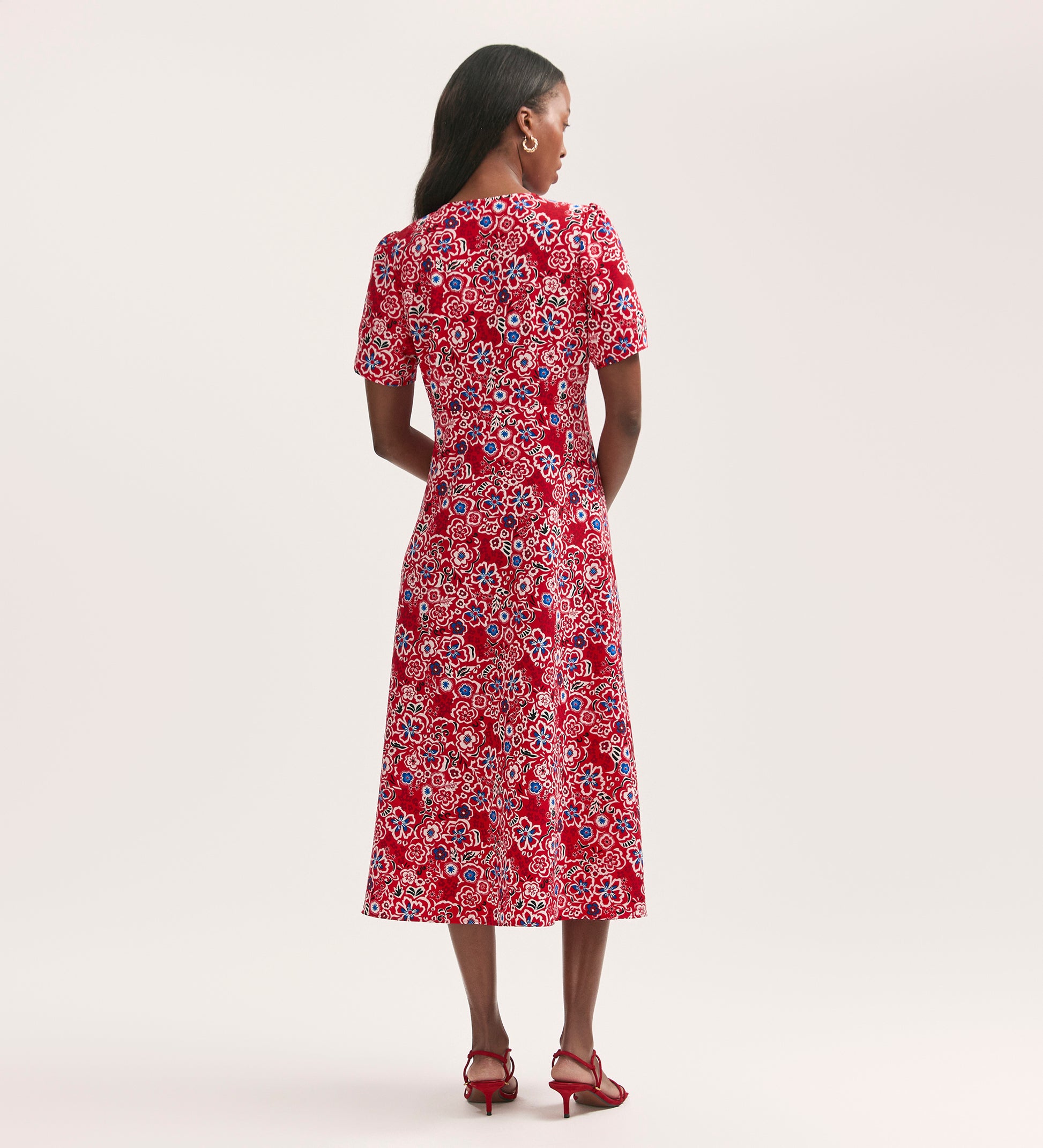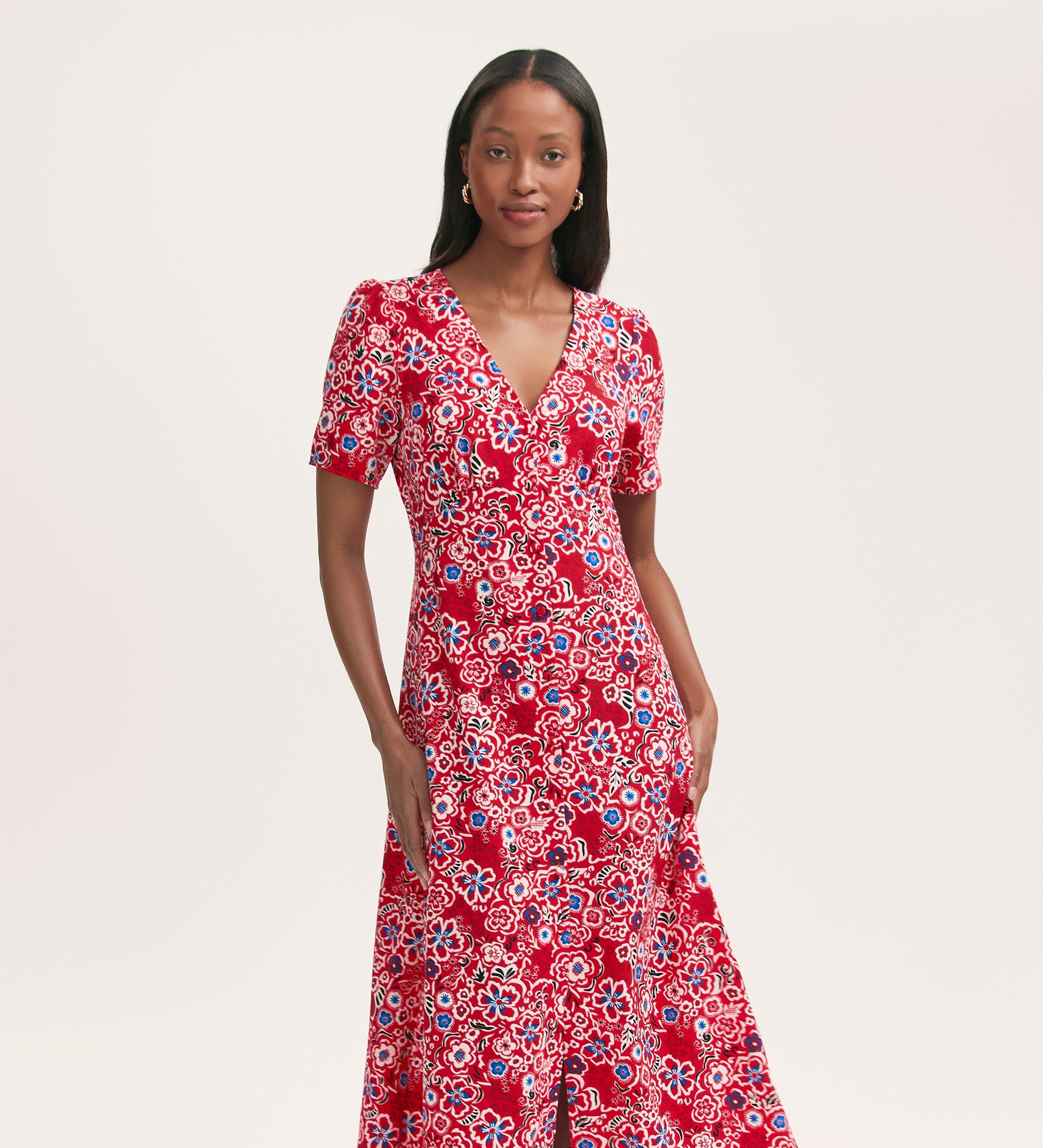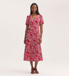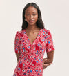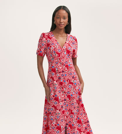 Martina is a red floral button-down midi dress, crafted from our crease-free crepe fabric. With short sleeves and a v-neck, she can be dressed up or down, whatever the occasion.