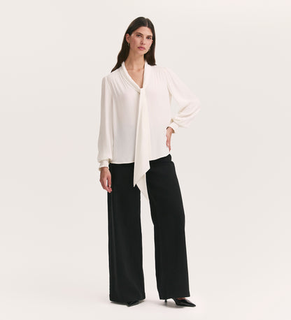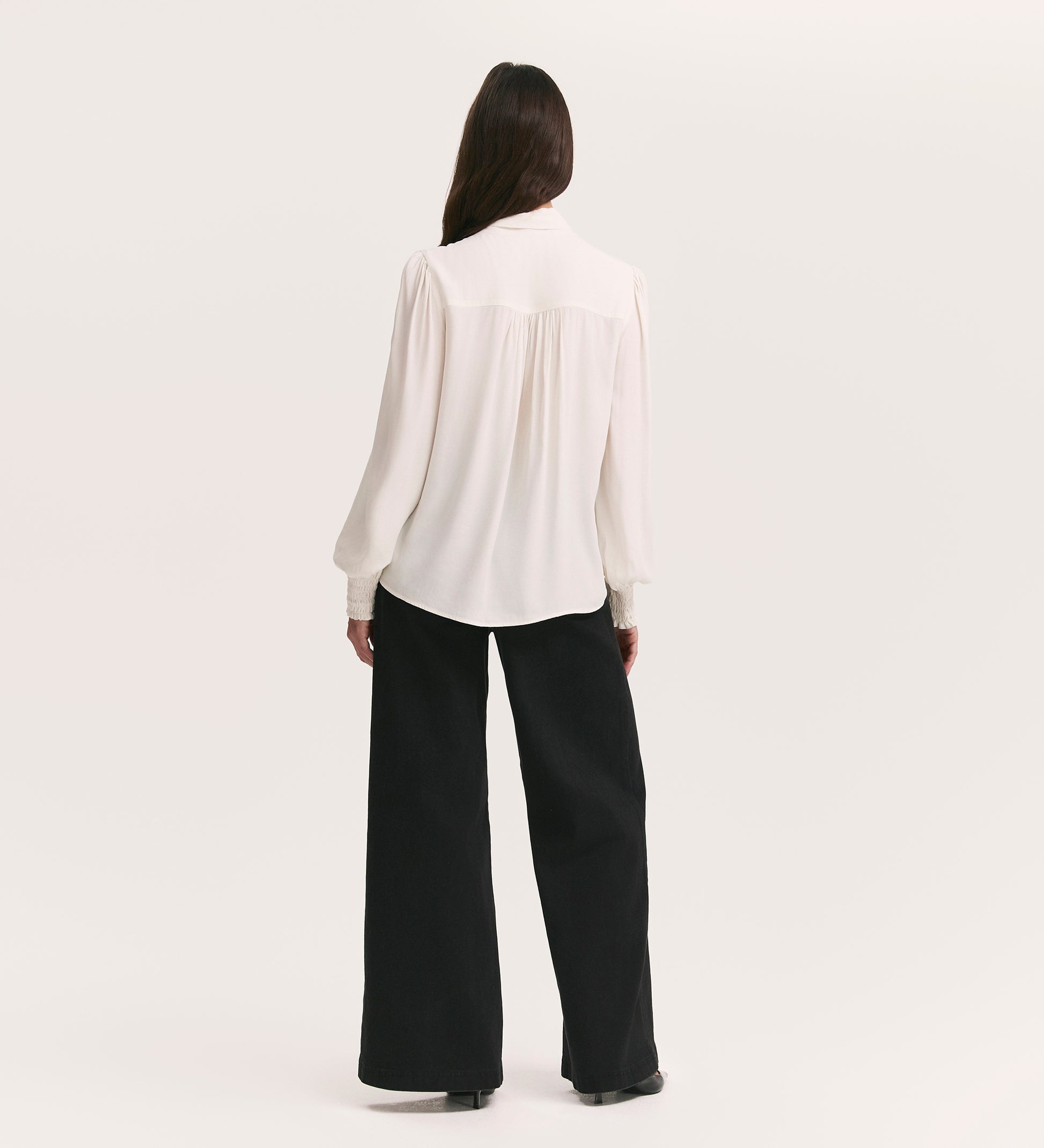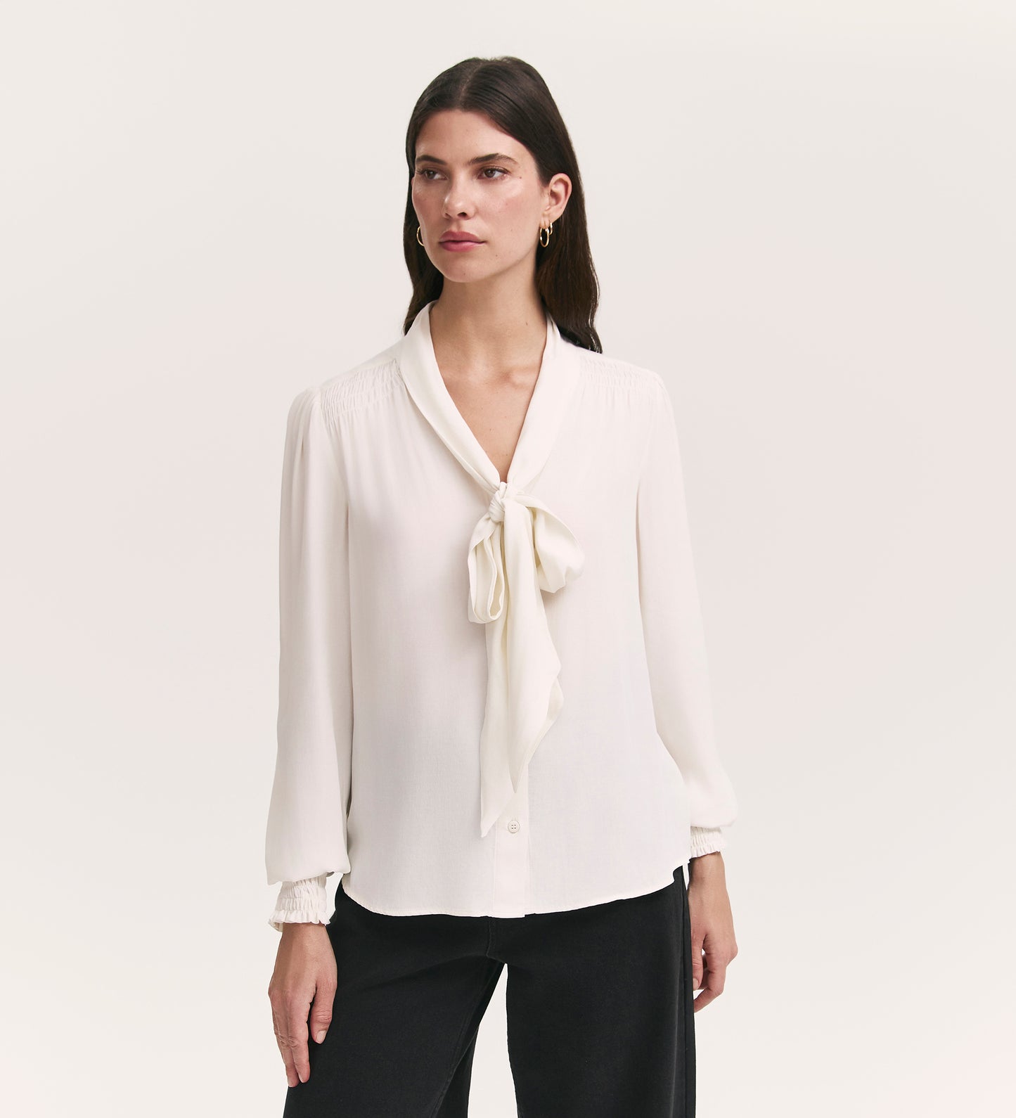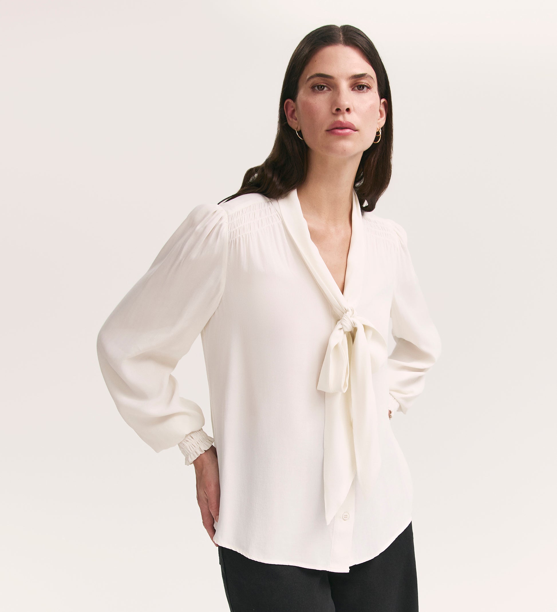 A timeless wardrobe addition, our Mavis ivory white tie neck blouse is a button-up with shirred cuffs that create long blouson sleeves. The cuffs also feature frill detail and a secured tie neck that can be worn pussy bow-style.