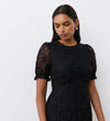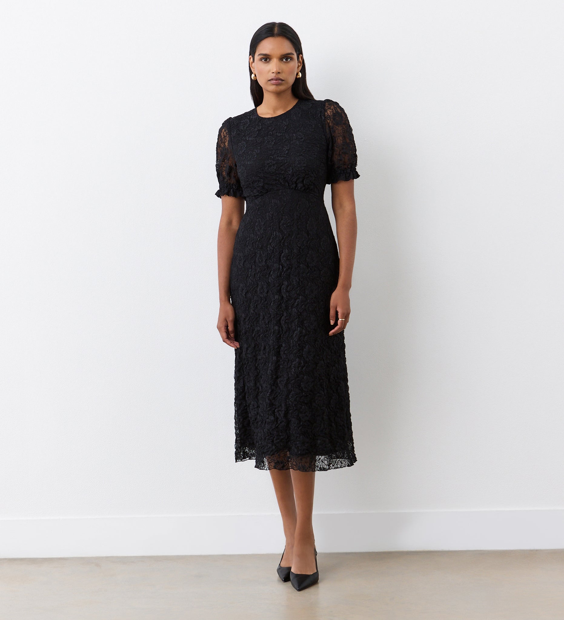 Crafted from lace fabric, Mela is a midi dress that will see you through any occasion. With an elegant round neckline and empire line waist seam, this dress provides just the right amount of coverage. We love the short sleeves with elasticated cuffs and ruffle detail and the easy-to-dress rear keyhole fastening.