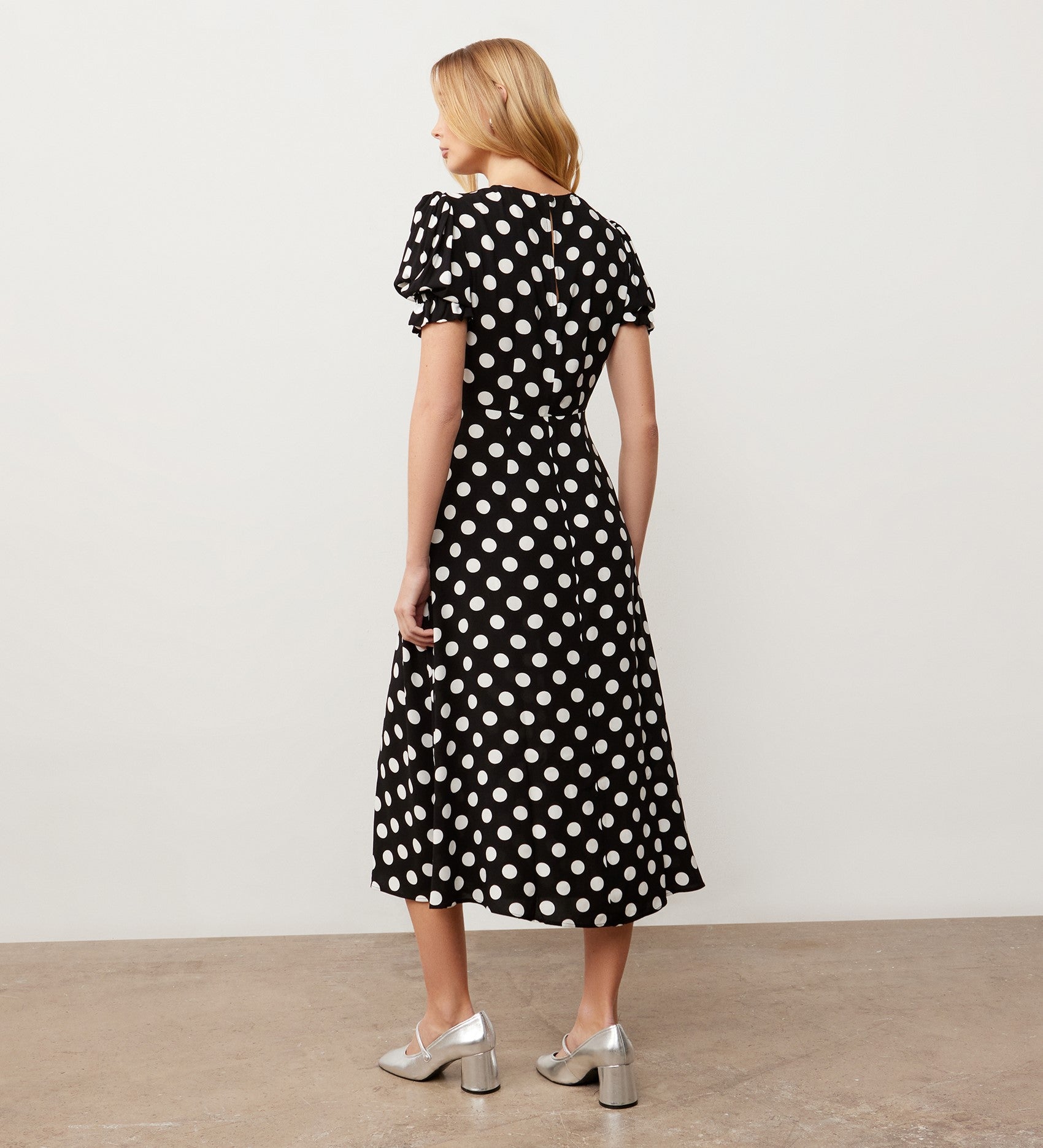 A classic abstract print on our signature viscose, Mela is a midi dress that will see you through any occasion. With an elegant round neckline and empire line waist seam, this dress provides just the right amount of coverage. We love the short sleeves with elasticated cuffs and ruffle detail and the easy-to-dress rear keyhole fastening.