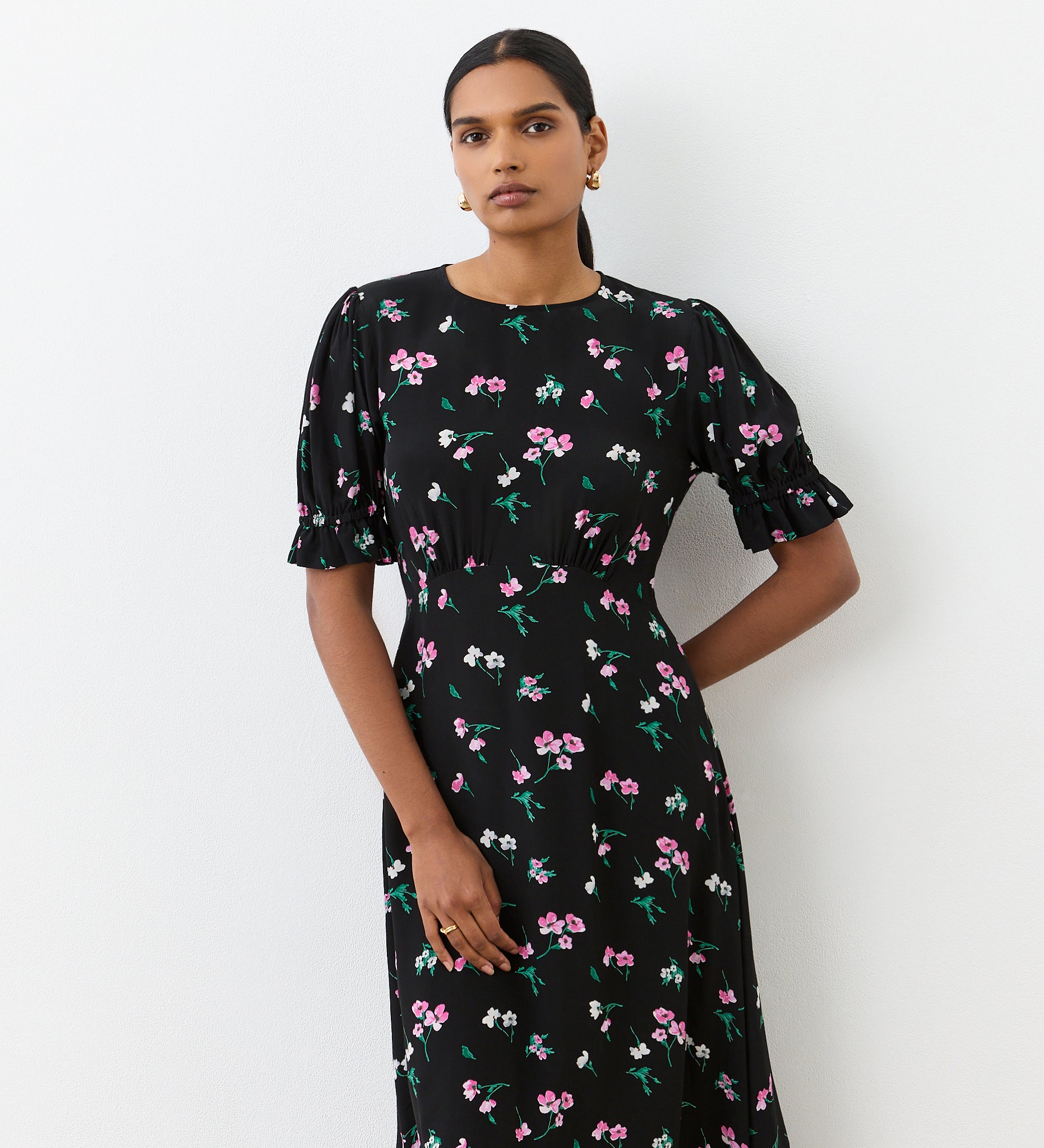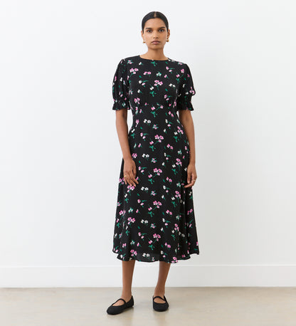 A classic black floral print on our signature viscose, Mela is a midi dress that will see you through any occasion. With an elegant round neckline and empire line waist seam, this dress provides just the right amount of coverage. We love the short sleeves with elasticated cuffs and ruffle detail and the easy-to-dress rear keyhole fastening.