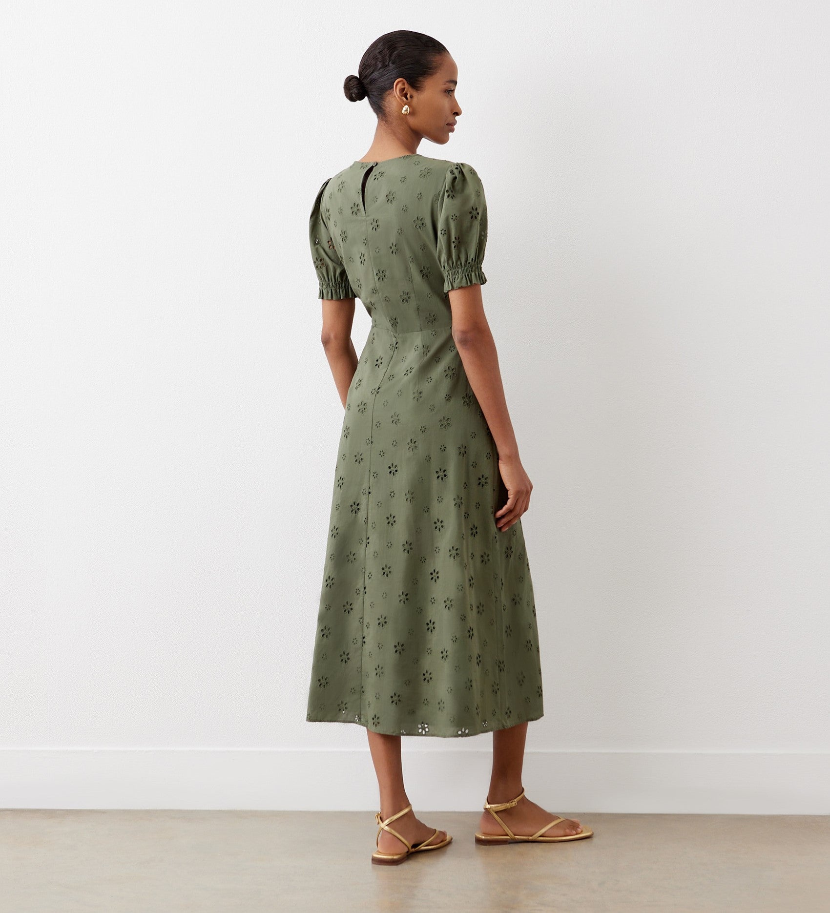 Mela Khaki Broderie Anglaise Cotton Midi Dress
