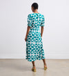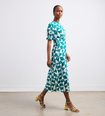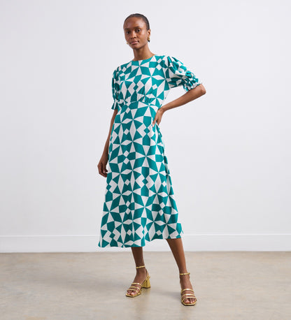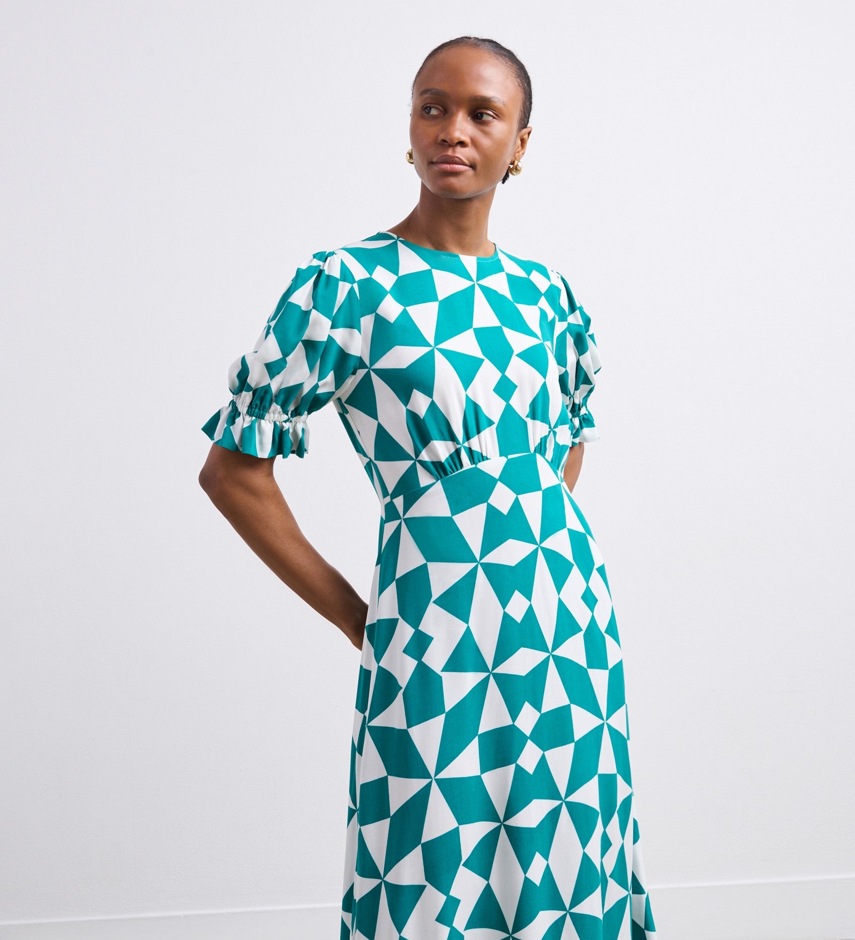 A classic geo print on our signature viscose, Mela is a midi dress that will see you through any occasion. With an elegant round neckline and empire line waist seam, this dress provides just the right amount of coverage. We love the short sleeves with elasticated cuffs and ruffle detail and the easy-to-dress rear keyhole fastening.