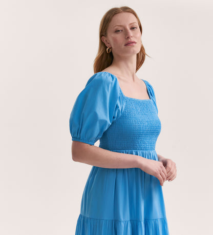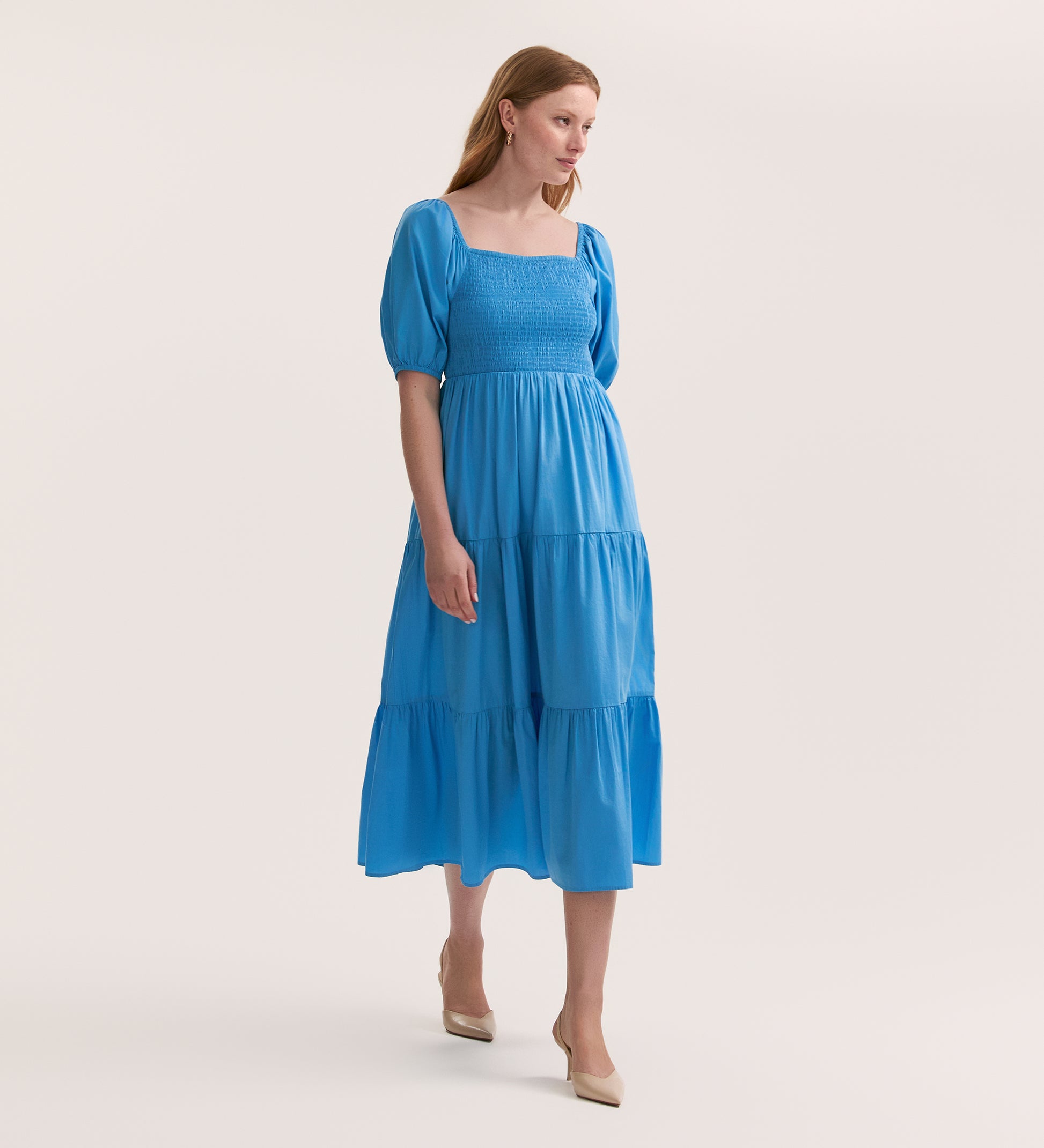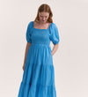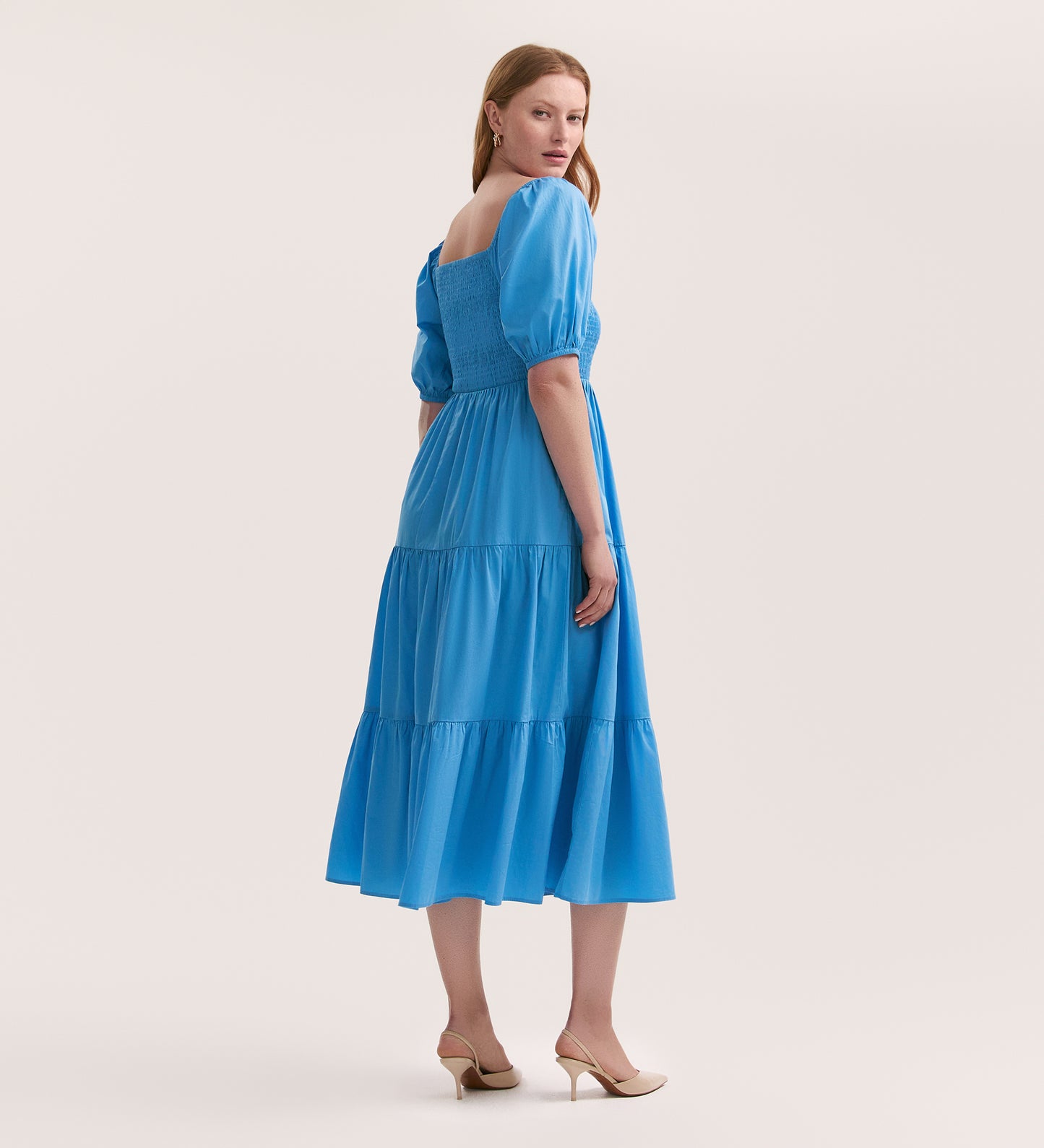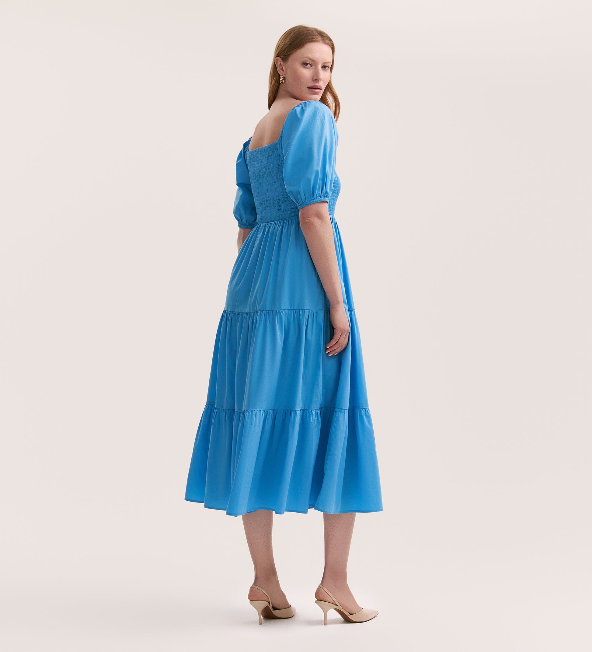 With a figure-flattering shirred bodice, Melody is a light blue tiered midi dress with pockets. Crafted from cotton, she features a tiered skirt, square neck and elbow-length puff sleeves with elasticated cuffs to enhance the fit and flare style.