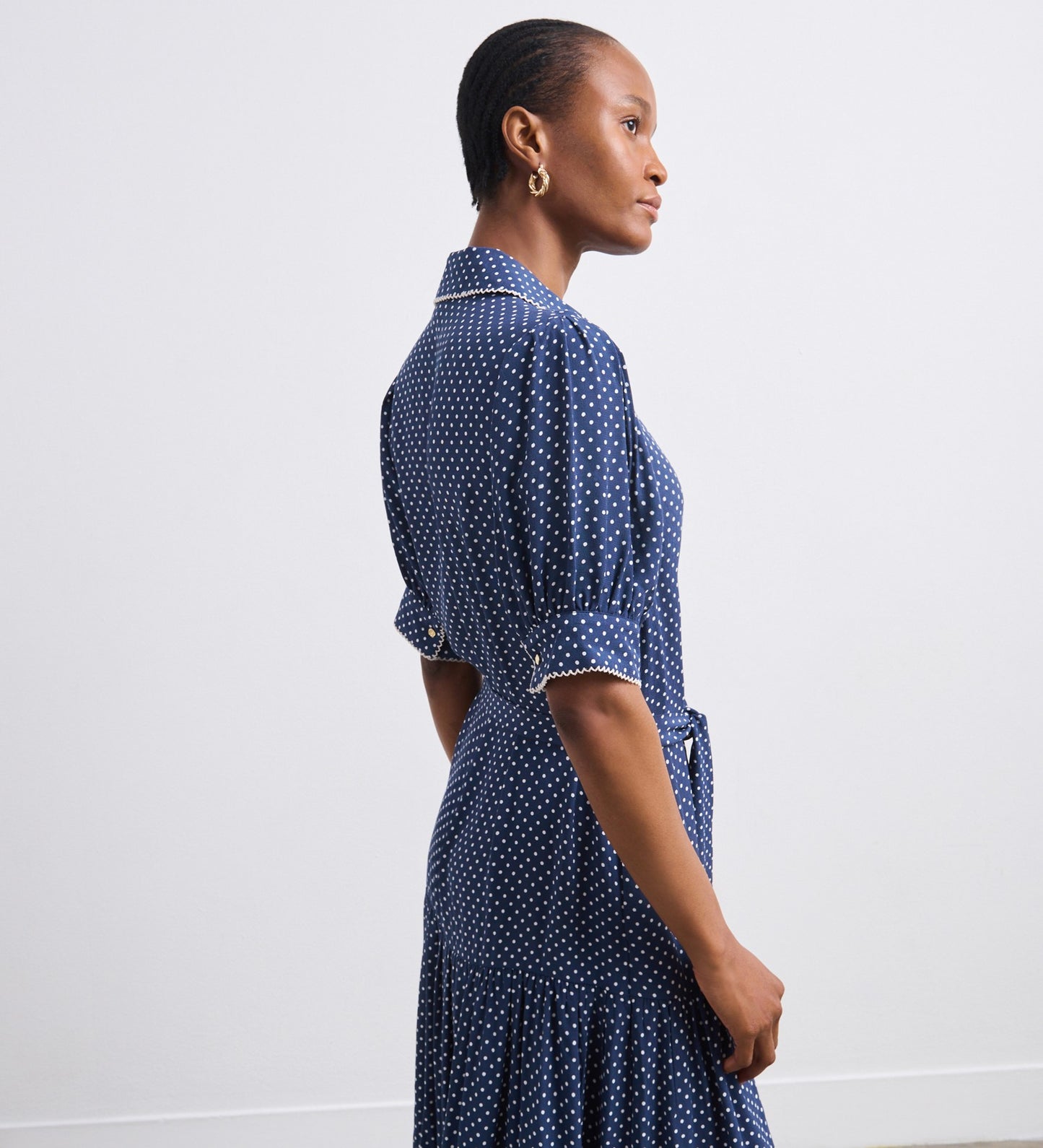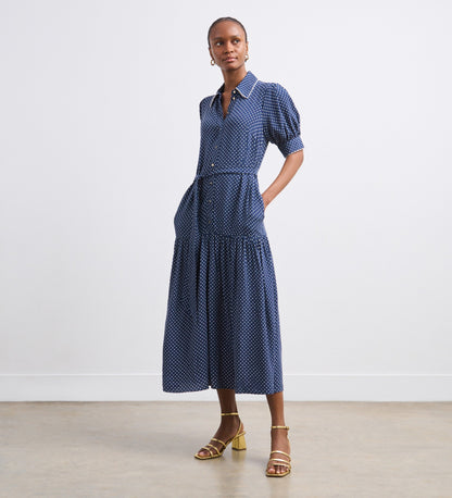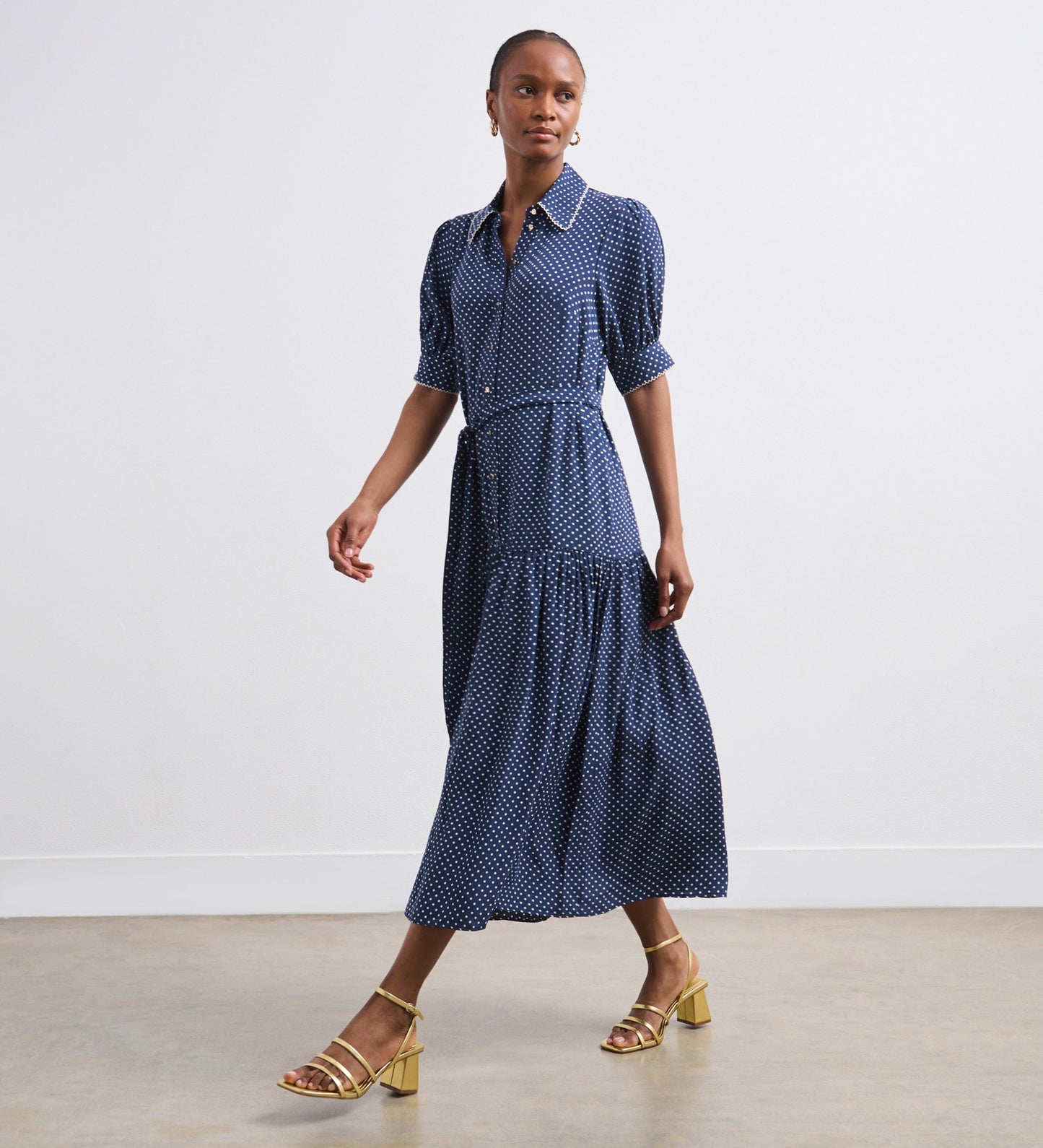 Michelle is a midi shirt dress with a tiered skirt and delicate scallop trim detail on both the collar and cuffs. We love the hammered gold buttons that adorn the front as well as the flattering dropped waist and detachable tie belt.