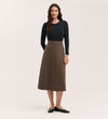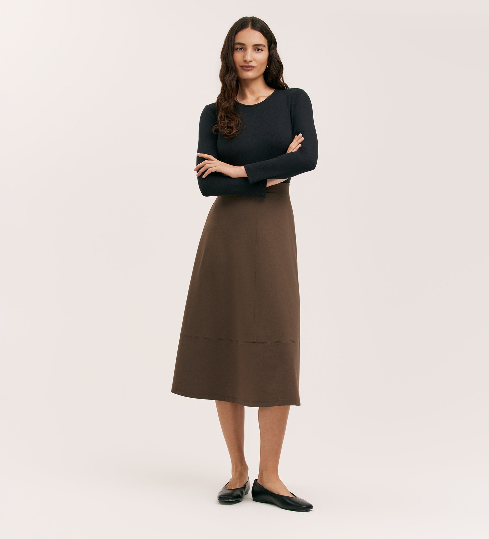 Designed with an elasticated waistband, Mikia is a versatile midi skirt that offers all-day comfort while skimming the waist for a flattering fit. Paneled construction adds subtle shape, while the soft jersey fabric ensures a fluid drape that moves beautifully with every step. A timeless wardrobe staple, Mikia pairs effortlessly with both casual tops and more refined layers.