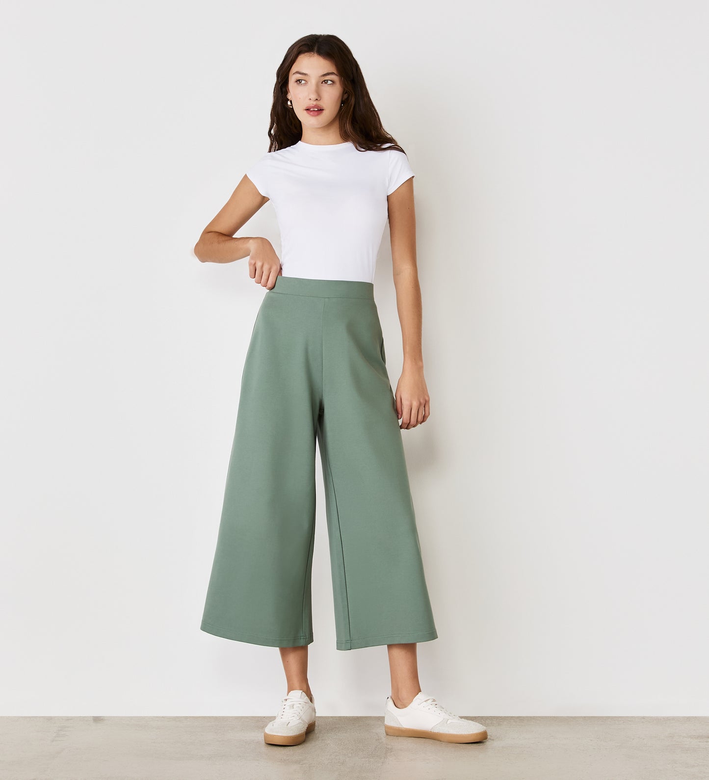 Cropped in length, we love our versatile Miribel light khaki wide-leg cropped trousers. High waisted and made of comfortable ponte jersey, she's a flattering fit you can style easily with an array of tops, shirts or blouses.