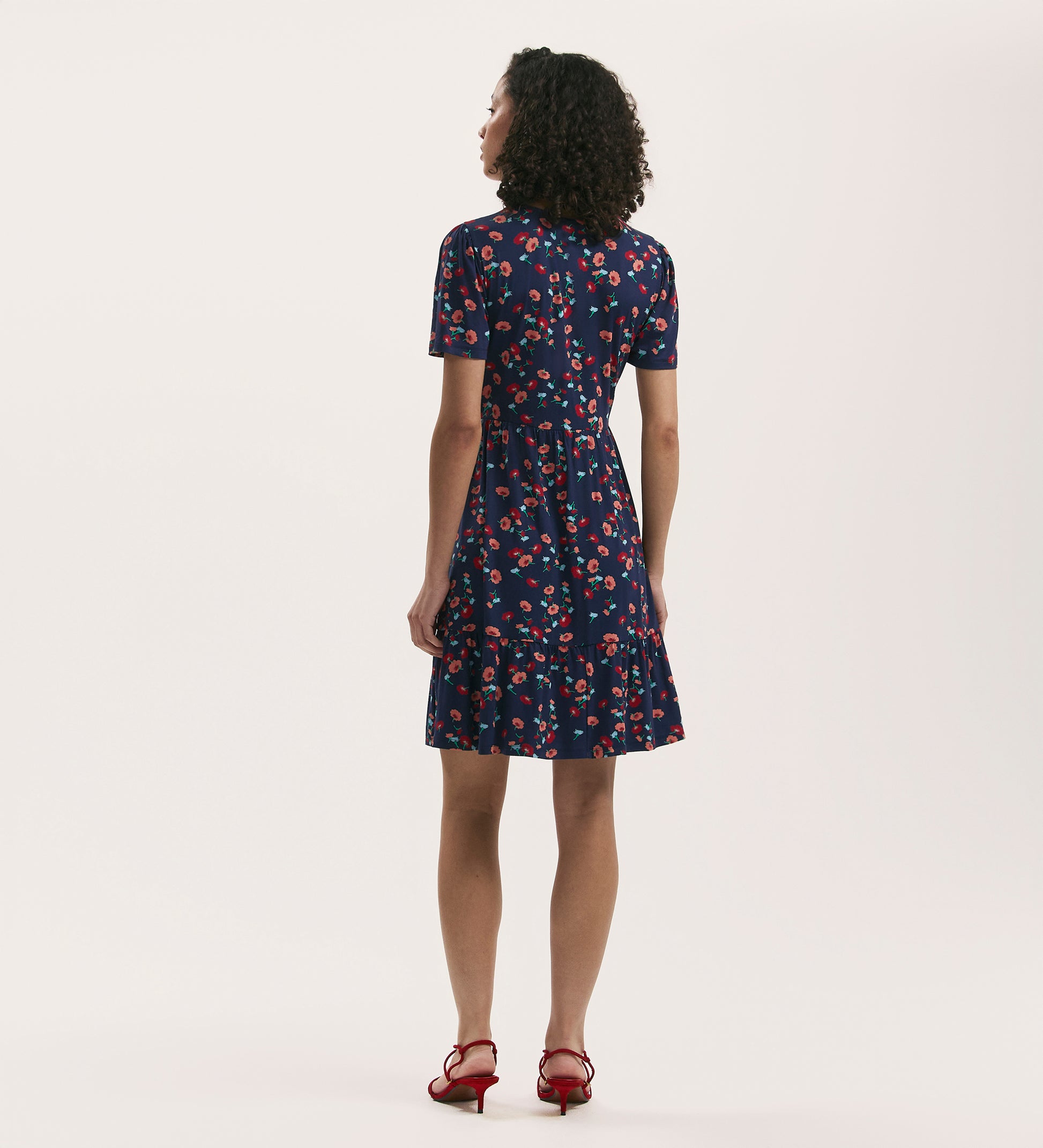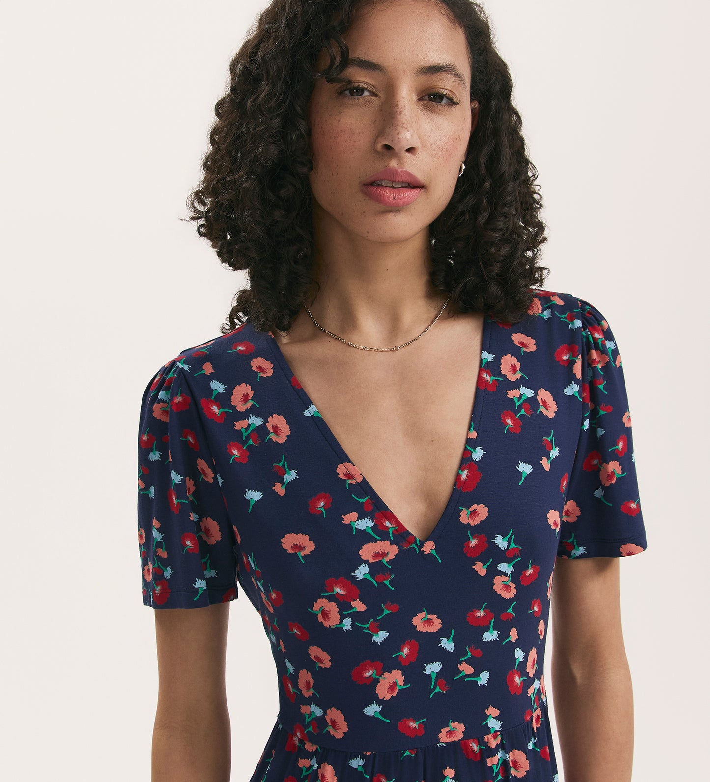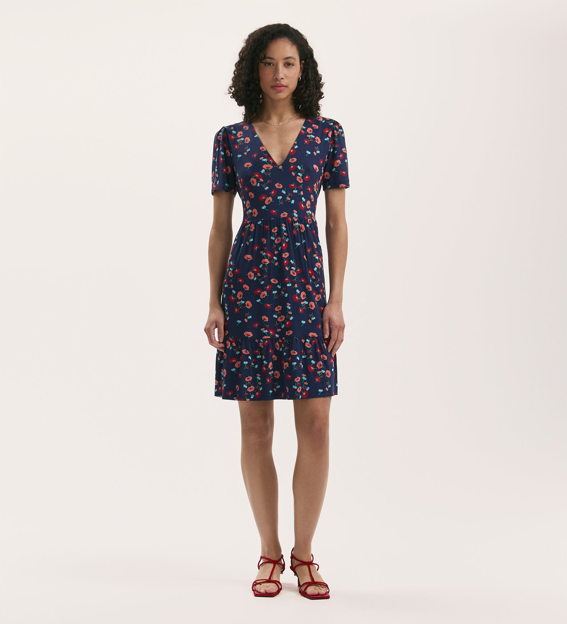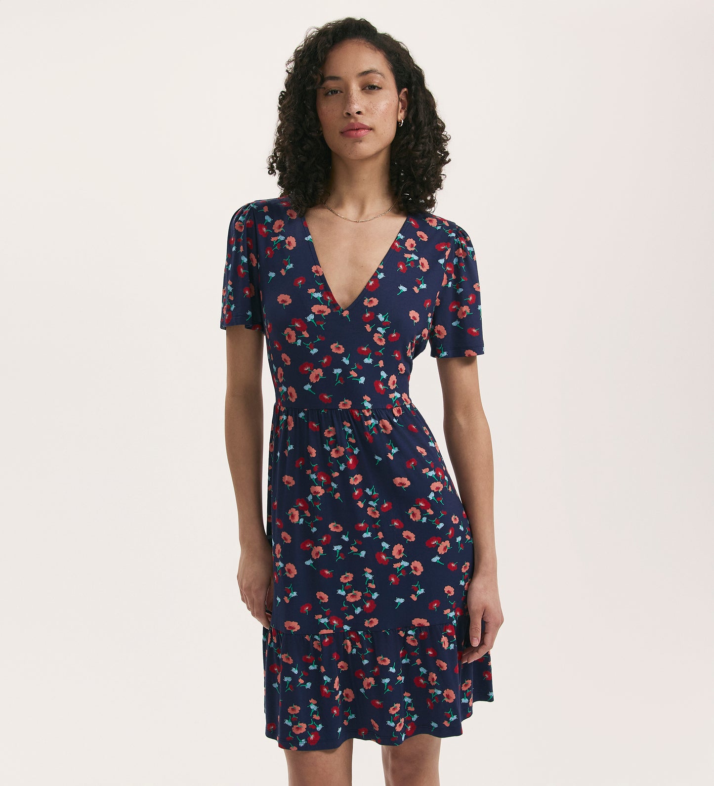 Crafted from our jersey fabric, Misha is a navy floral short v-neck dress with a tiered skirt and short sleeves. Her waist offers a figure-flattering fit.