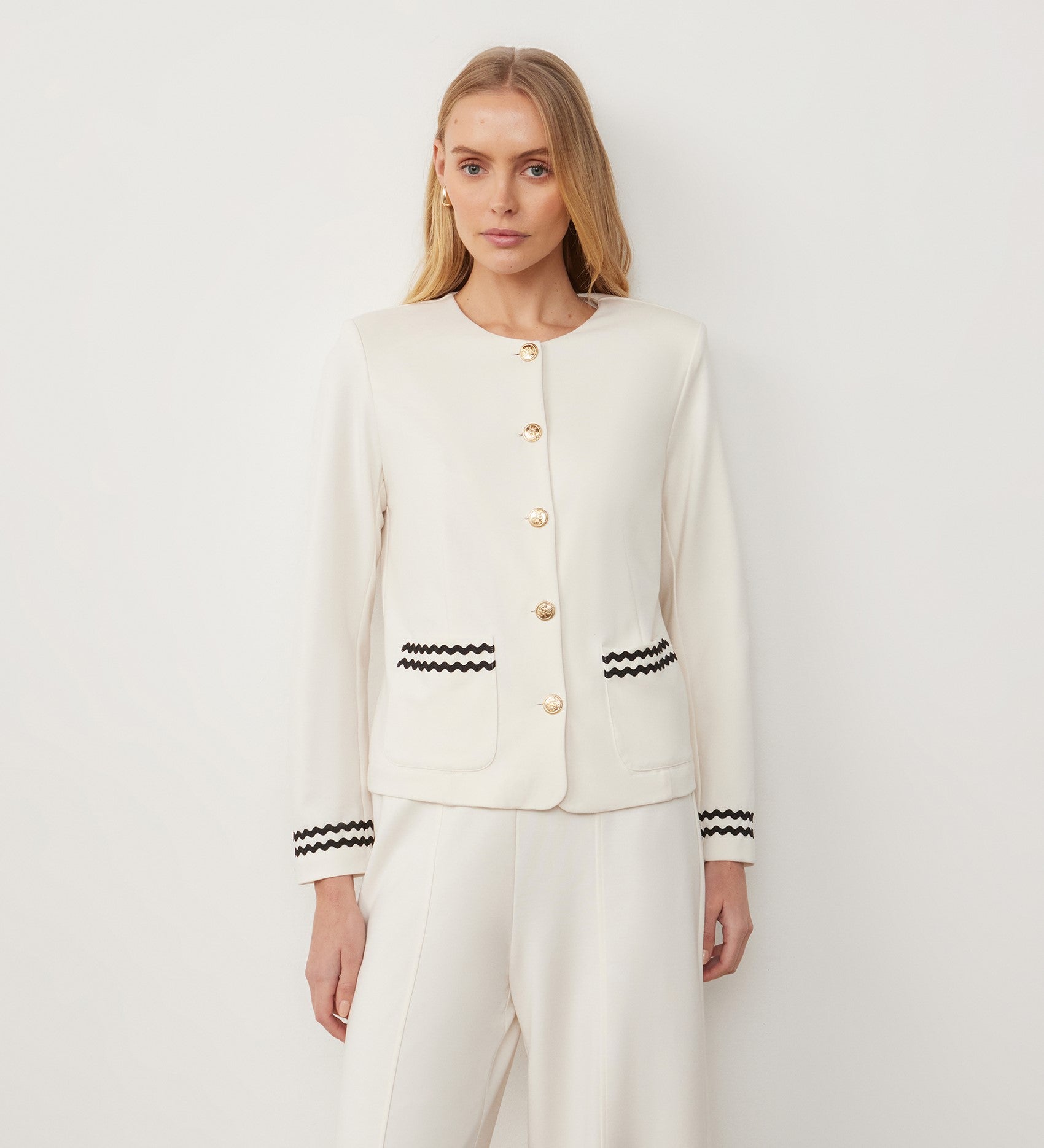Crafted from Ponte jersey, Molly is a stylish jacket that features ric rac detailing on the front pockets and cuffs, plus eye-catching gold front buttons and a round neckline.