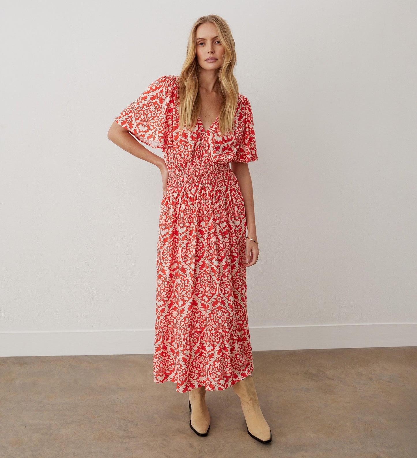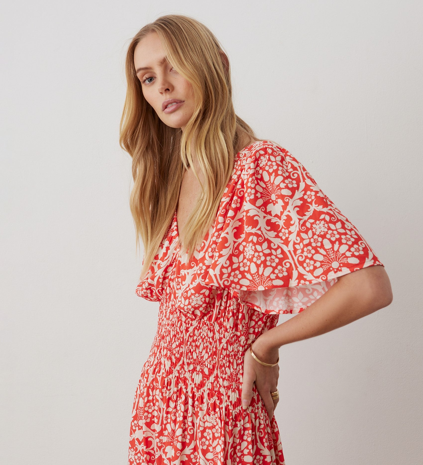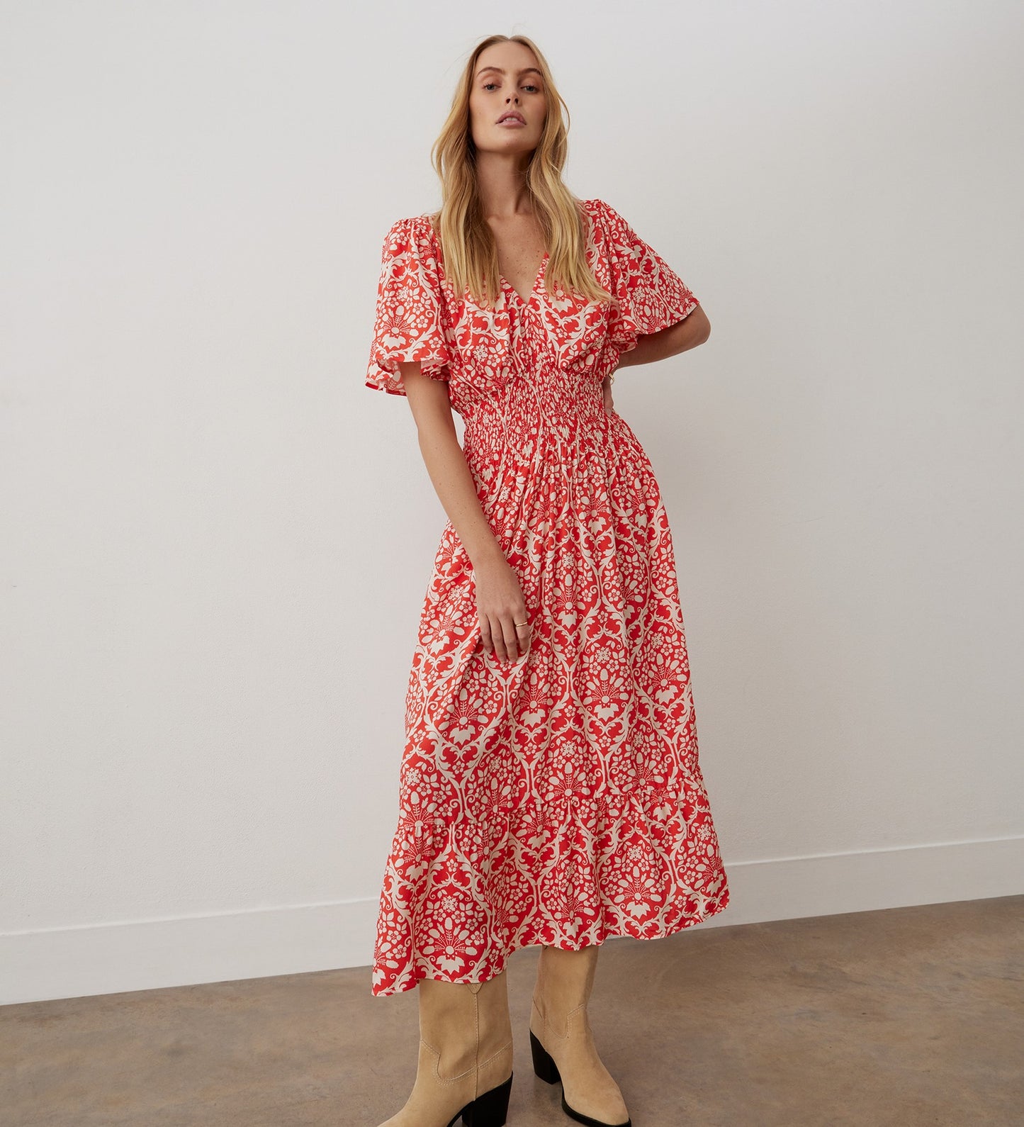Comfort is as important as style when it comes to Nessa. This floral midi dress features short angel sleeves and a tiered hemline that adds movement, while an elasticated V-neckline and shirred empire line waist band hugs and flatters the figure in all the right places.