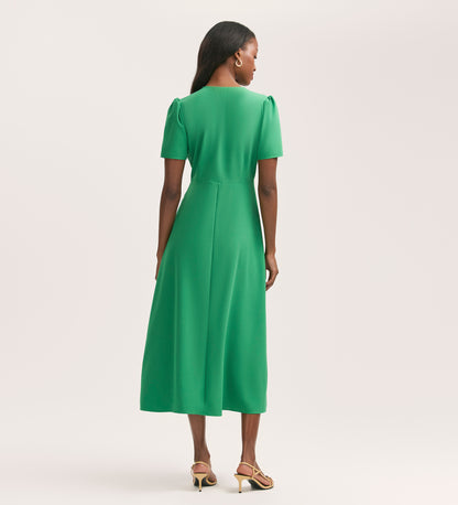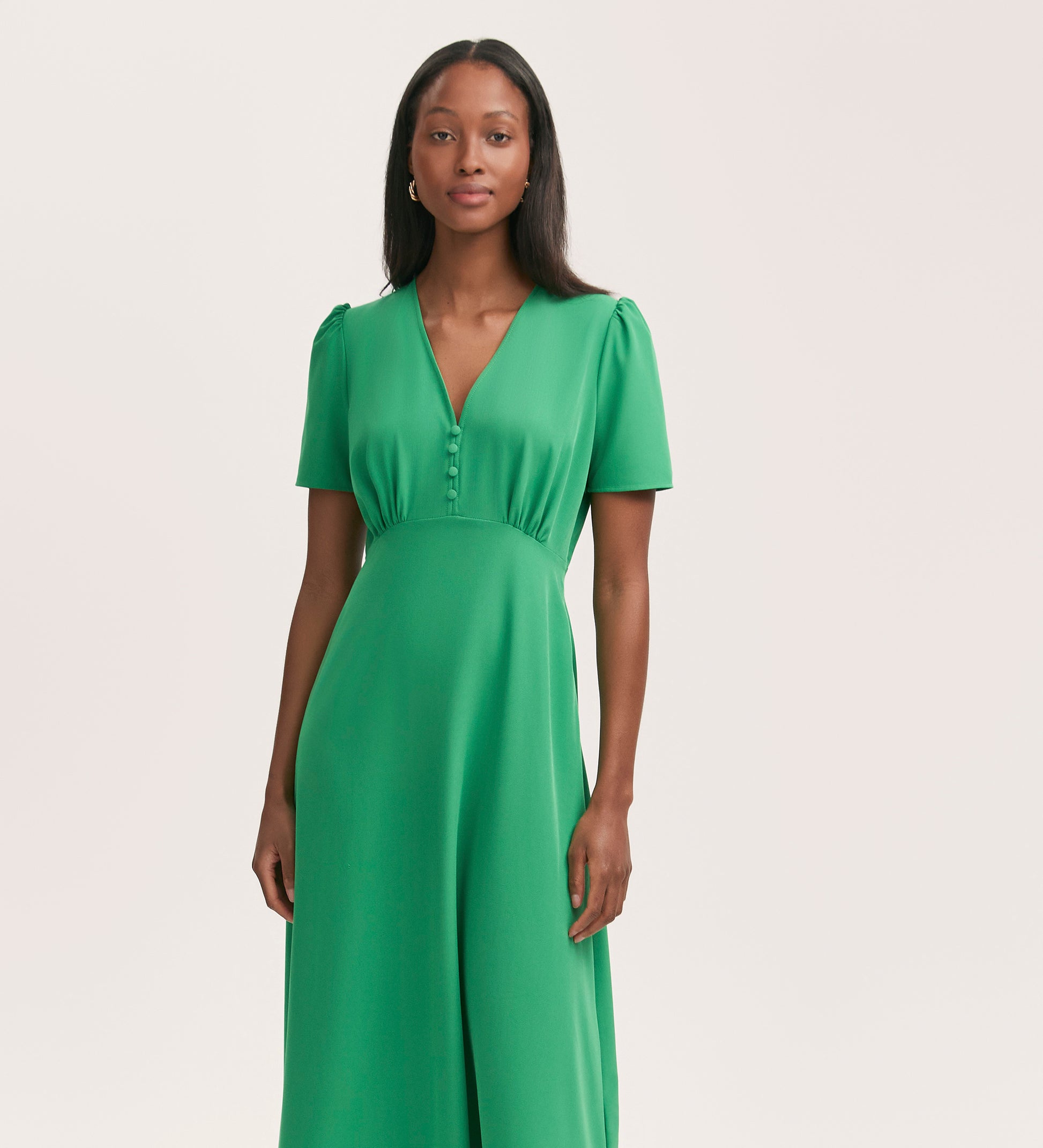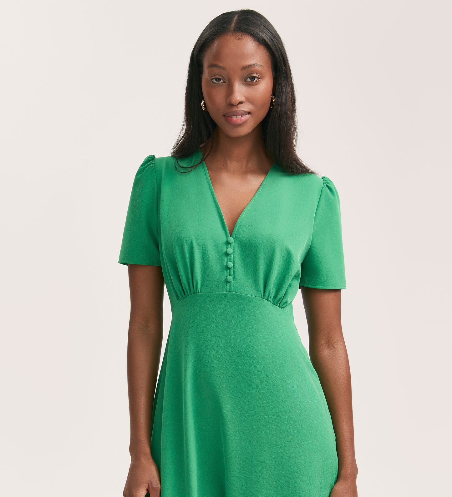 Promoting a flattering fit that enhances the silhouette, Nieve is a green v-neck midi tea dress crafted from crease-free crepe fabric. She features short sleeves and button detailing on the neckline, as well as a waist seam and gathering at the bust.