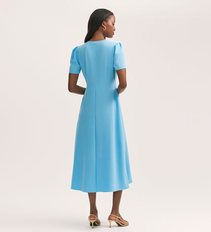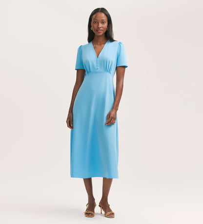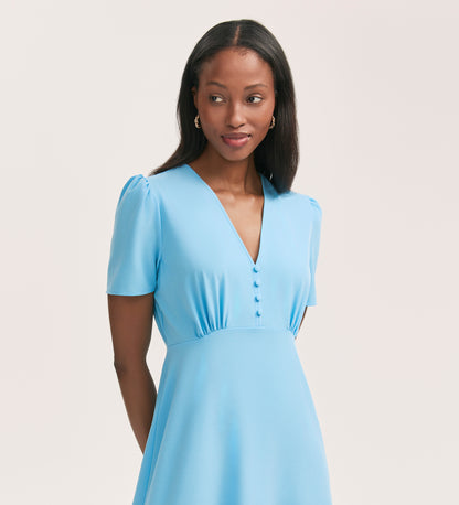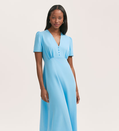 Promoting a flattering fit that enhances the silhouette, Nieve is a light blue v-neck midi tea dress crafted from crease-free crepe fabric. She features short sleeves and button detailing on the neckline, as well as a waist seam and gathering at the bust.