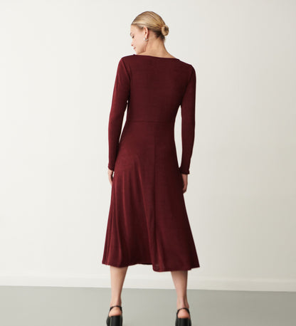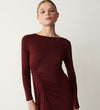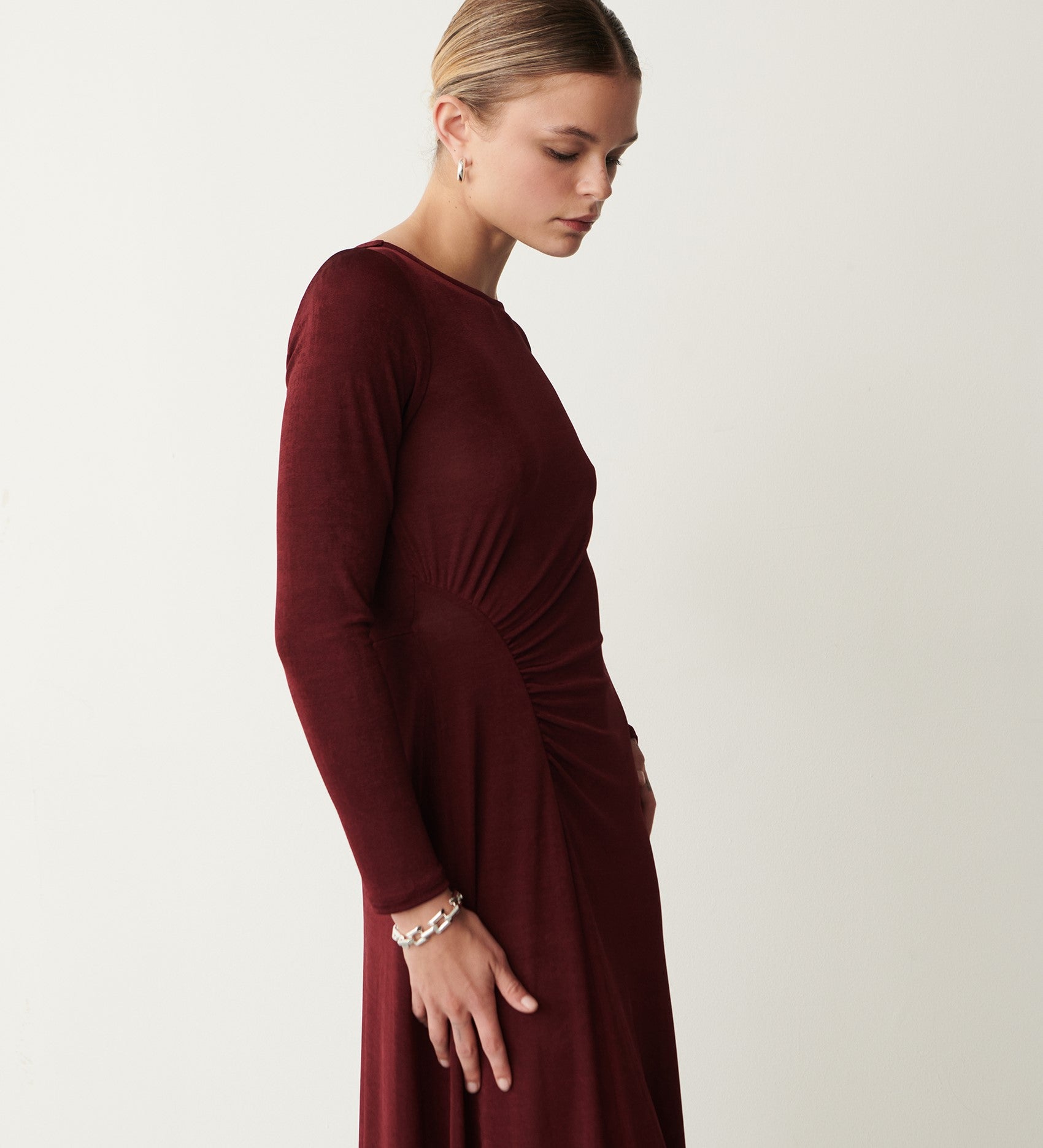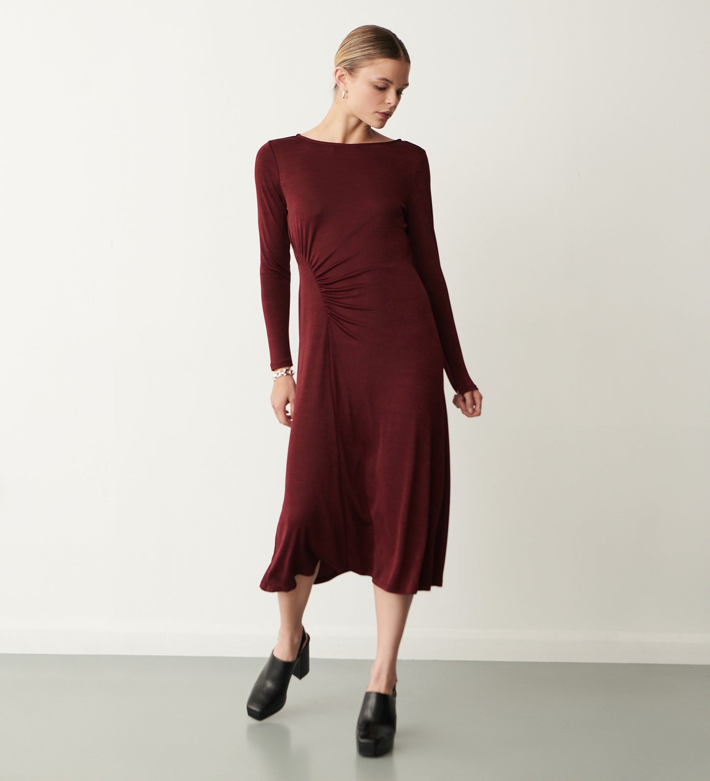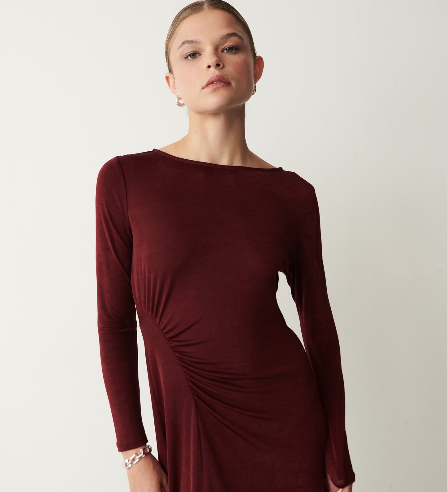 The Nyra dress is a midi length, A-line silhouette in stretch jersey fabric. With ruched detailing on gathered seams at the side of the body to create a gently draped effect. It has long sleeves and a wide neckline. With a slight shine to the material perfect for party season.