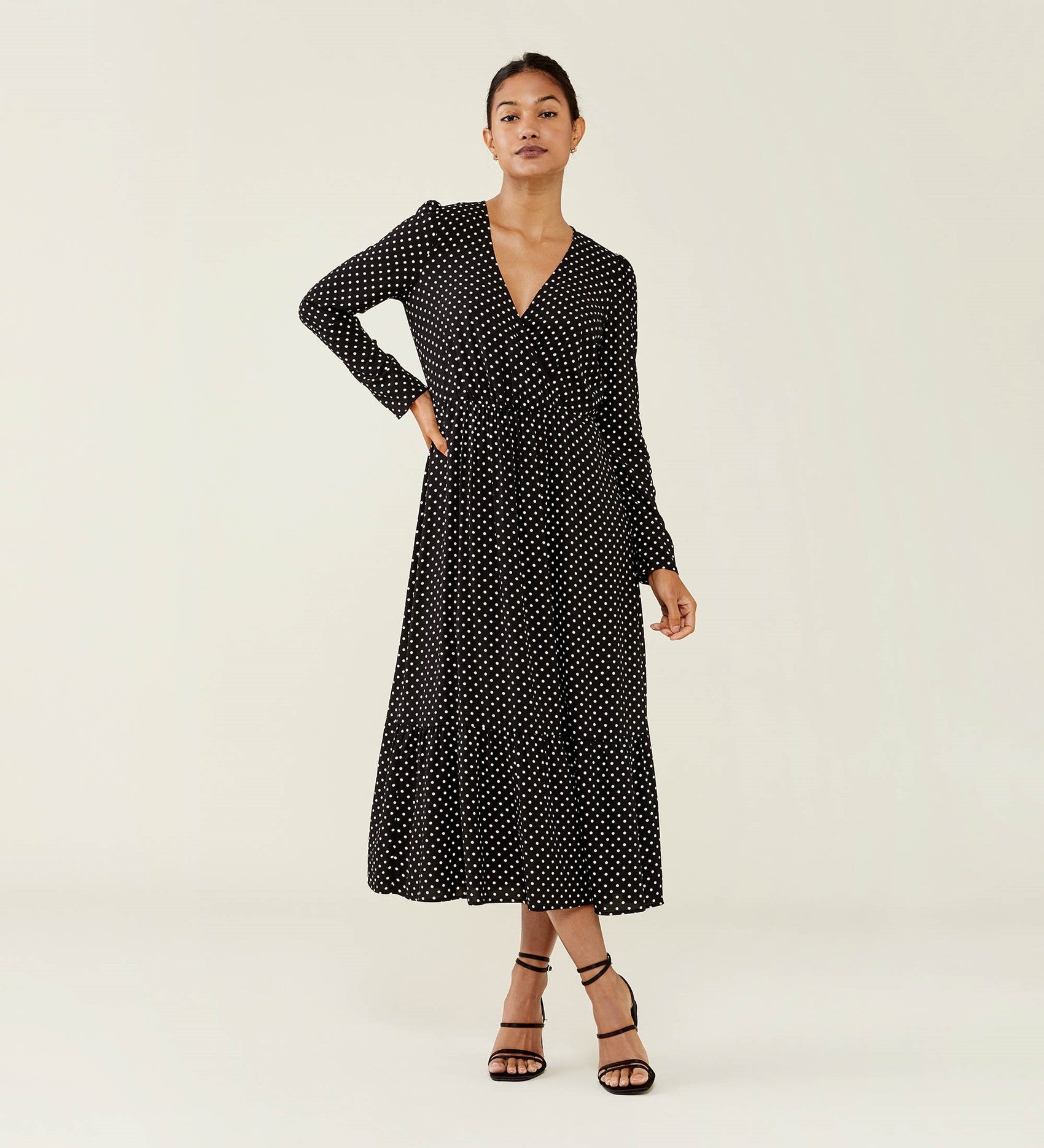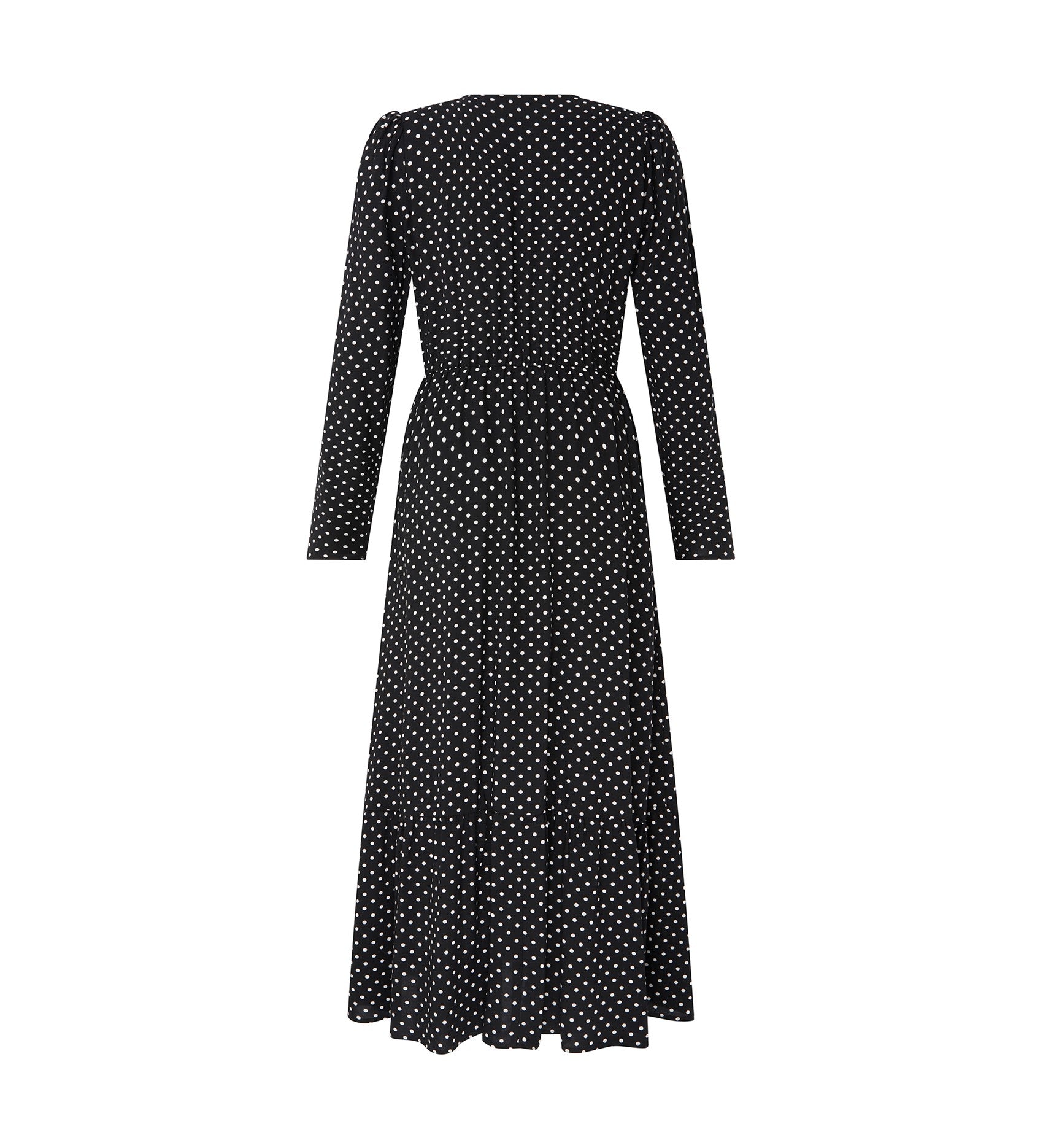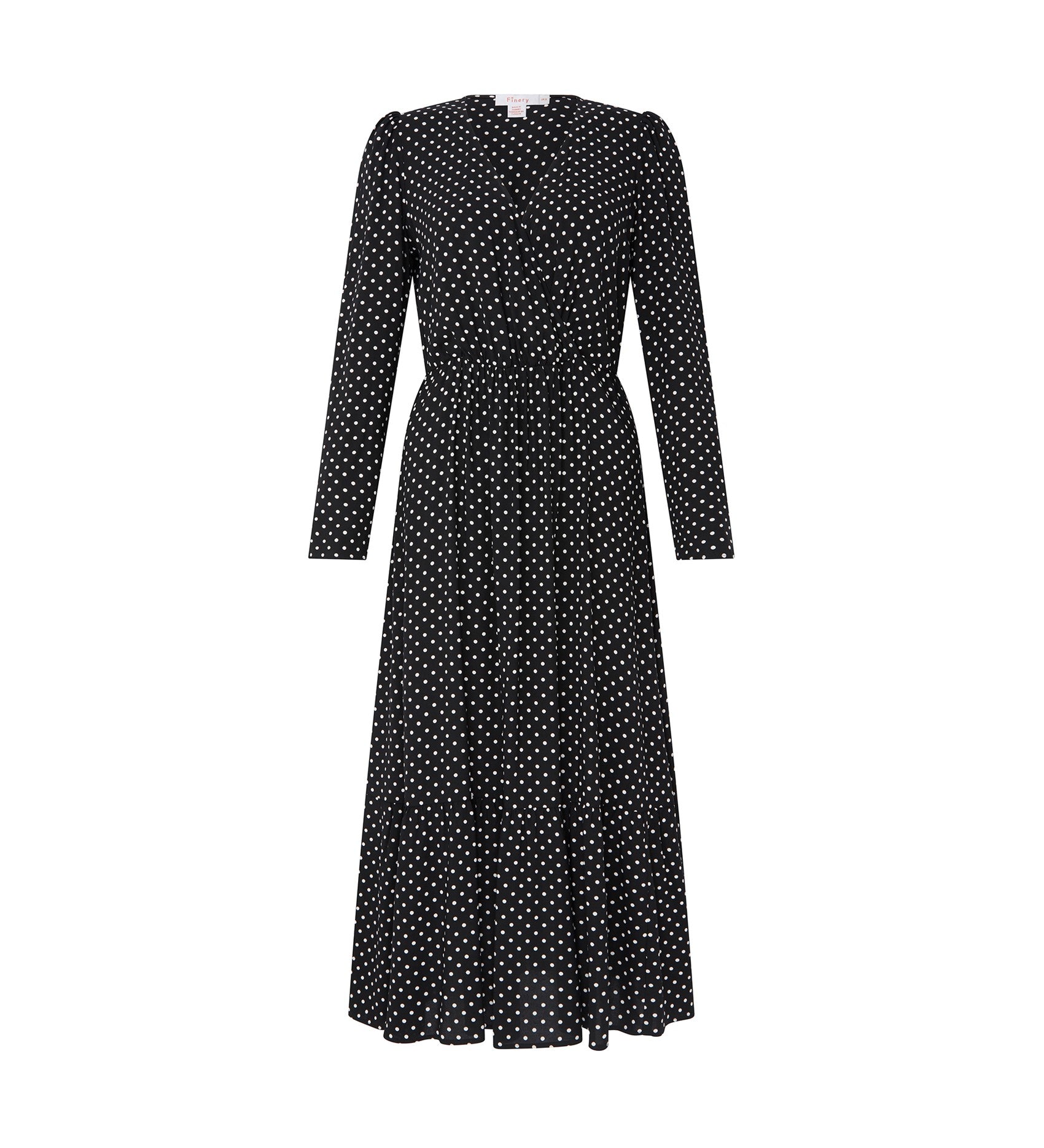 Mock wrap in style, our Olesia midi dress is a polka dot classic. A tired hem skirt provides movement, while the elasticated waist flatters the figure beautifully. Dress Olesia up with heels and a clutch bag or down with a leather jacket and boots.