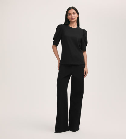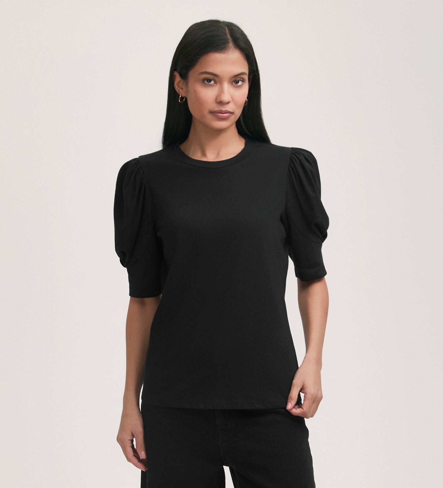 A black crew-neck t-shirt crafted from our signature jersey fabric, Oriel features short sleeves with gathering detail. Flattering and versatile, she’s the perfect essential for your everyday wardrobe. Classic and crisp, this true white shade offers a fresh, timeless appeal.